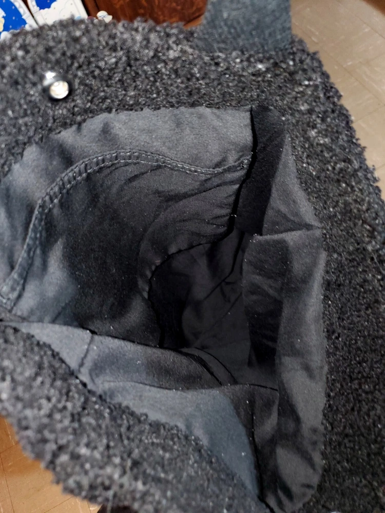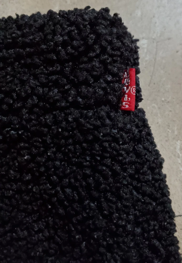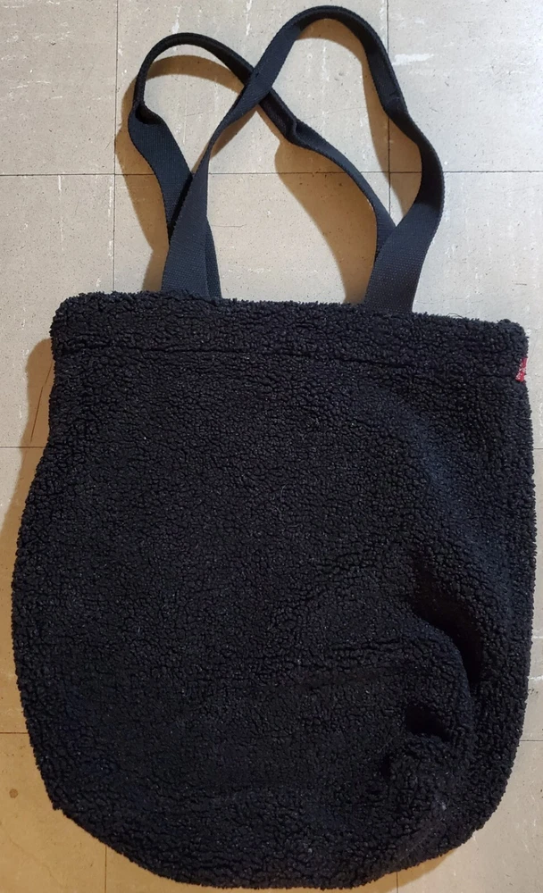 This is a large black Sherpa tote bag by Levis, featuring a button closure and double nylon handles. The bag measures 16 inches in width, 15 inches in height, and 5 inches in depth. It is made of faux fur Sherpa fabric with a black nylon lining, accented with buttons and embroidery. The tote includes inner pockets and a pouch, suitable for various occasions including travel, parties, work, and more.