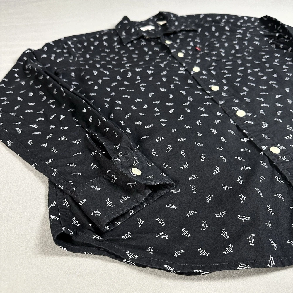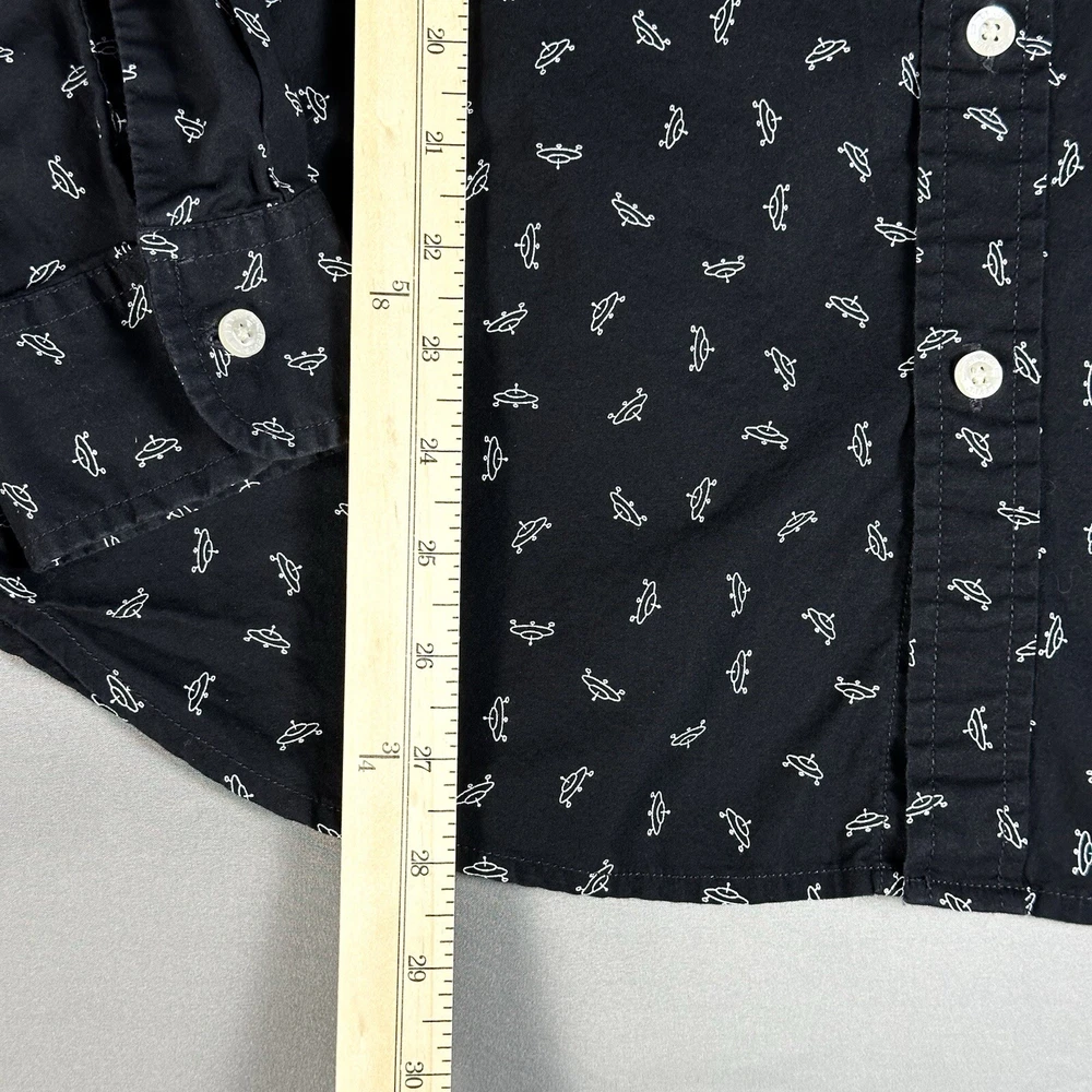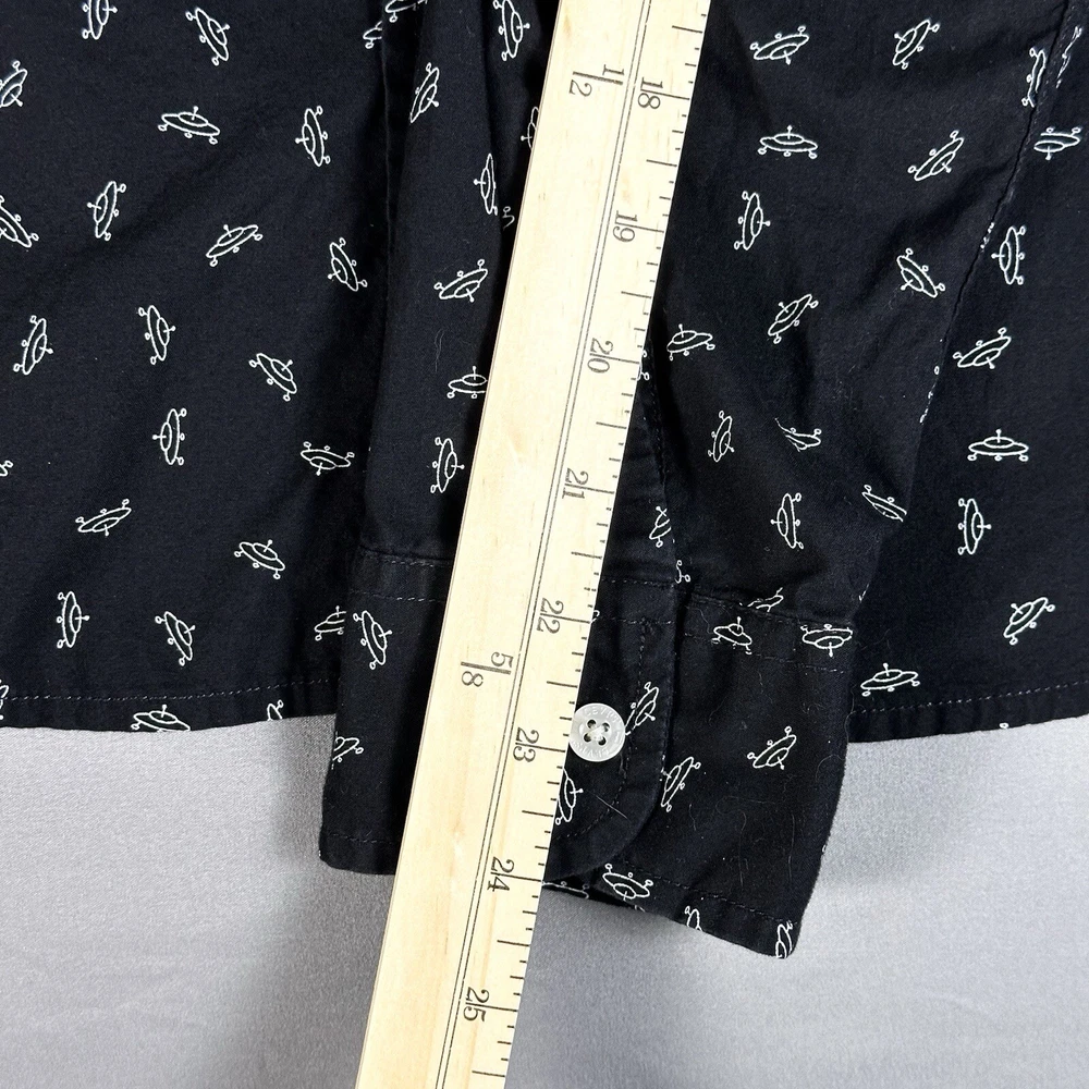 Featuring a graphic print of white flying saucers, this black button-up shirt is perfect for any casual occasion. Made of lightweight cotton fabric, it is machine washable and suitable for all seasons. Lay-Flat Measurements Length: 28” Chest: 20” Sleeve: 24” Shipping: All items are packed with care. I do use recycled packing and shipping materials whenever possible. If you have any issues with your purchase, please reach out as soon as possible. Clothing and accessories have a 30-day return window, returned in the same condition sent, with original tags and labels as applicable. Return shipping paid by buyer. Thank you for your business and let me know if you have any questions!