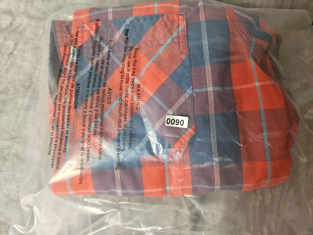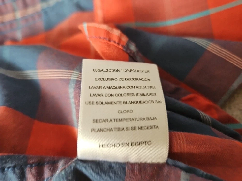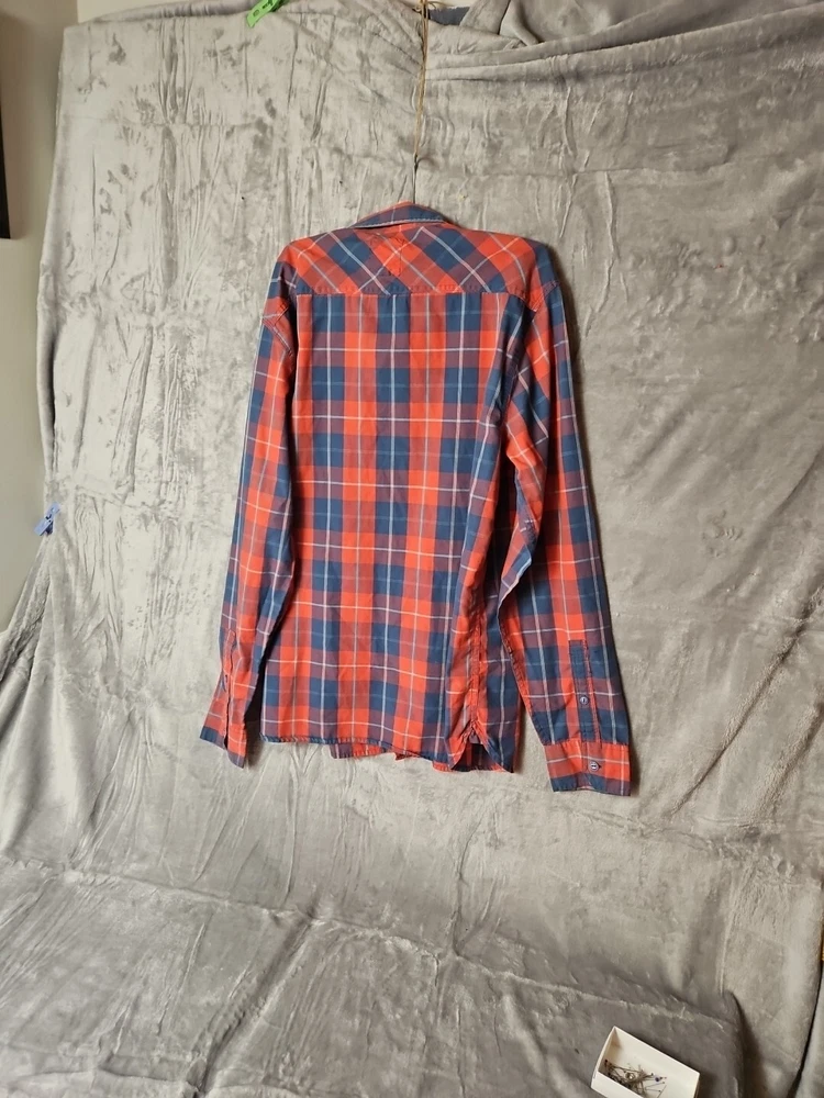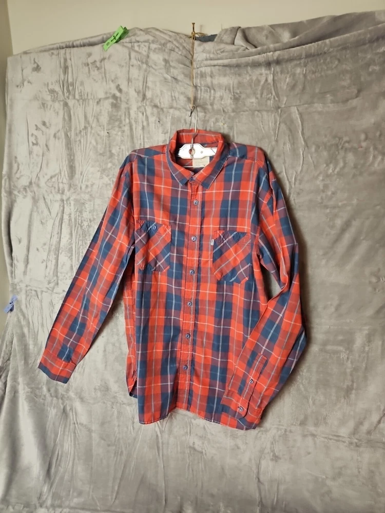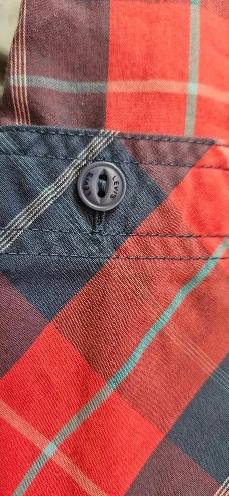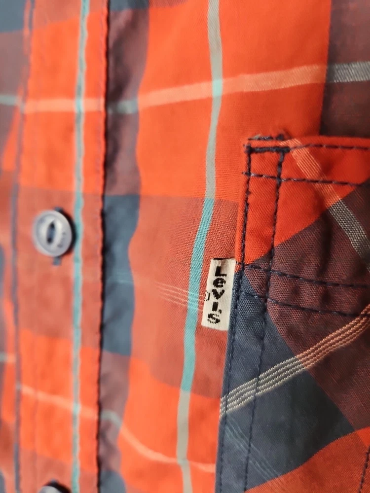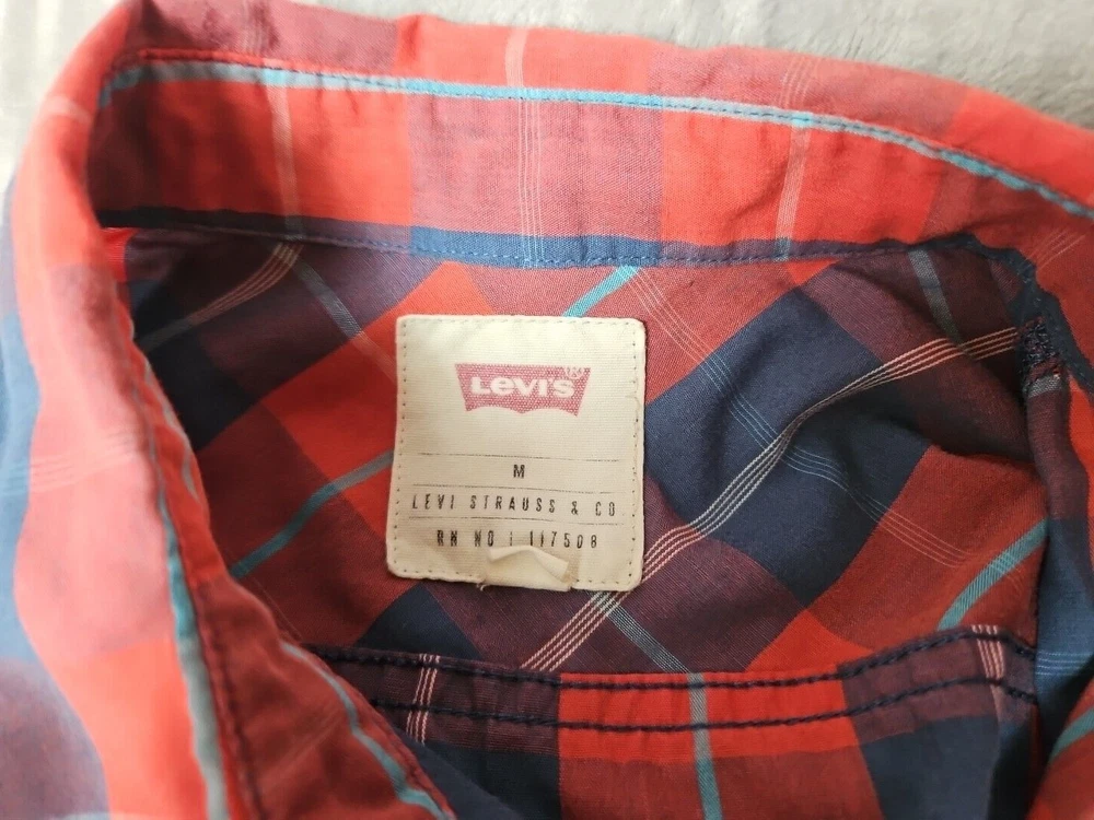 This is a vintage Levi's button-up shirt in size M, made in Egypt. The shirt features a plaid pattern with long sleeves, a collared neckline, and Levis buttons. It is crafted from a cotton/polyester blend fabric in a multicolor design. The shirt has a regular fit and includes pockets, making it suitable for travel, casual wear, and work attire. The Dad, 70s, classic, and 90s themes add a retro touch to the garment.