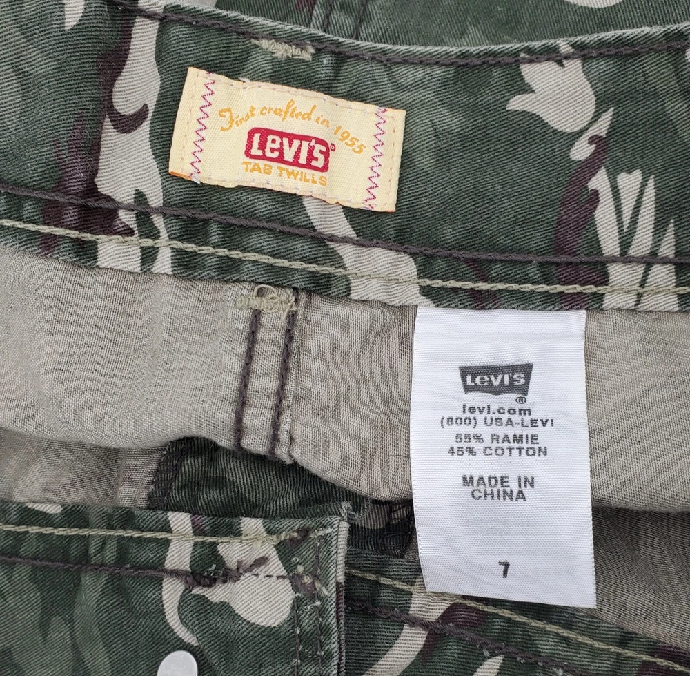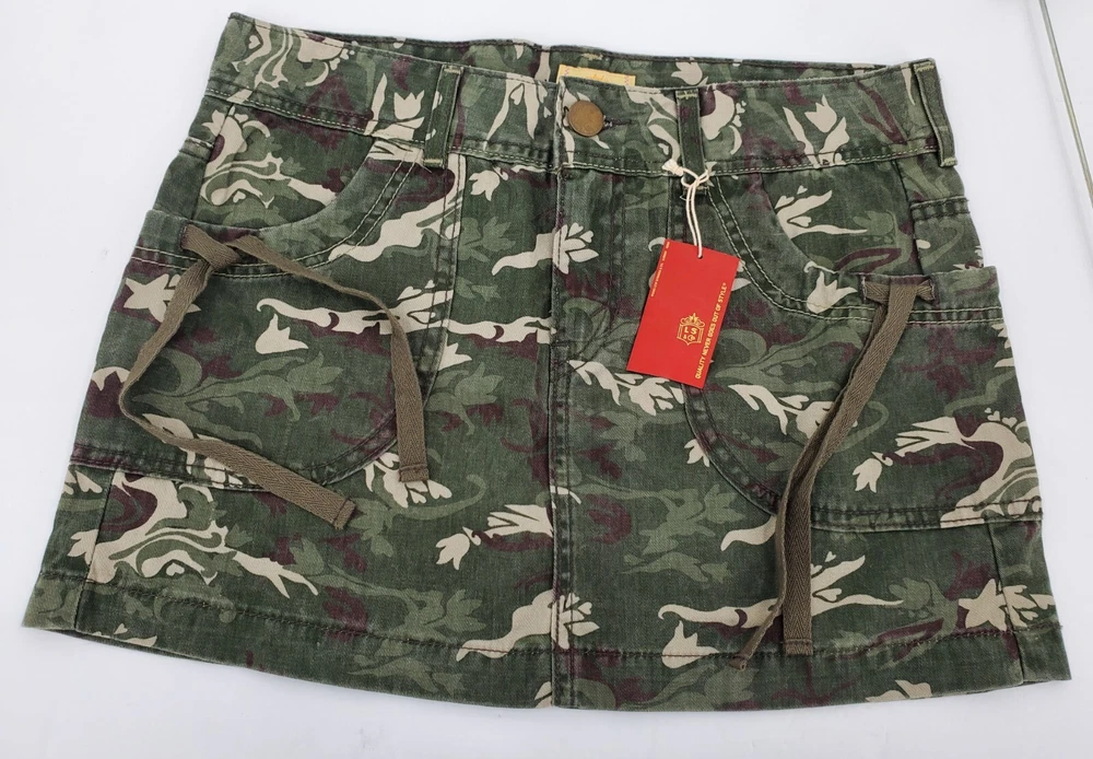Levi's Camo Tab Twills Denim Skirt Junior's Size 7 Brand New Cute. It has front pockets with ties, with an all over camo print and it's made of 55% ramie and 45% cotton. Please check measurements to ensure fit. The waist measurement is 31 inches and the length from the top to the bottom in the front is 13 inches. The tag on the back is disconnected at the top, but still attached at the bottom see the picture.