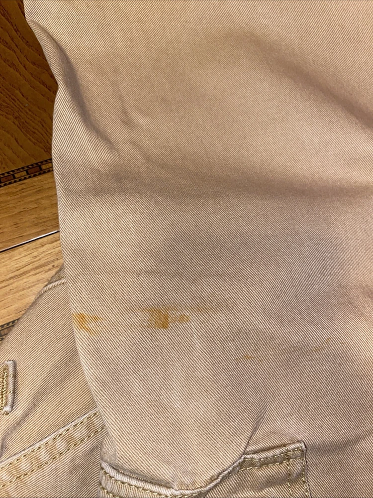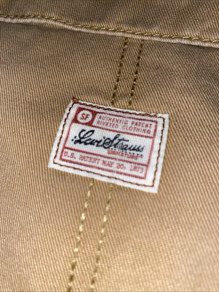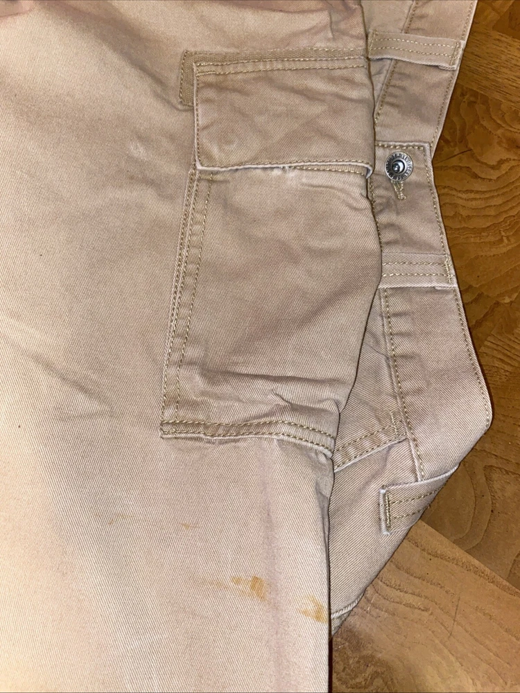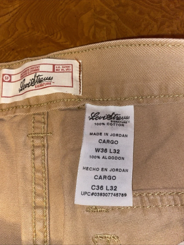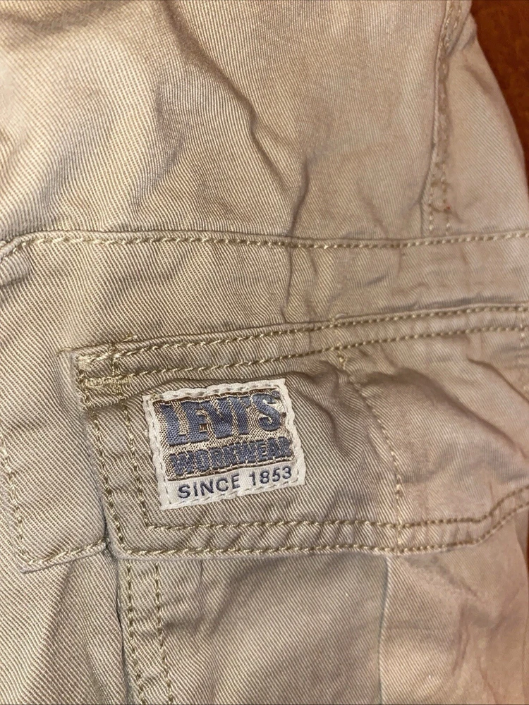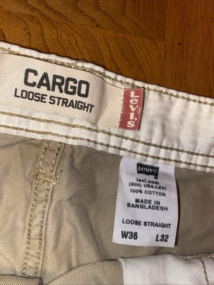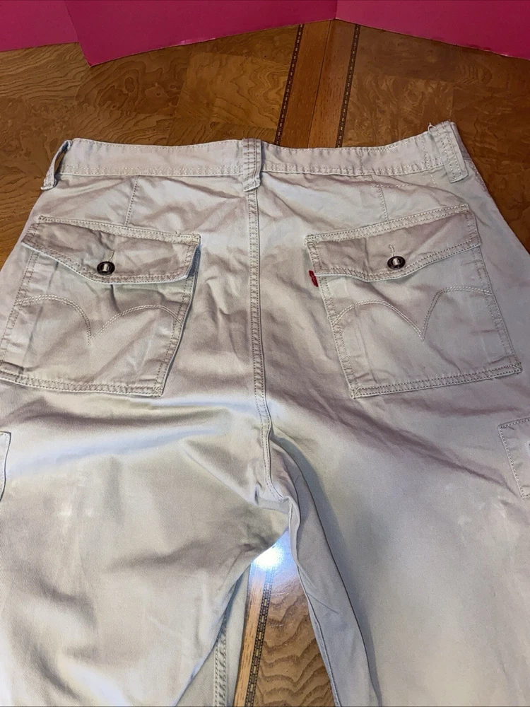 The Levi's Cargo 36/32 Pants are a pair of men's regular fit pants in a beige color. They feature a solid pattern and are made of cotton fabric, making them comfortable and machine washable for easy care. These pants have a zip closure and are designed with a cargo style, adding a practical and stylish touch to the classic Levi's brand. Perfect for casual wear, these pants offer both functionality and a trendy look for everyday use. See photos for flaws