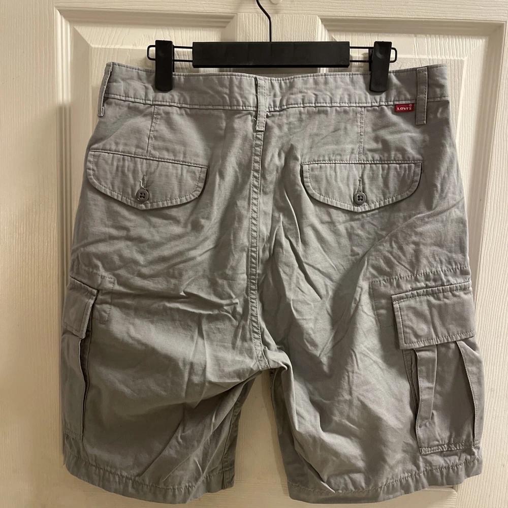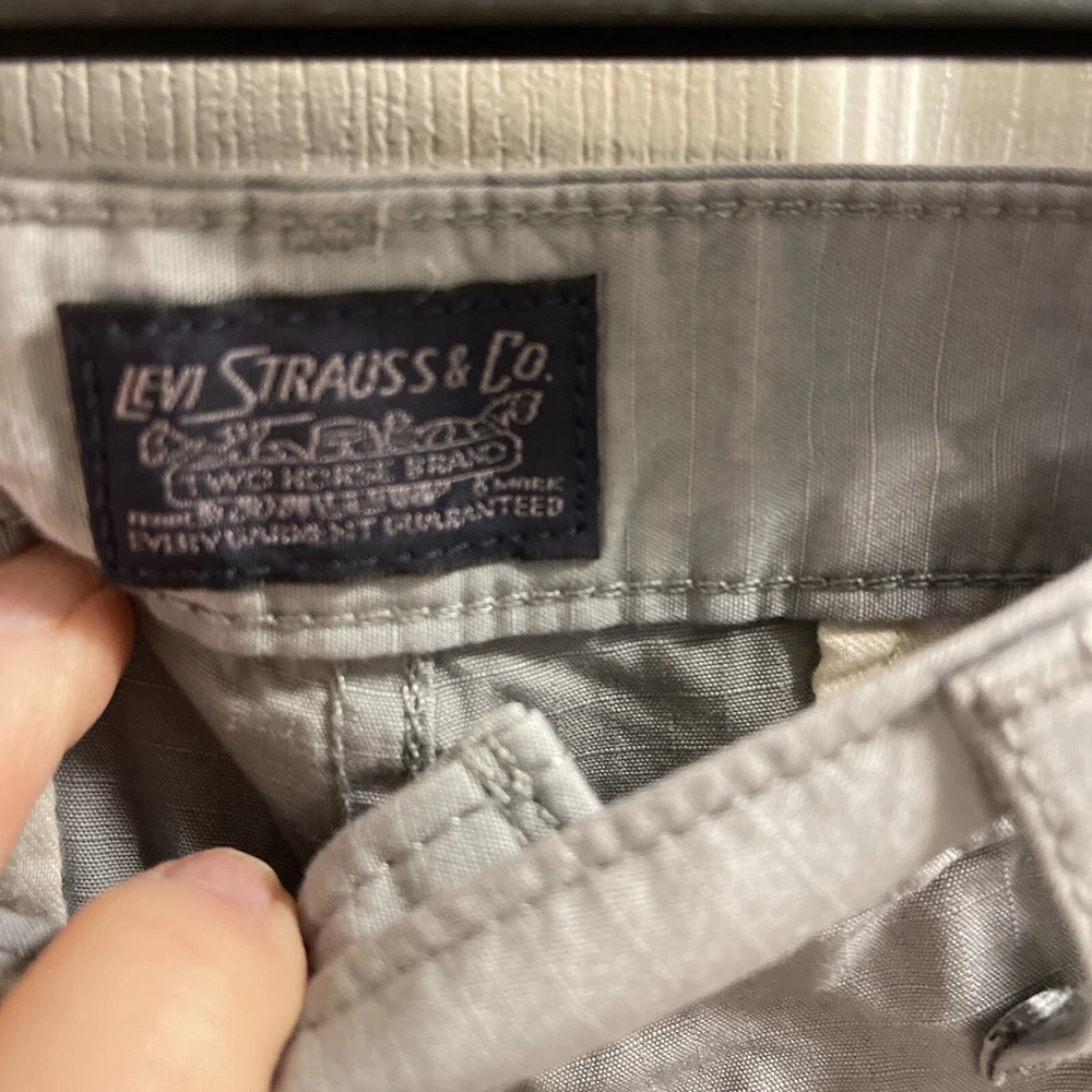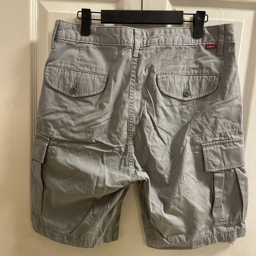 Levi's cargo shorts for men in size 34, featuring a solid green color and made of cotton. These casual shorts have a zip closure, flat front, and cargo pocket style with an inseam of 8 inches. The shorts are designed with a medium fabric wash and a regular fit, suitable for outdoor activities. The brand is Levi's, known for its quality and style.