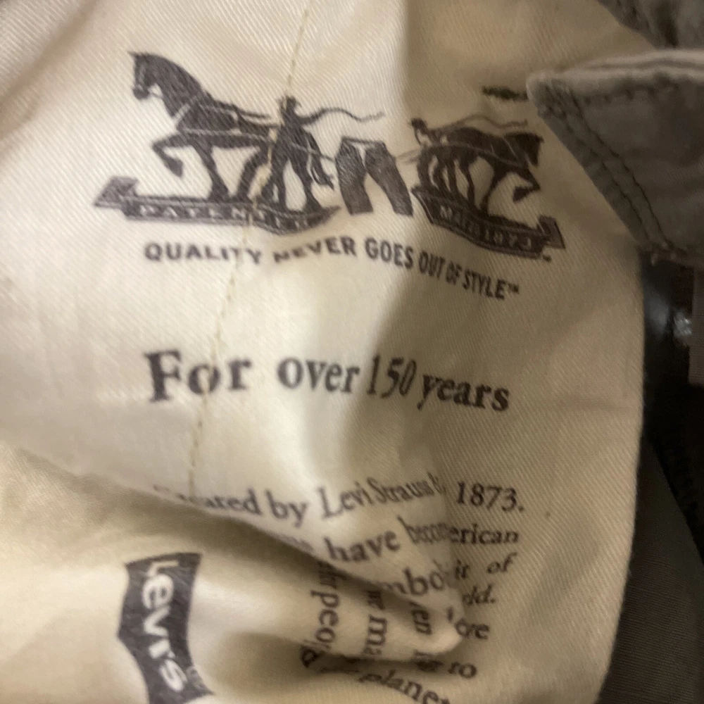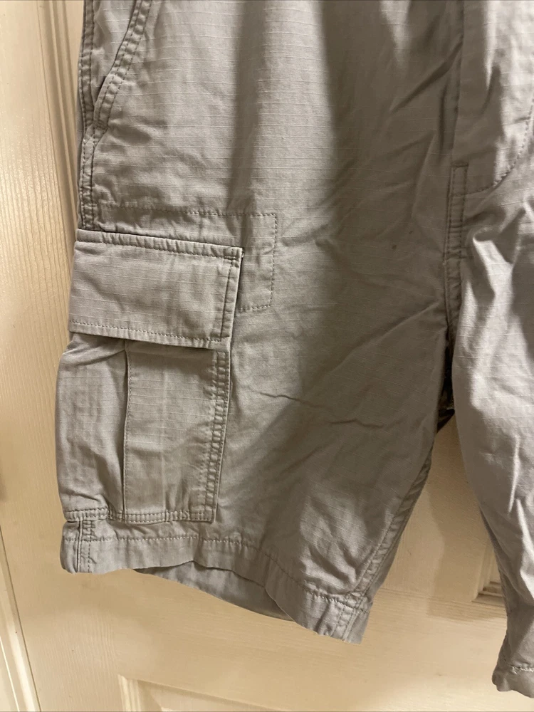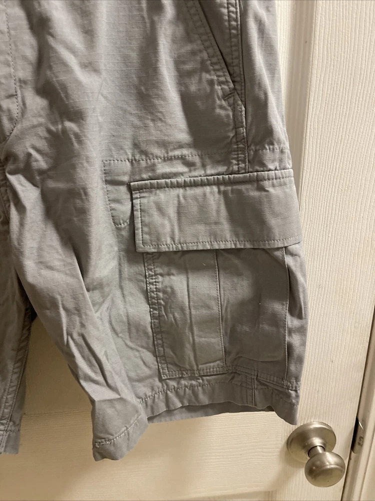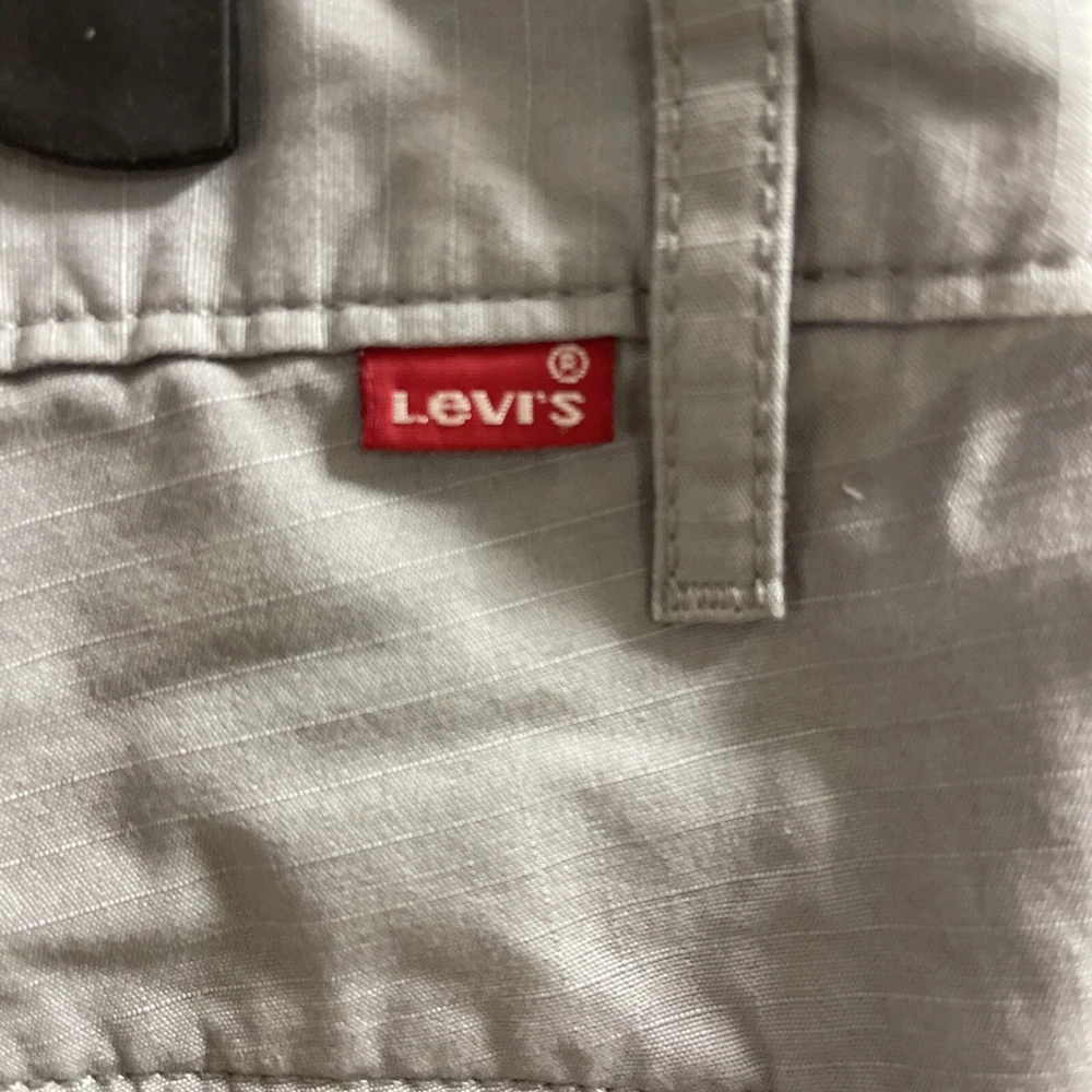 Levi's cargo shorts for men in size 34, featuring a solid green color and made of cotton. These casual shorts have a zip closure, flat front, and cargo pocket style with an inseam of 8 inches. The shorts are designed with a medium fabric wash and a regular fit, suitable for outdoor activities. The brand is Levi's, known for its quality and style.