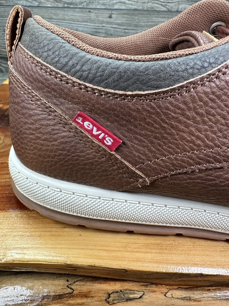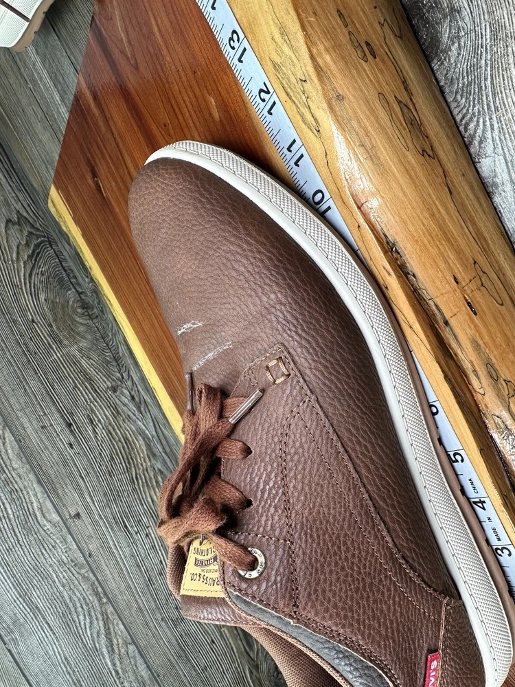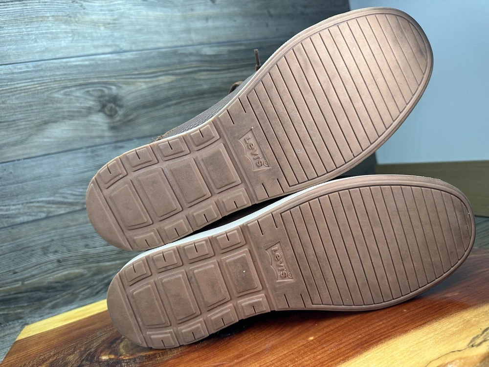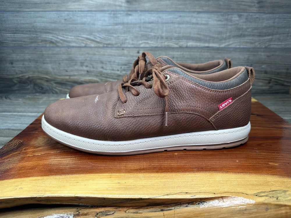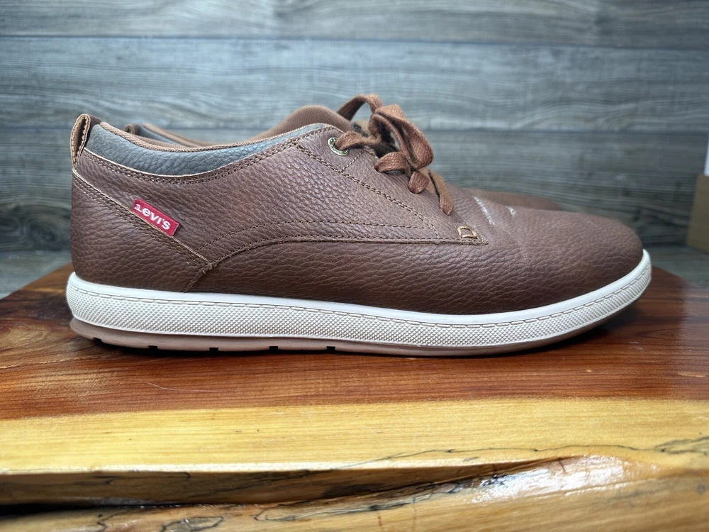 Elevate your shoe game with these stylish Levis Comfort Shoes. With a brown leather upper and lace-up closure, these sneakers are perfect for any casual occasion. The synthetic lining and insole provide ultimate comfort, while the rubber outsole ensures durability. These shoes are a size US 12 or UK 11 with a standard shoe width. The model is Levi's Comfort and the product line is Ethans. Add these Levis Comfort Shoes to your collection today!