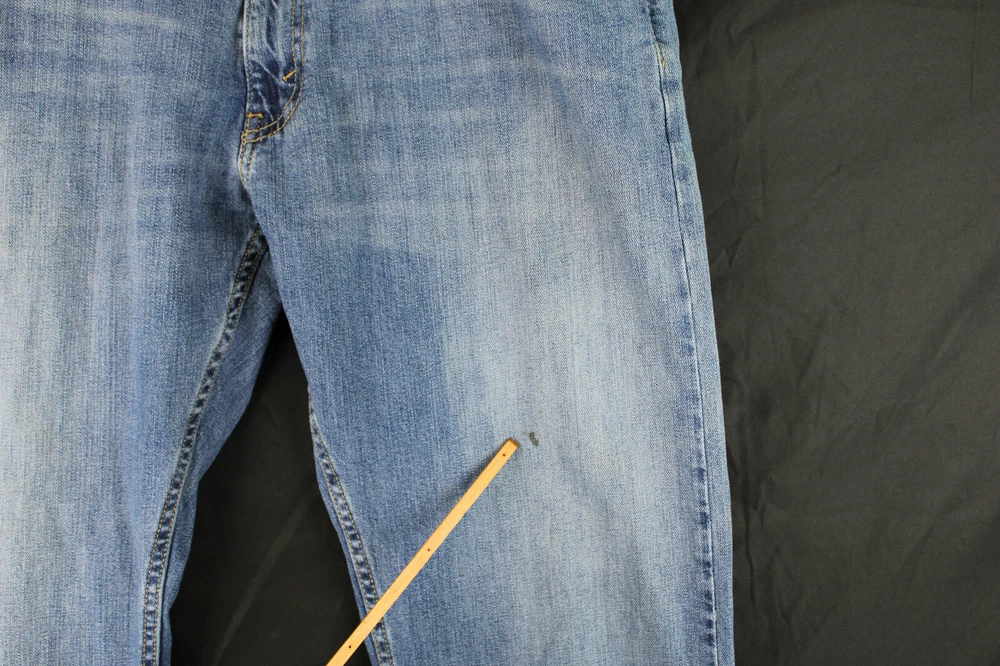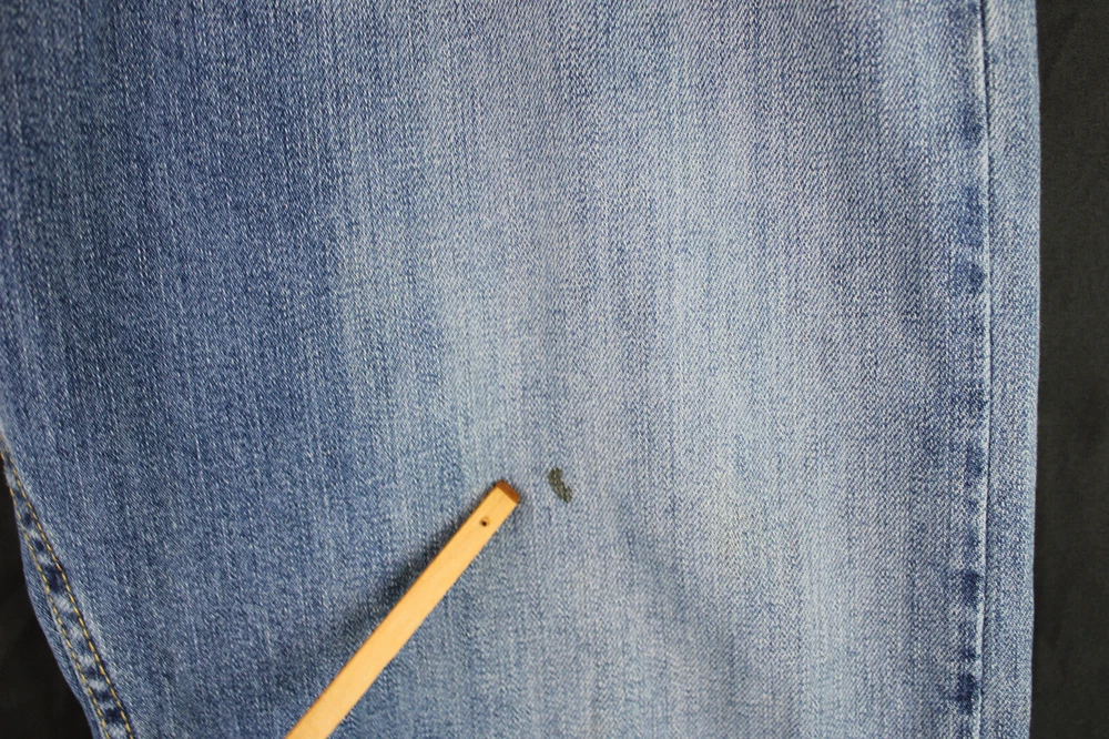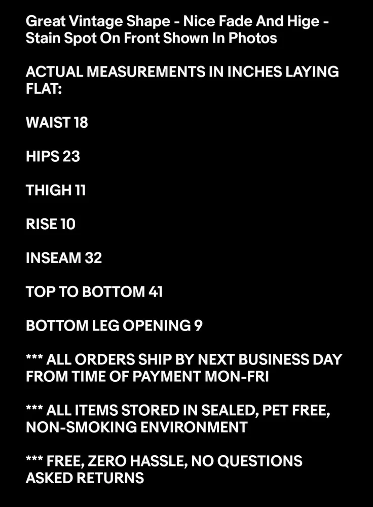 Great Vintage Shape - Nice Fade And Hige - Stain Spot On Front Shown In Photos ACTUAL MEASUREMENTS IN INCHES LAYING FLAT: WAIST 18 HIPS 23 THIGH 11 RISE 10 INSEAM 32 TOP TO BOTTOM 41 BOTTOM LEG OPENING 9 *** ALL ORDERS SHIP BY NEXT BUSINESS DAY FROM TIME OF PAYMENT MON-FRI *** ALL ITEMS STORED IN SEALED, PET FREE, NON-SMOKING ENVIRONMENT *** FREE, ZERO HASSLE, NO QUESTIONS ASKED RETURNS