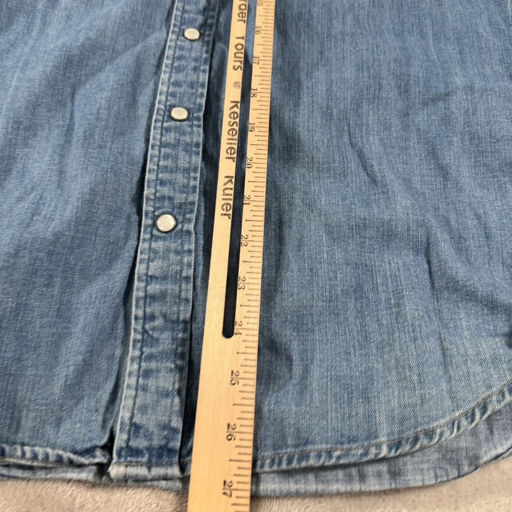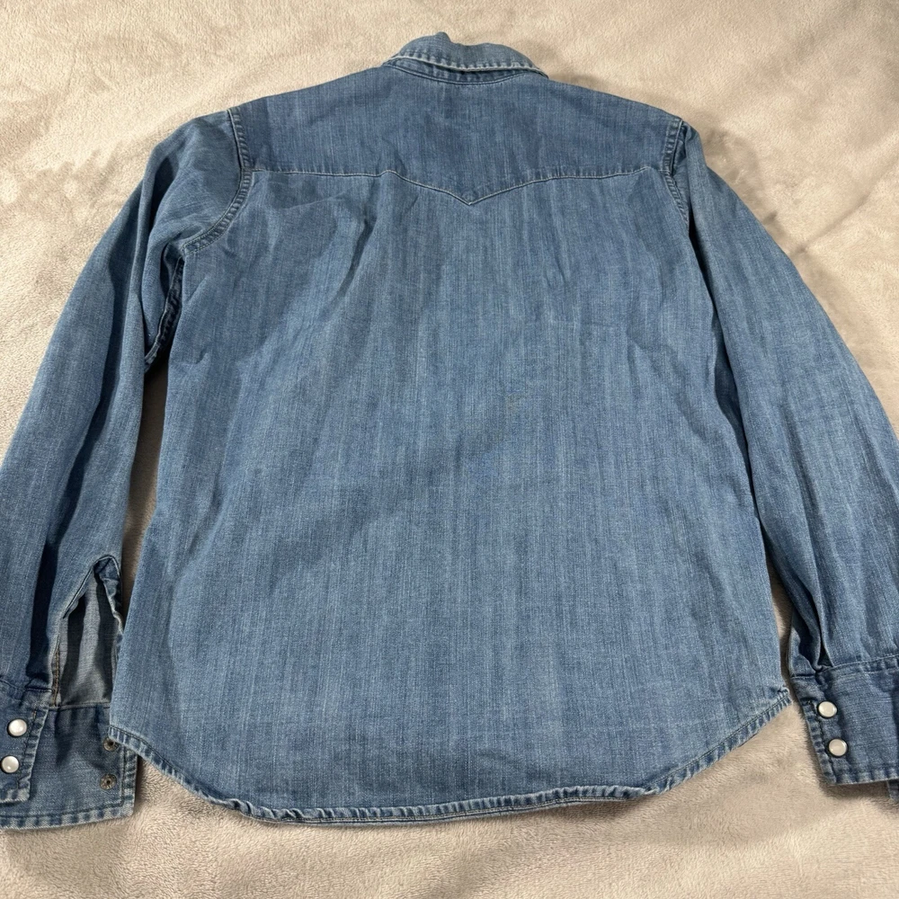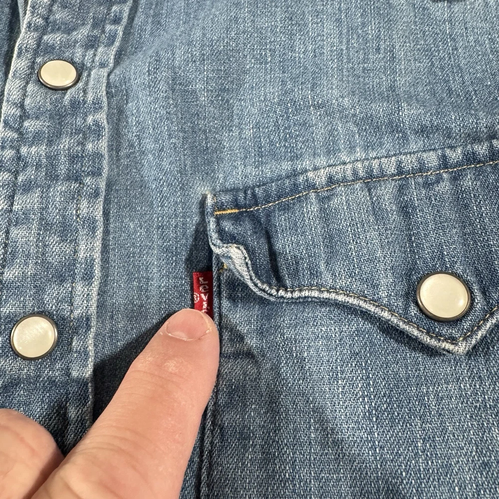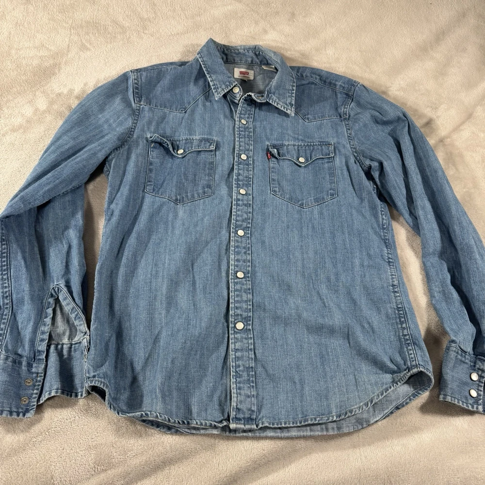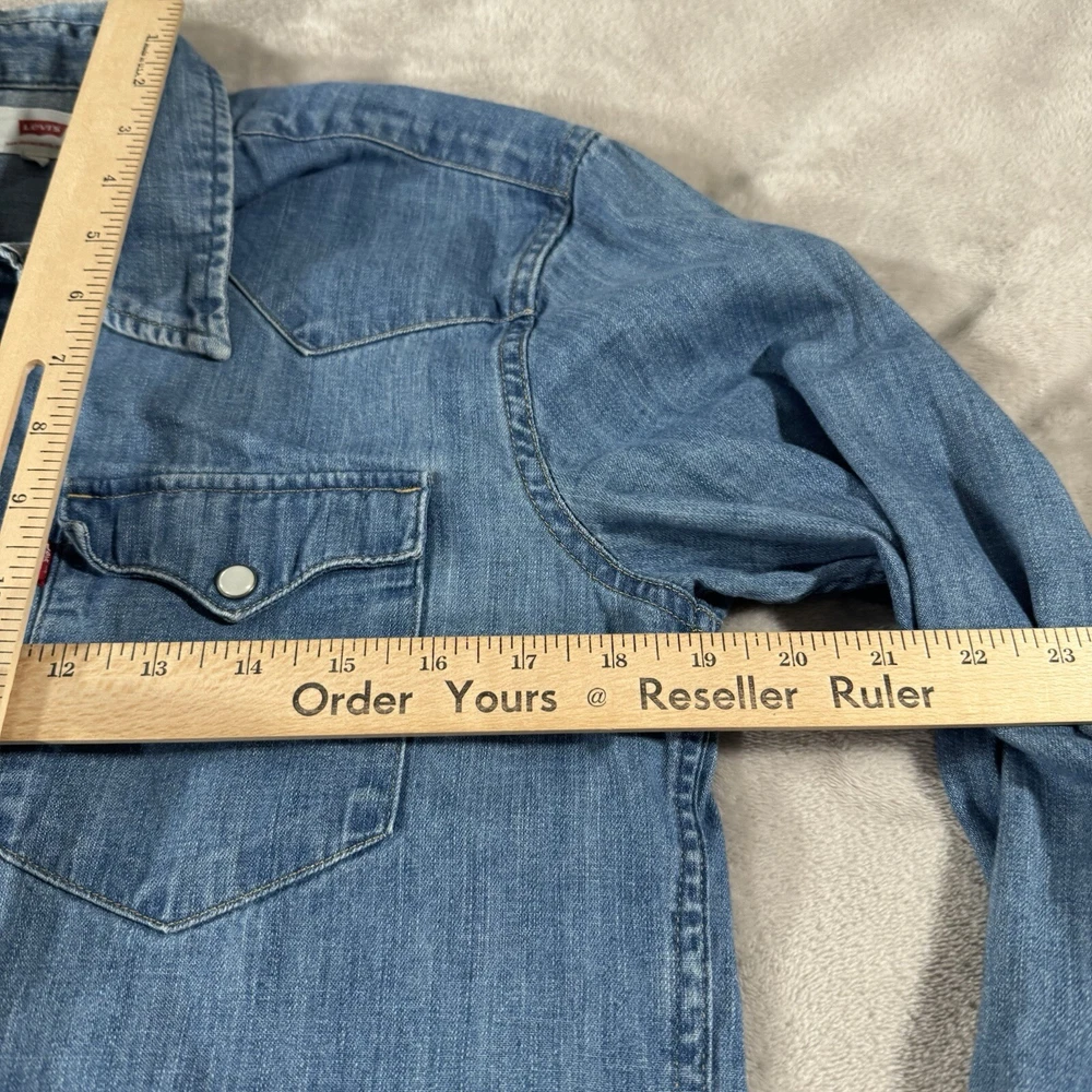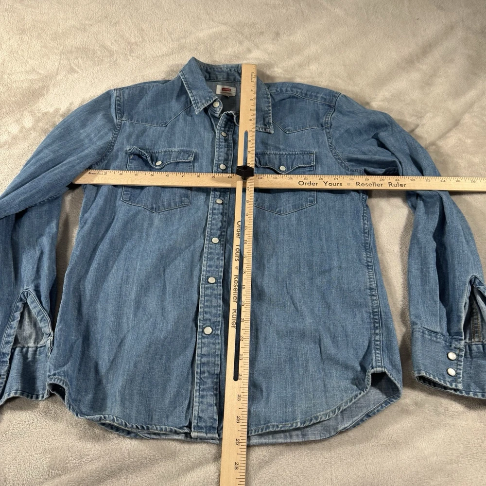 Crafted for versatility and timeless style, the Levi's Denim Shirt is a quintessential piece for any wardrobe. In a vivid blue shade, this adult small size shirt fits comfortably with its regular fit design. The durable cotton denim fabric ensures longevity while the long sleeves and collared neckline offer a classic Western cowboy look that never goes out of style. The shirt boasts a convenient snap closure and a point collar that adds a touch of sophistication to the casual button-up. Suitable for a wide range of occasions, from workwear to casual outings, it also features handy pockets and is machine washable for easy care. Whether you're channeling a retro '90s vibe or simply aiming for a classic, laid-back look, this Levi's shirt is sure to deliver.
