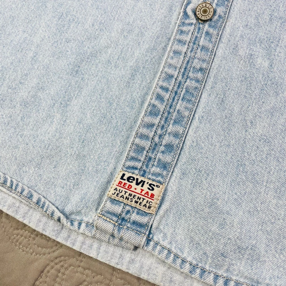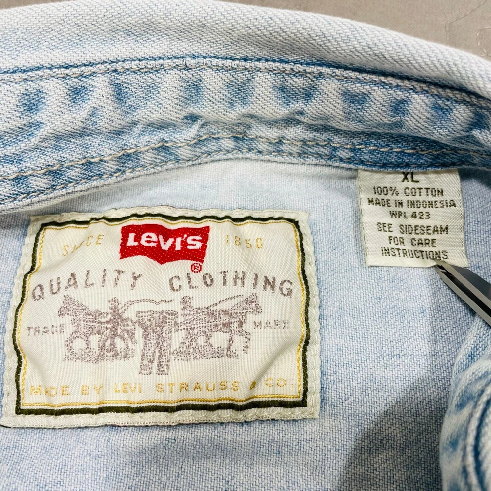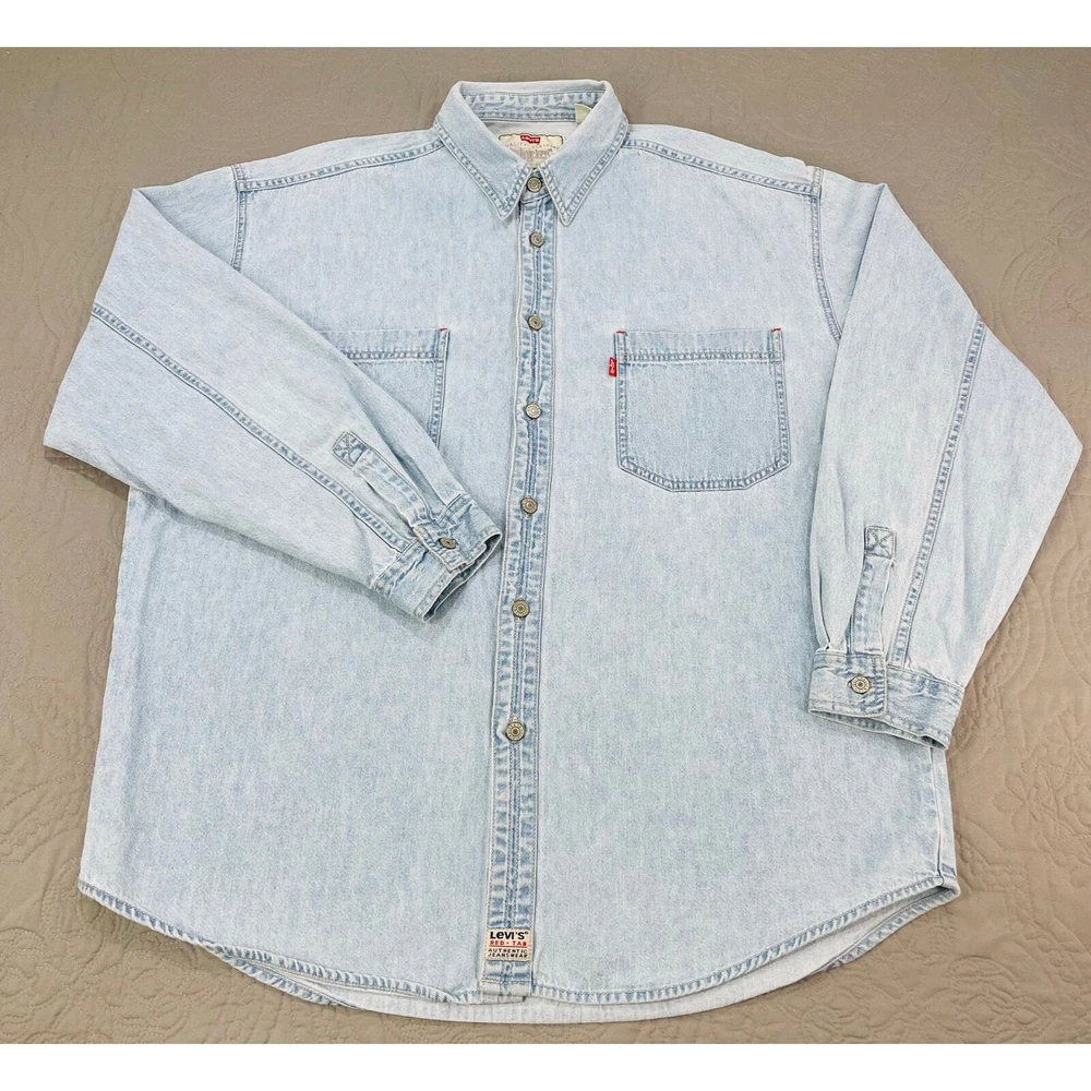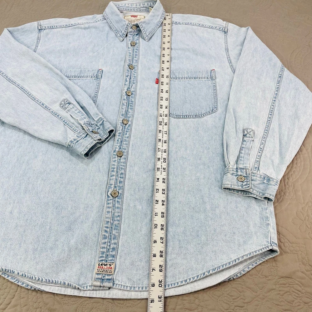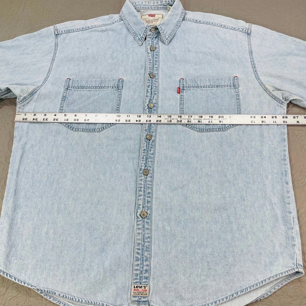 Levis Denim Shirt Light Wash Men X Large Western Red Tab Y2K Long Sleeve Classic Color---Light wash denim blue Stains or Holes---None, really good vintage condition Actual Measurements--- Please see pictures for actual measurements Please check out my other listings and bundle for a better price and shipping discount.