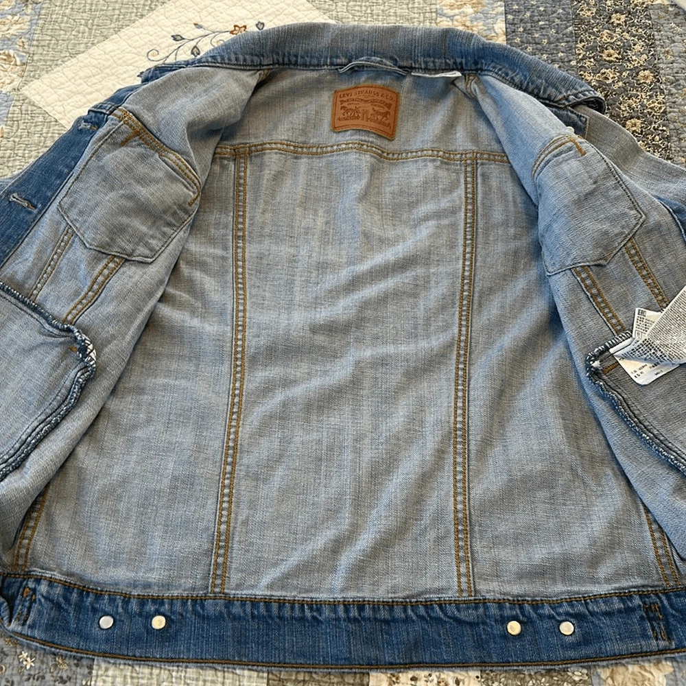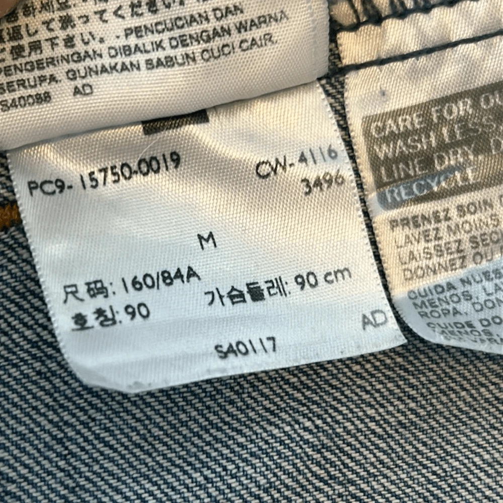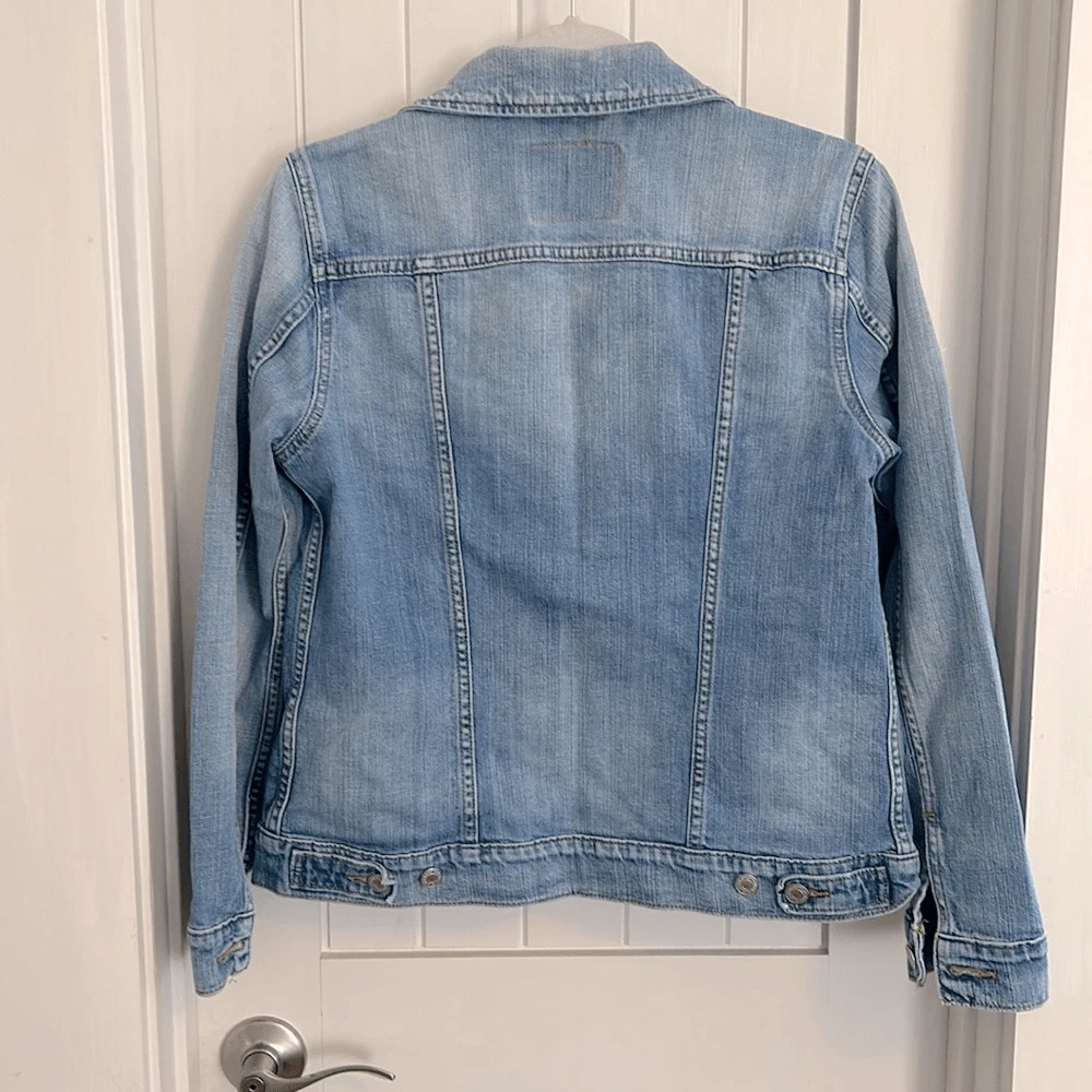 Levi’s Distressed Denim Jean Trucker Jacker Size Medium Measurements in photos Cotton Elastane Excellent condition