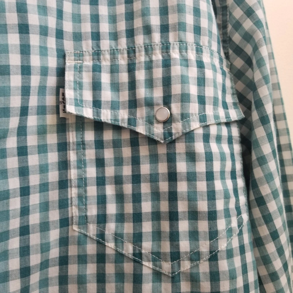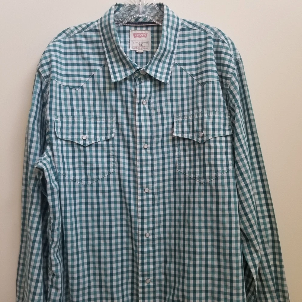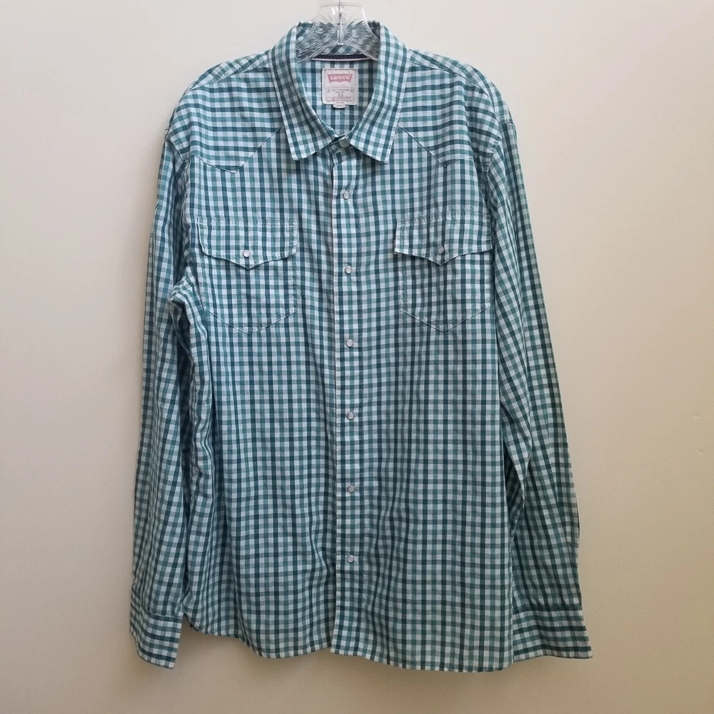 Levi's Green Stripe Western Men's Long Sleeve Snap Button Shirt Top Sz XL Pockets - Pre-Owned in very good condition - Measurements Approximately Shoulder to Shoulder - 19 in Chest Armpit to Armpit - 23 1/4 in Arm Length - 26 3/4 in Length - 31 3/4 in - Spring, Summer, Fall, Winter, Work, Office, College, School, Everyday, Day Out, Casual, Festive and Simple - Returns acceptable within 30 days of purchase unworn, in original condition - Check out my E-bay Store. Lots of Choices Available. Reduced shipping for 2 or more items. Let me know before you pay so I can send you an invoice to discount the shipping