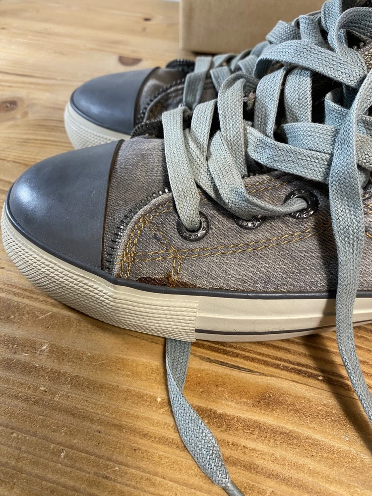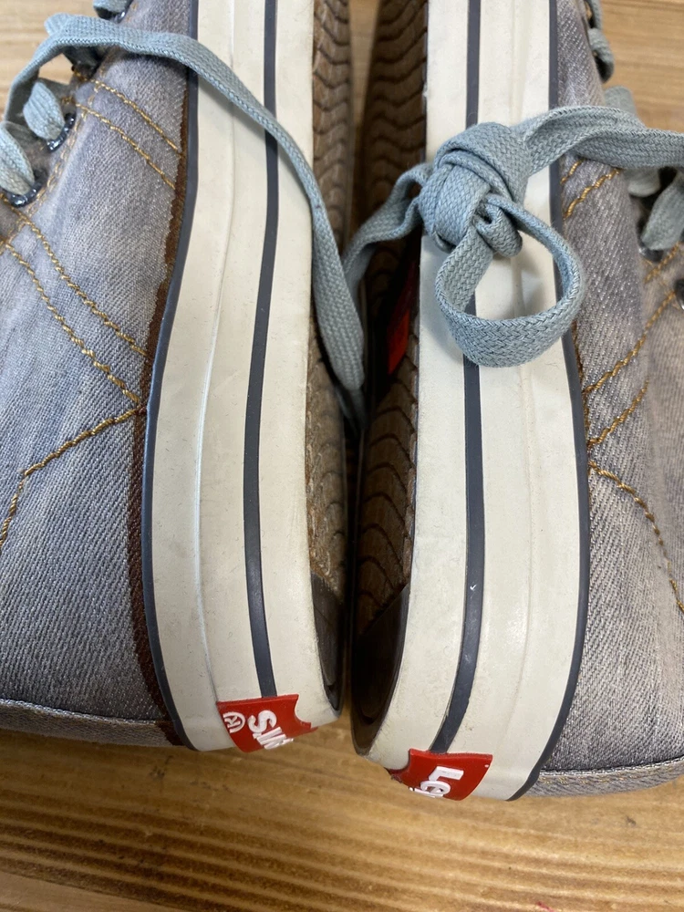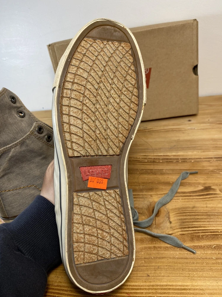 on top of the left shoe there is a small mark. Possibly a glue mark when they were fitting the soul.?? Elevate your sneaker game with these Levi’s High Top Sneakers. These stylish shoes feature a solid pattern and a round toe shape that is perfect for any casual or activewear occasion. The zip closure and double layer fold-down design add a touch of punk and rock style to your outfit, making them perfect for those who want to make a statement. The sneakers are made with a durable canvas upper and lining material, making them breathable and cushioned for all-day wear. The rubber outsole provides comfort and support, while the standard shoe width and adjustable features make them suitable for any foot size. With a retro and grunge music-inspired theme, these sneakers are perfect for those who want to add a touch of the 80s and 90s to their wardrobe.