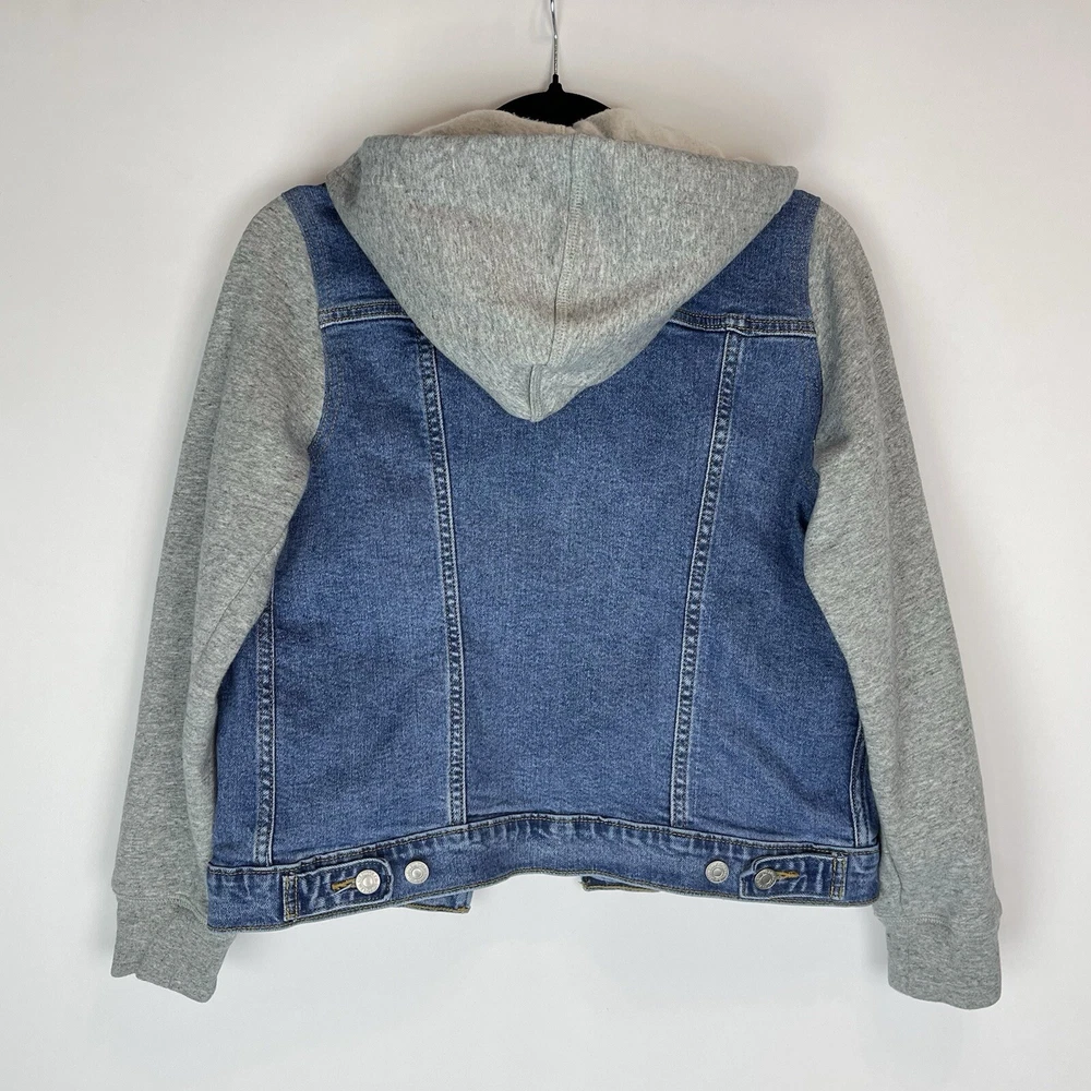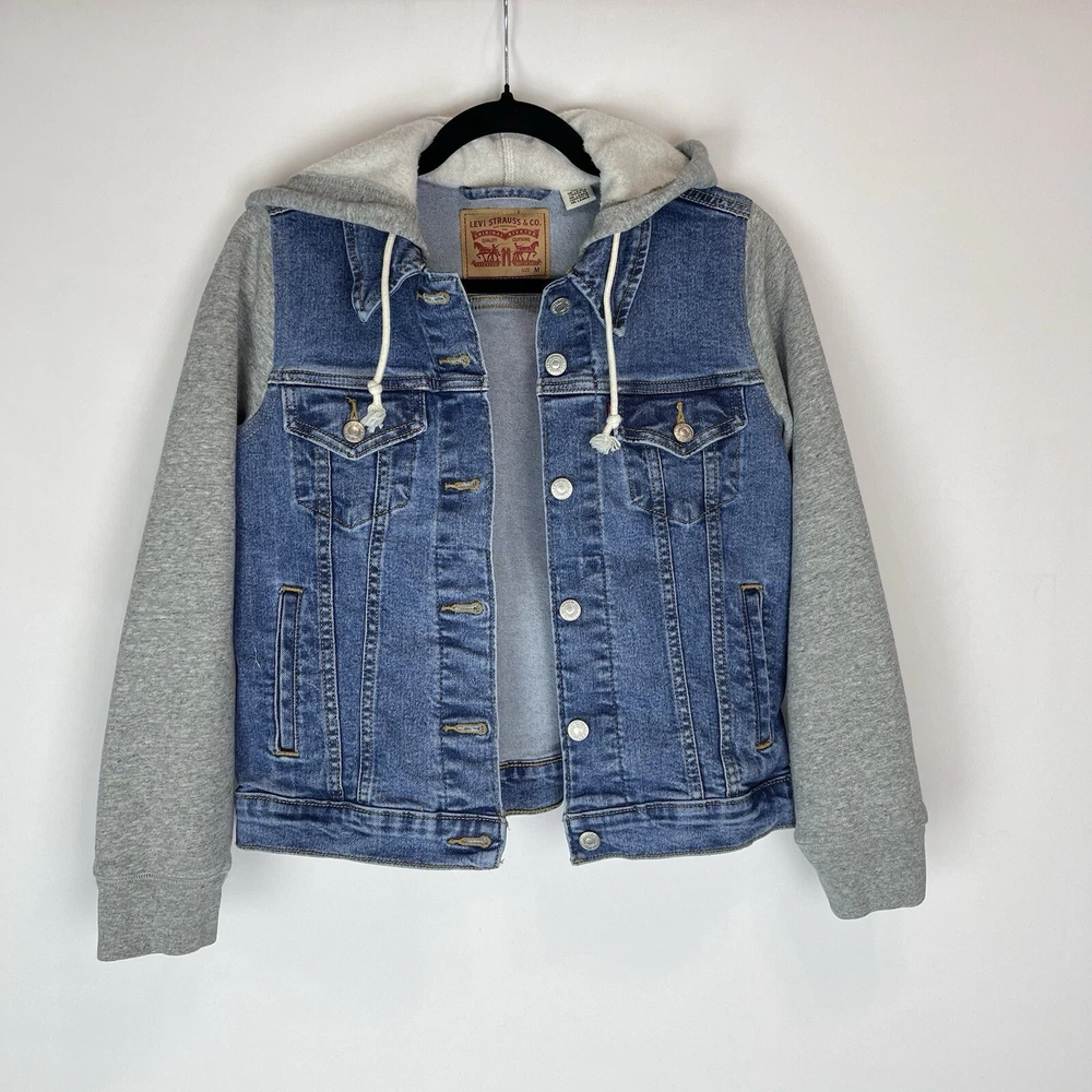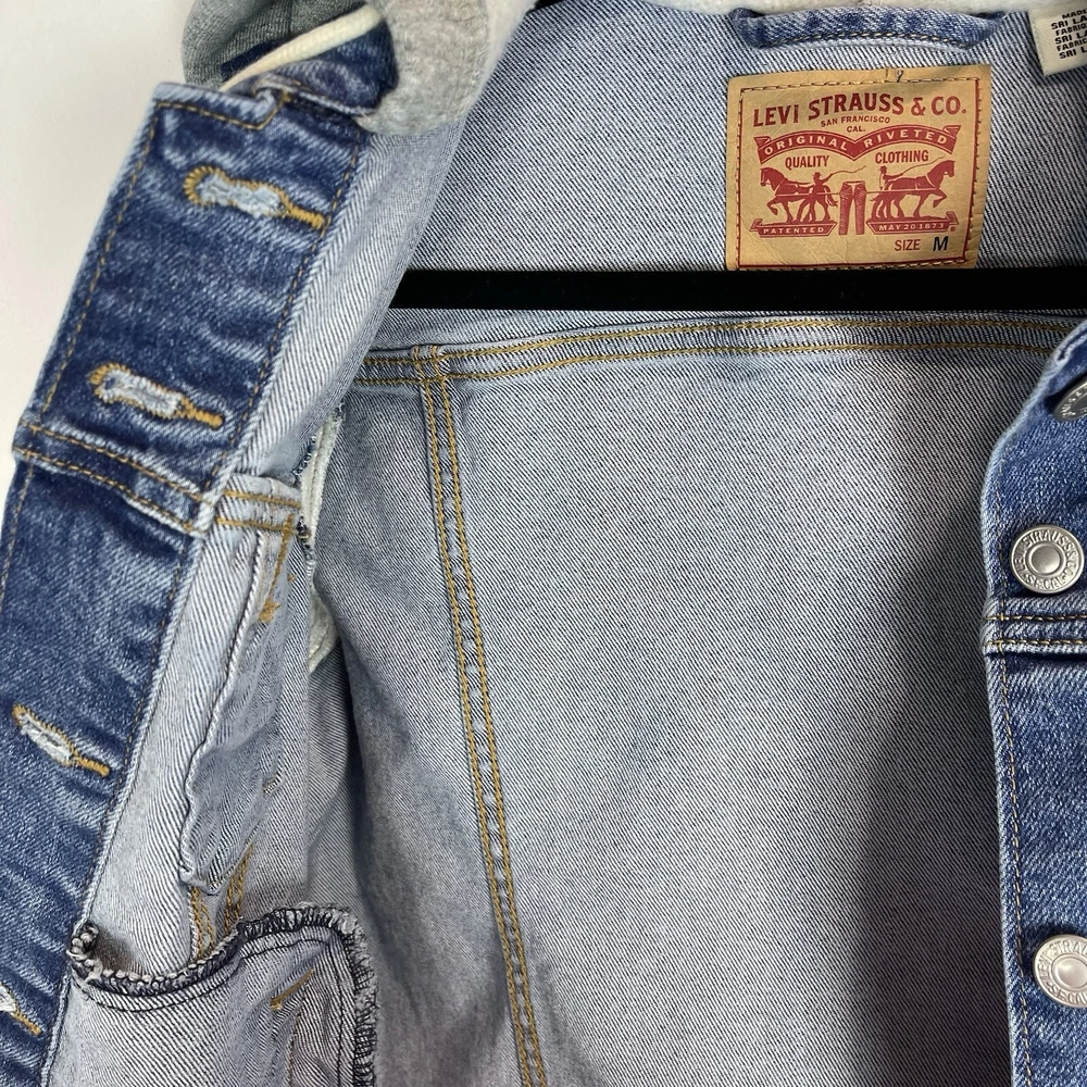 This Levi's Trucker Jacket is a must-have for any fashion-forward woman. The jacket is made of high-quality cotton denim and features a button closure with a hood and pockets. The jacket comes in a medium size and has a solid blue color with accents of buttons and logos. The jacket is perfect for any occasion, whether it's for travel or casual wear. It has a retro and classic style that is suitable for any theme, including cars, biker, motorcycle, American, grunge, cowboy, and preppy. The jacket is machine washable and easy to maintain. Get this Levi's Trucker Jacket today and add a touch of style to your wardrobe! This jacket looks to run small. Please see measurements to help with the fit. Measurements: Pit to Pit: 17 inches Length of Jacket: 21 Inches Size: M - but looks to run small Washed and Dried for you!
