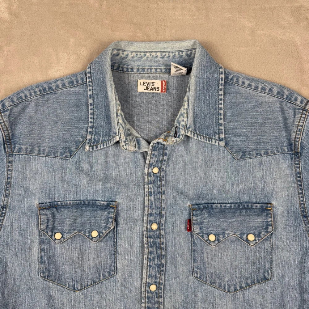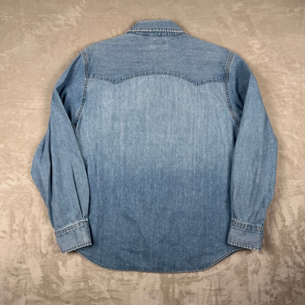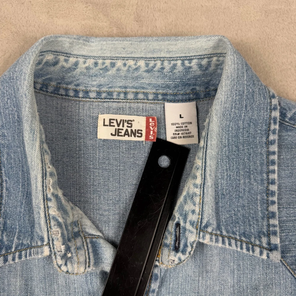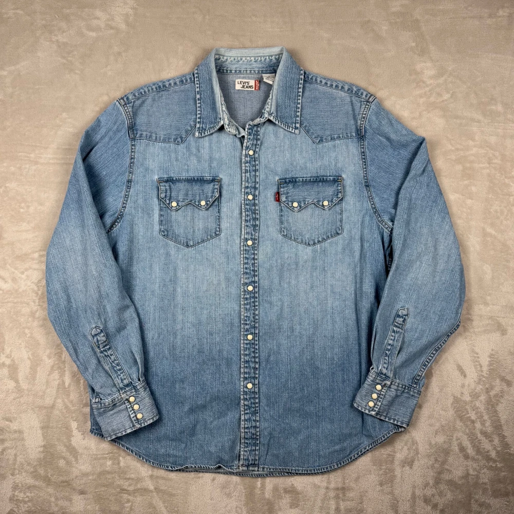 Levi's L Large Pearl Snap Long Sleeve Denim Button Up Blue Shirt Heavy Mens Faded Please view measurement in pictures as used products may fit different than the size shown on the tag. Our Items are all looked over, measured, and stored in a smoke-free environment. We do our best to accurately describe and measure all of our items when listing, but if you have any issues we offer a 30 day free return policy for unused and unworn items. Items typically ship the same or the next business day. If you would like to return an item message us first. We will answer any questions you have, and will resolve the issue! Embrace the classic Western vibe with this Levi's Long Sleeve Denim Button-Up. Crafted from 100% cotton, the shirt offers a comfortable regular fit in a size Large, tailored to fit seamlessly into any man's wardrobe. The iconic blue hue and durable denim fabric make it a versatile piece for both casual and semi-formal occasions. Attention to detail is evident in the pointed collar and the convenient pearl snap closures, which add a touch of sophistication to the overall design. Whether you're out for a ride or enjoying a casual day, this shirt's timeless appeal and fade-resistant quality ensure it will be a go-to in your collection.