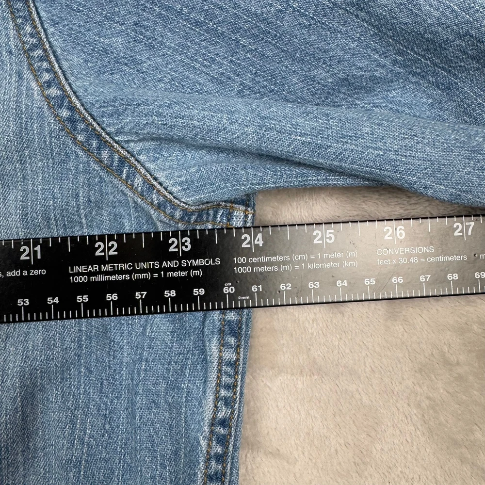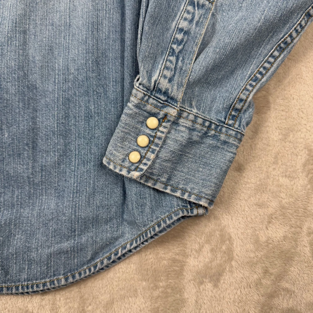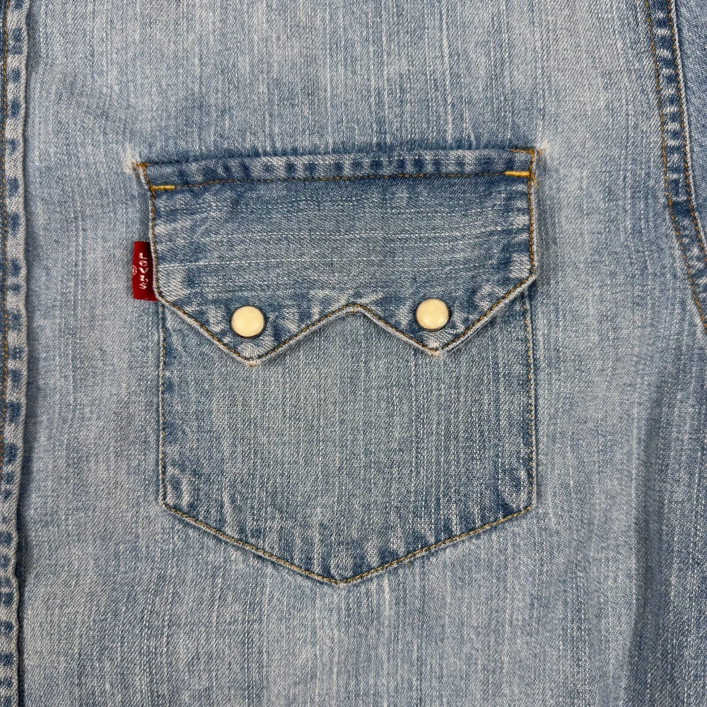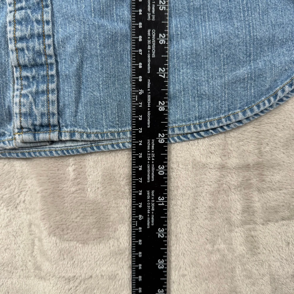 Levi's L Large Pearl Snap Long Sleeve Denim Button Up Blue Shirt Heavy Mens Faded Please view measurement in pictures as used products may fit different than the size shown on the tag. Our Items are all looked over, measured, and stored in a smoke-free environment. We do our best to accurately describe and measure all of our items when listing, but if you have any issues we offer a 30 day free return policy for unused and unworn items. Items typically ship the same or the next business day. If you would like to return an item message us first. We will answer any questions you have, and will resolve the issue! Embrace the classic Western vibe with this Levi's Long Sleeve Denim Button-Up. Crafted from 100% cotton, the shirt offers a comfortable regular fit in a size Large, tailored to fit seamlessly into any man's wardrobe. The iconic blue hue and durable denim fabric make it a versatile piece for both casual and semi-formal occasions. Attention to detail is evident in the pointed collar and the convenient pearl snap closures, which add a touch of sophistication to the overall design. Whether you're out for a ride or enjoying a casual day, this shirt's timeless appeal and fade-resistant quality ensure it will be a go-to in your collection.