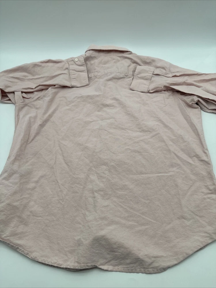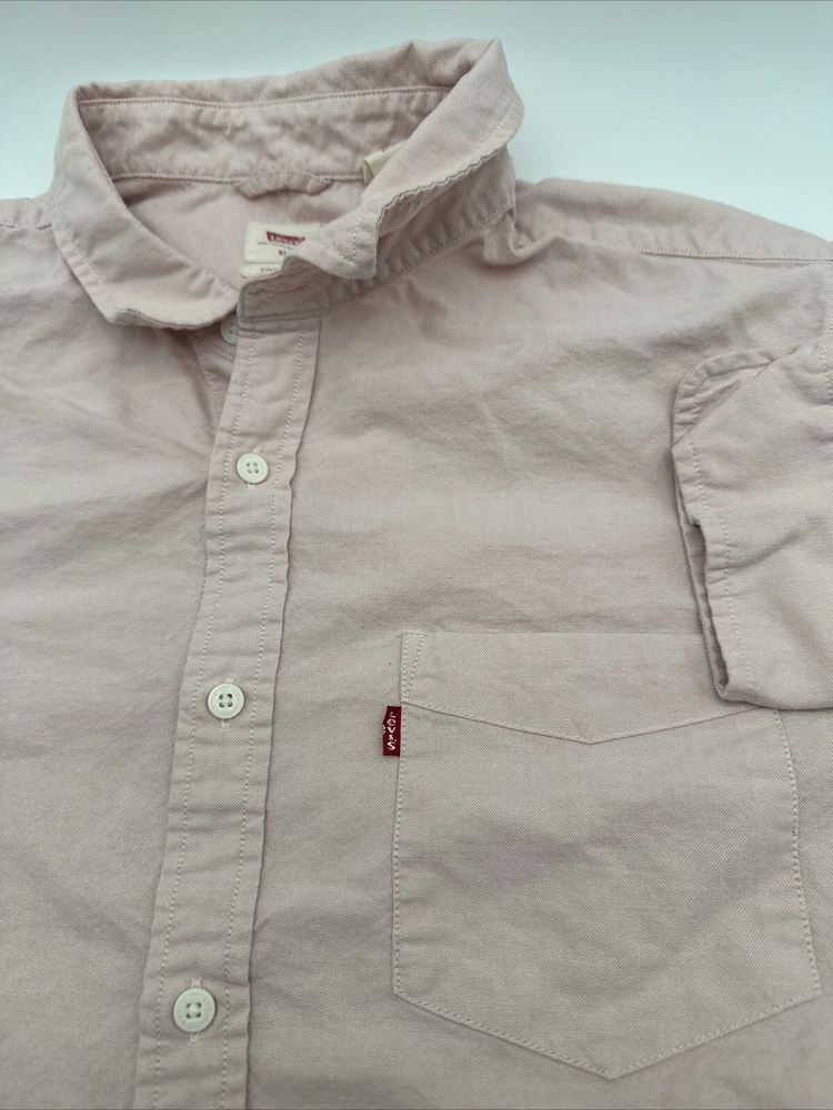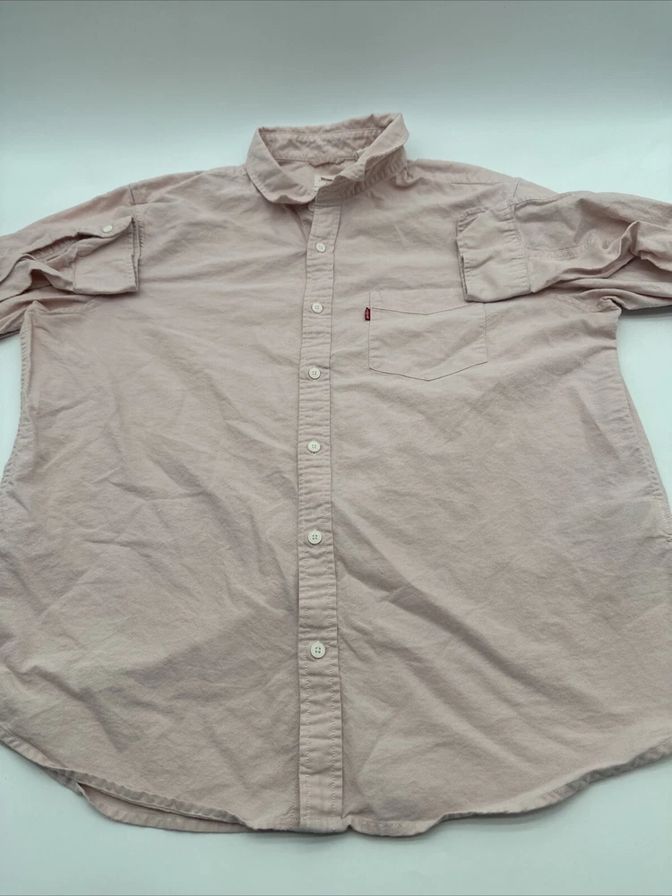 This is a Levi's men's button-up shirt in size XL, featuring a solid pink color. It has long sleeves, a collared neckline, and a regular fit. Made of cotton in India, this classic shirt is easy to care for and has a button closure. *Check the images above for the flaws and measurements of the item.