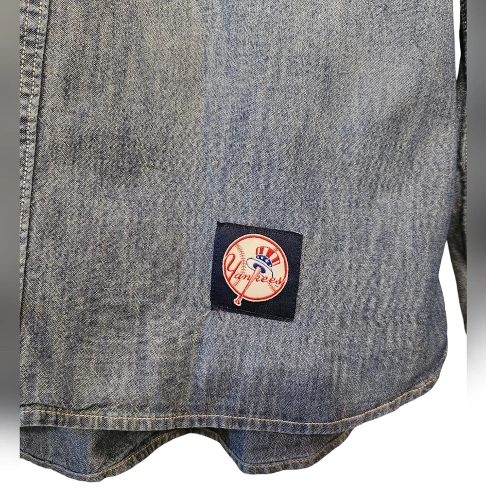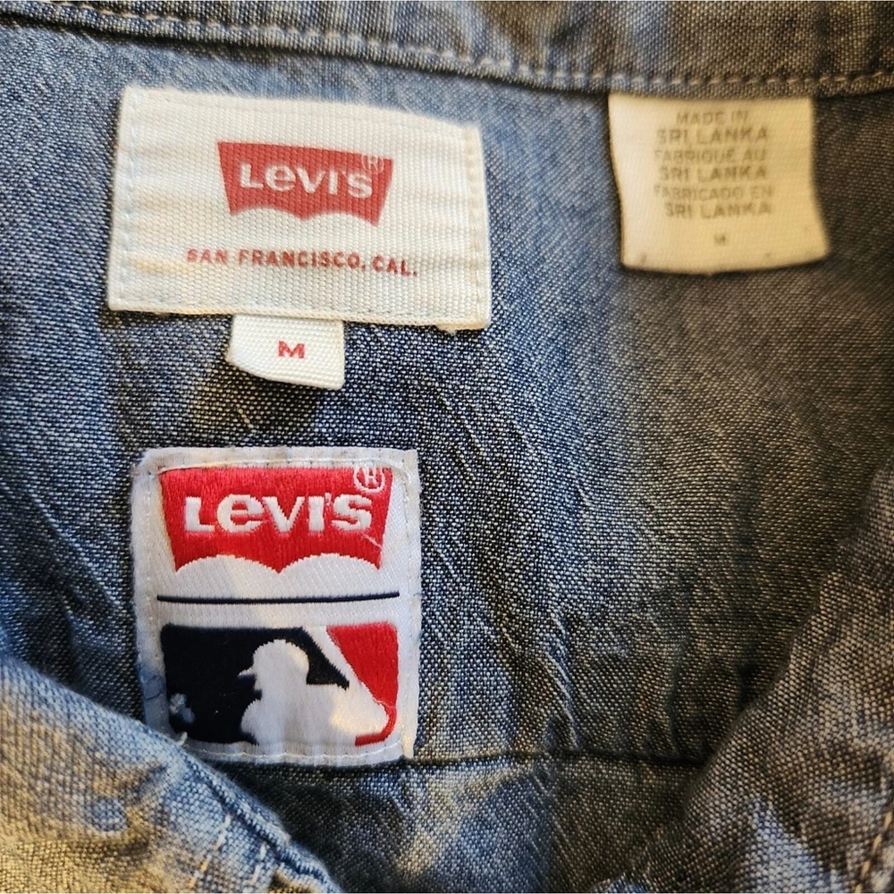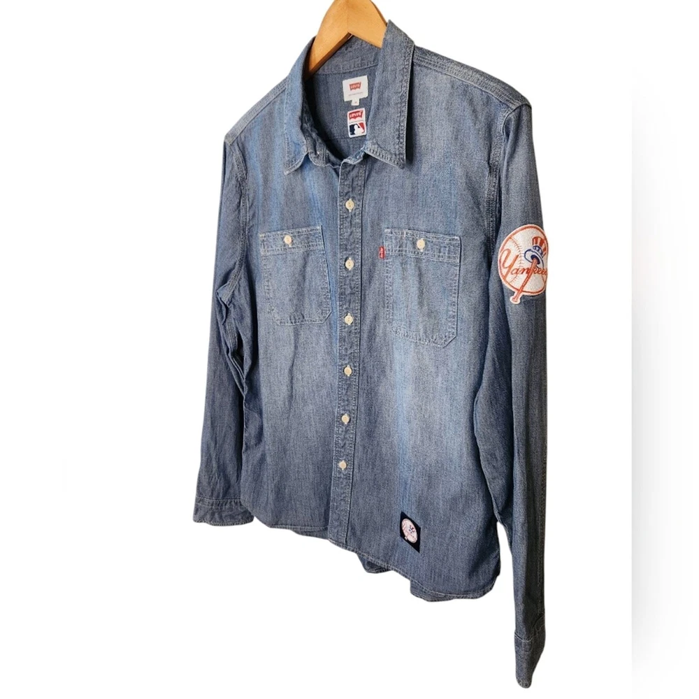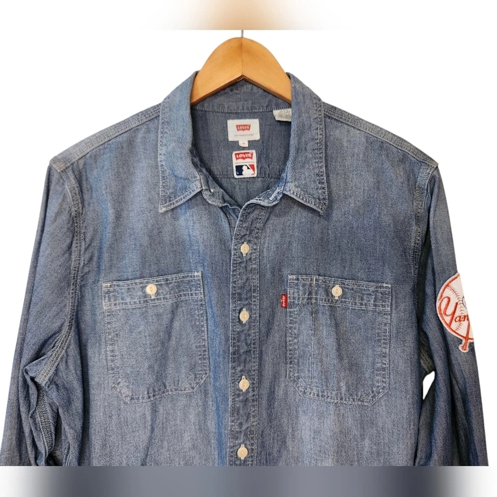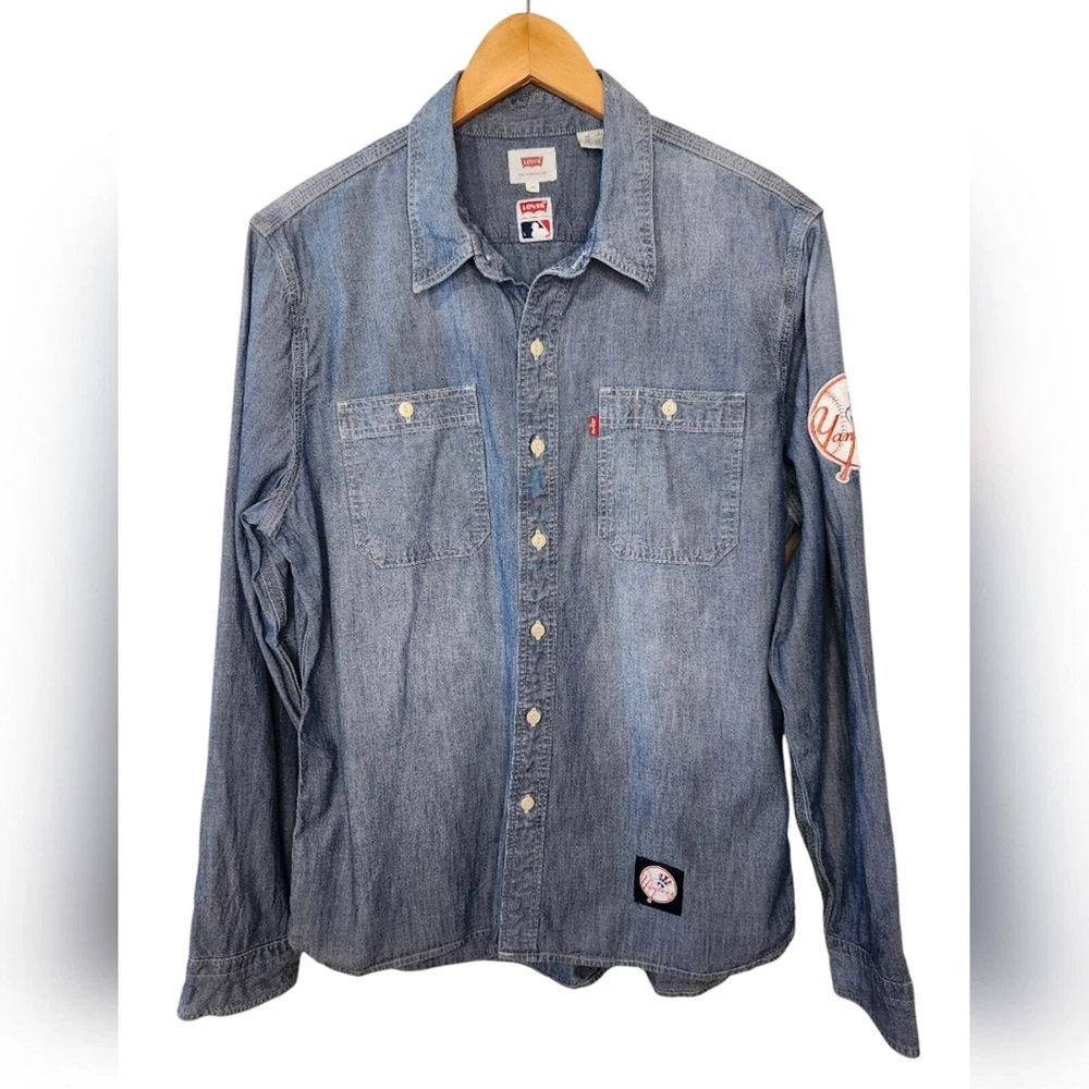 New York Yankees Patch Limited Edition MLB Levi's Chambray Shirt Size Medium excellent condition. no stains, pilling or holes. laying flat measurements in inches pit to pit 21 shoulder to hem 27 About this Style Limited-edition gear -- For true fans of the game. Our officially licensed Levi's® Major League Baseball Collection celebrates your team spirit with our iconic styles. This workwear-style shirt has timeless utilitarian style, and is proudly embellished with team details for this season and beyond.