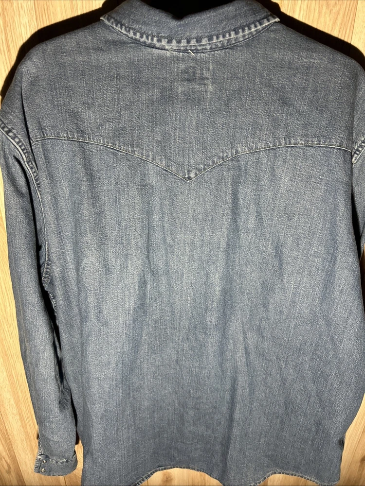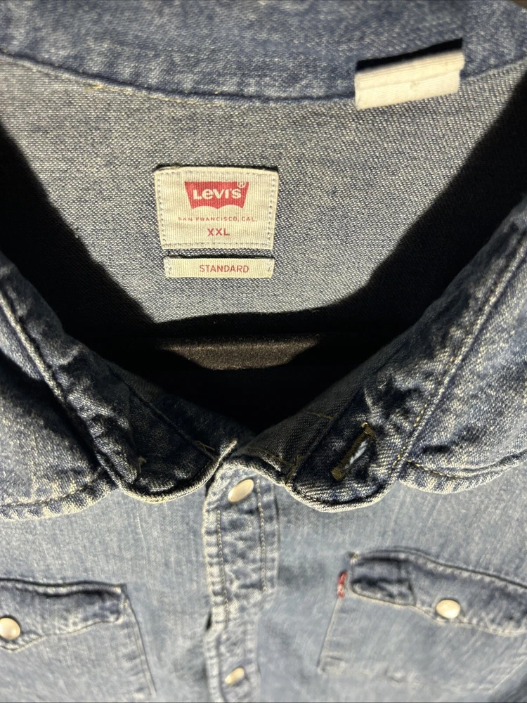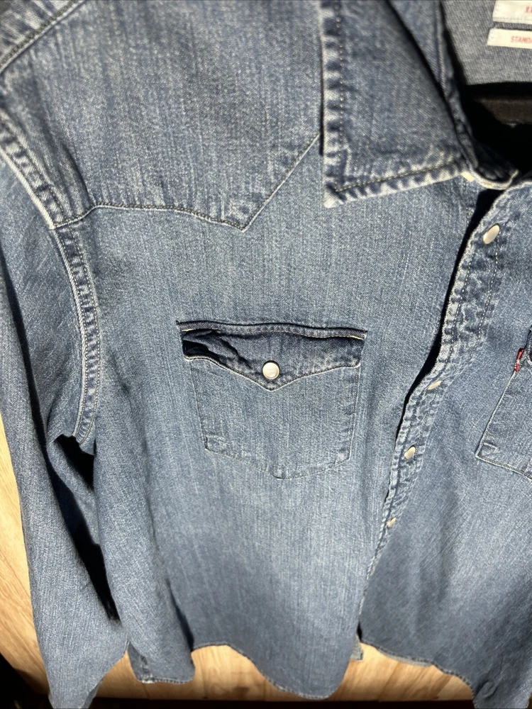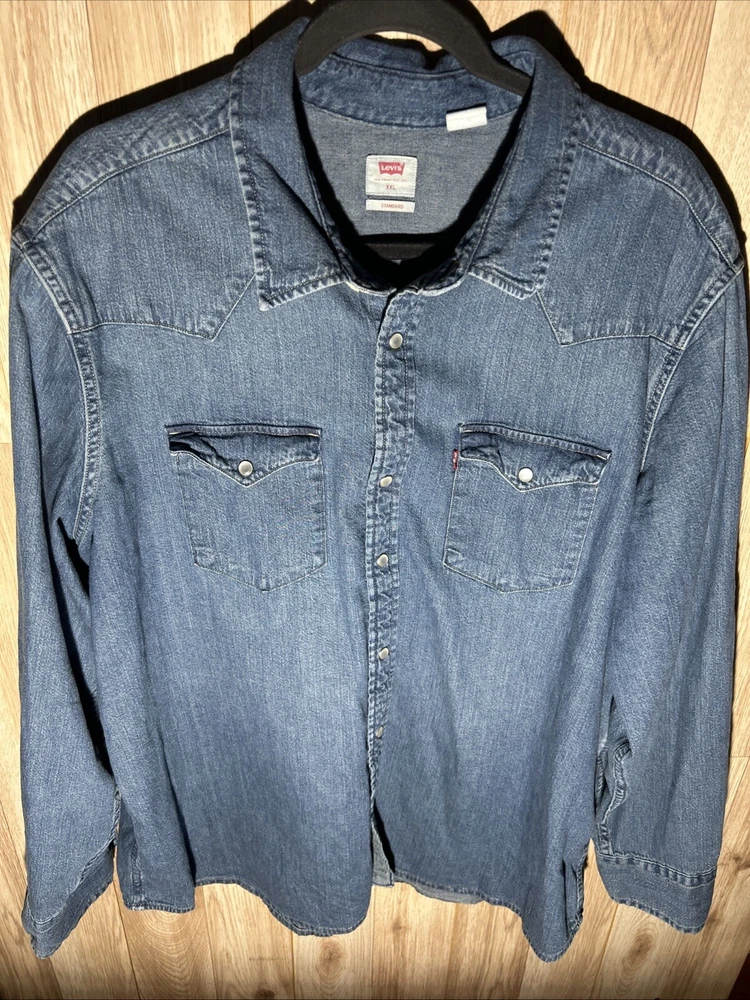 This Levi's men's denim shirt is a classic addition to any wardrobe. With its solid blue color and Western theme, it's perfect for any occasion. The shirt features pearl snap closures and long sleeves, making it a versatile piece for any season. Made with high-quality denim fabric, this shirt is built to last. It's available in a 2XL size, making it a comfortable fit for any man. Whether you're going for a casual or formal look, this Levi's denim shirt is the perfect choice.