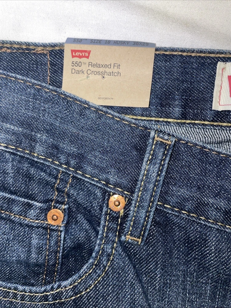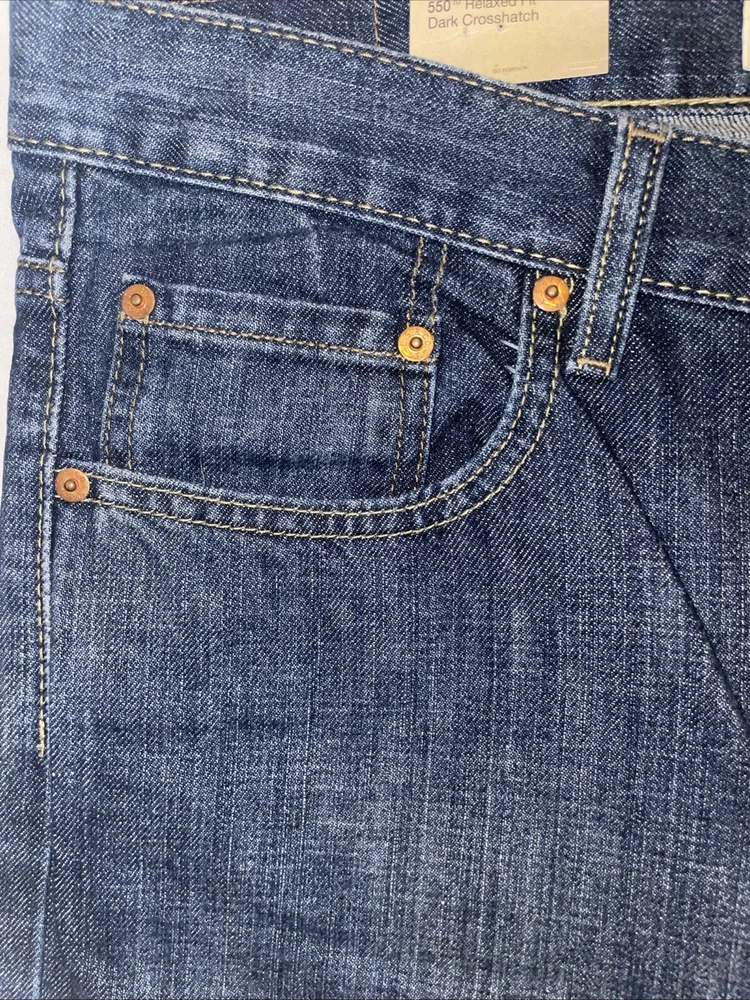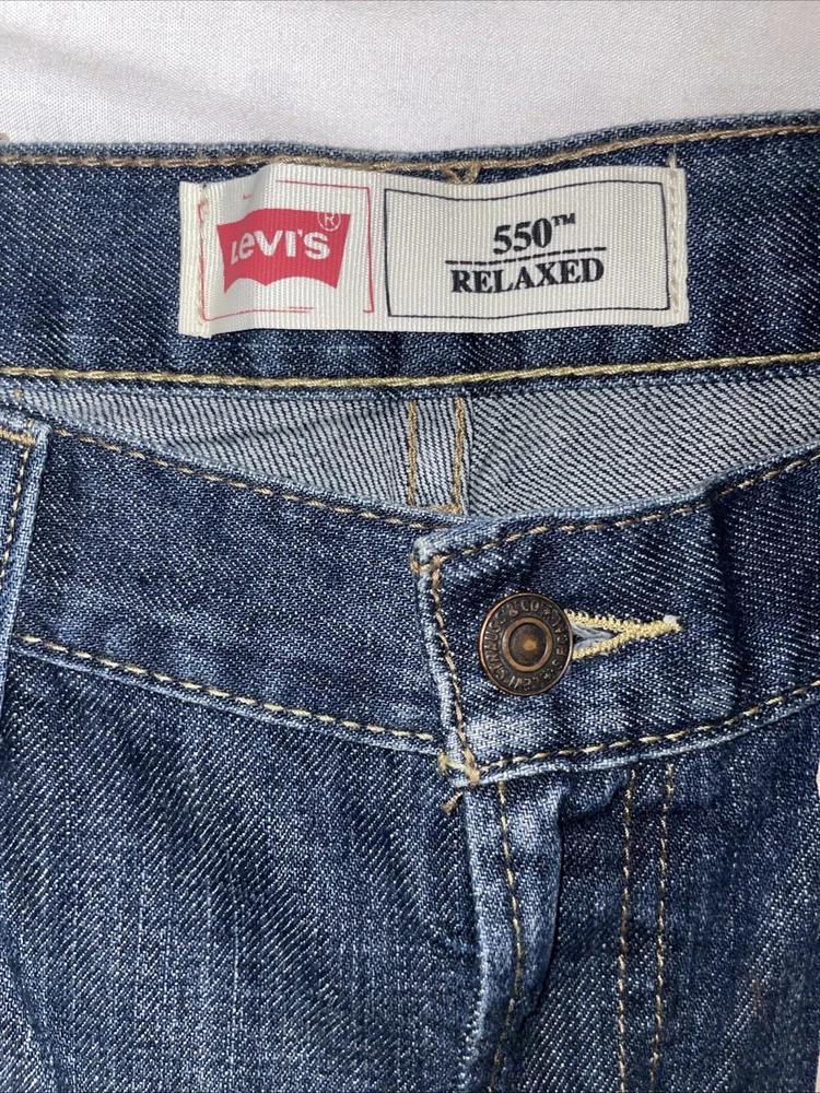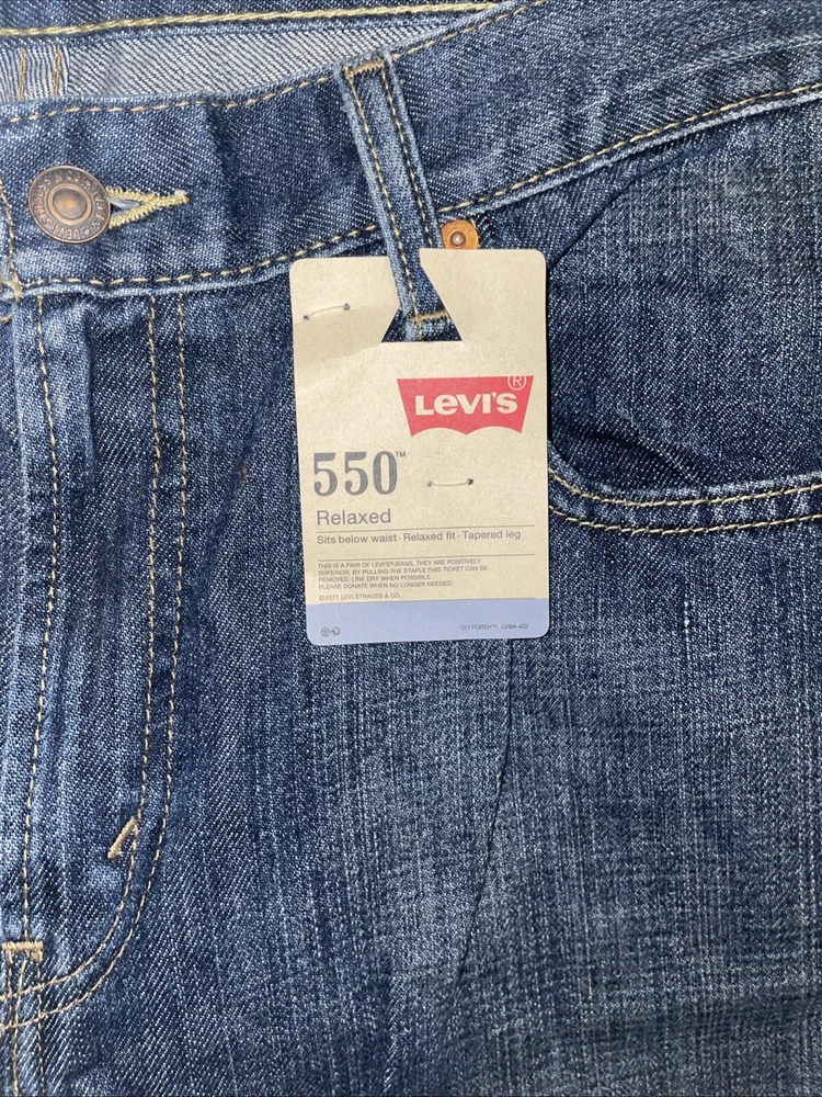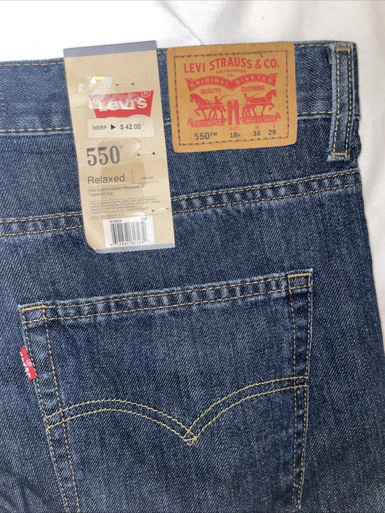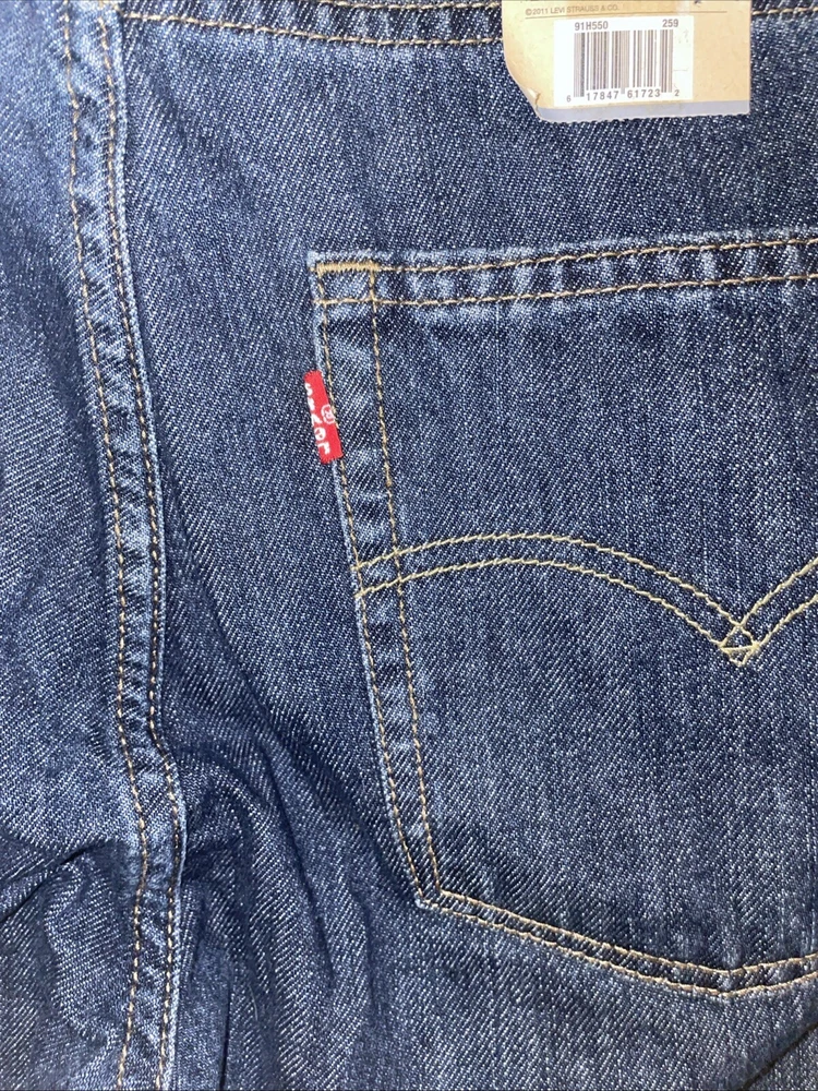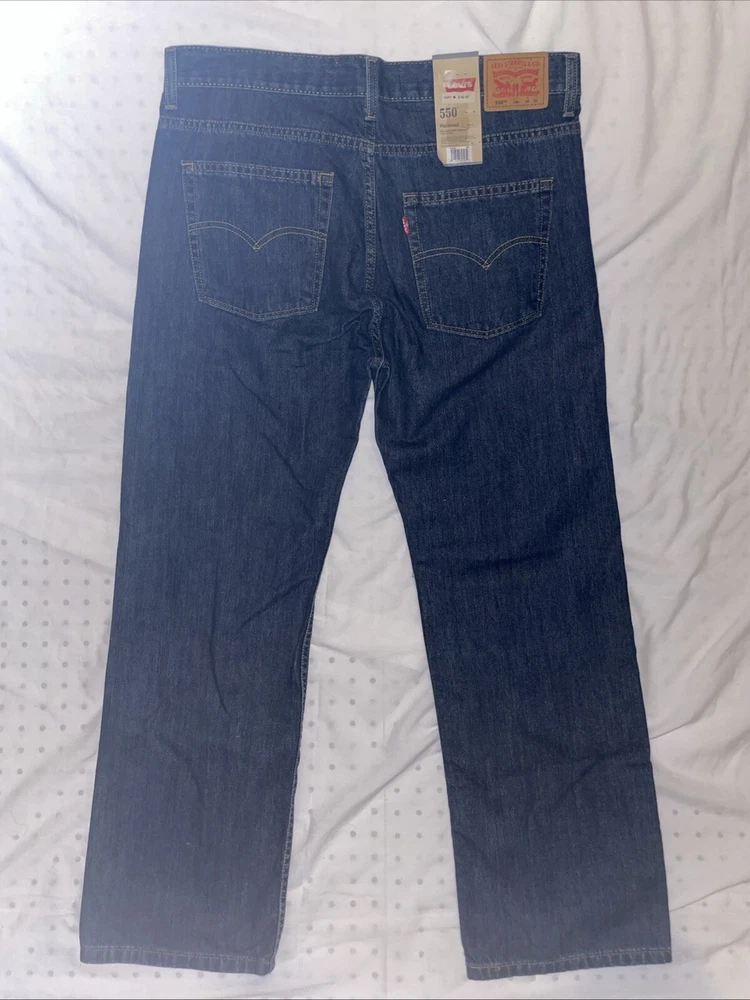 The Levi's Men's 550 Relaxed Fit Jeans in size 36 waist and 29 inseam are crafted from dark stonewash denim with a solid pattern. The jeans feature a zip closure, classic 5-pocket design, and a relaxed fit for comfortable wear. Made of cotton, this Levi's 550 model in a straight style is designed for a regular size type, ideal for men looking for a timeless and versatile addition to their wardrobe.