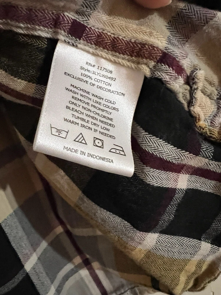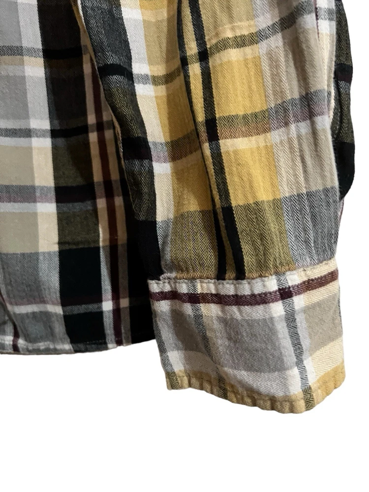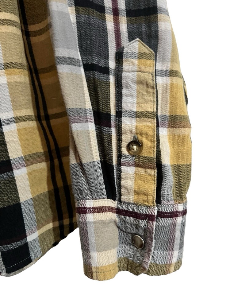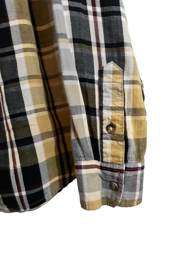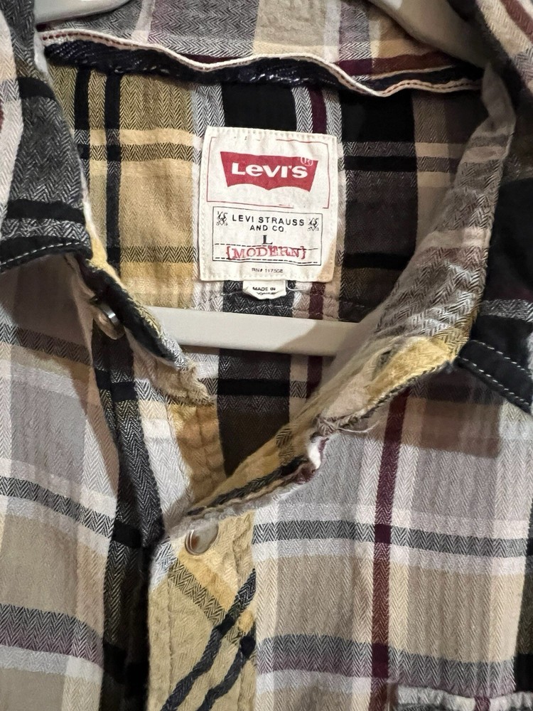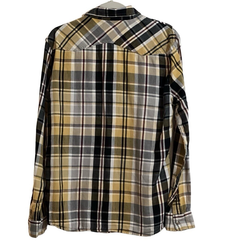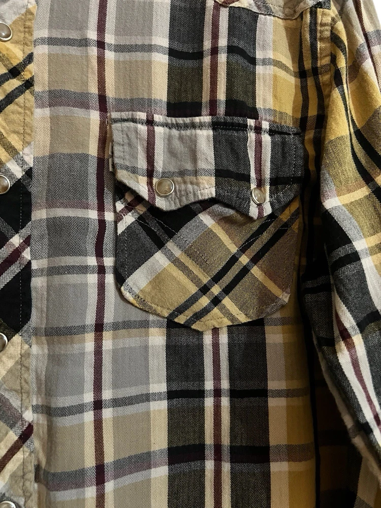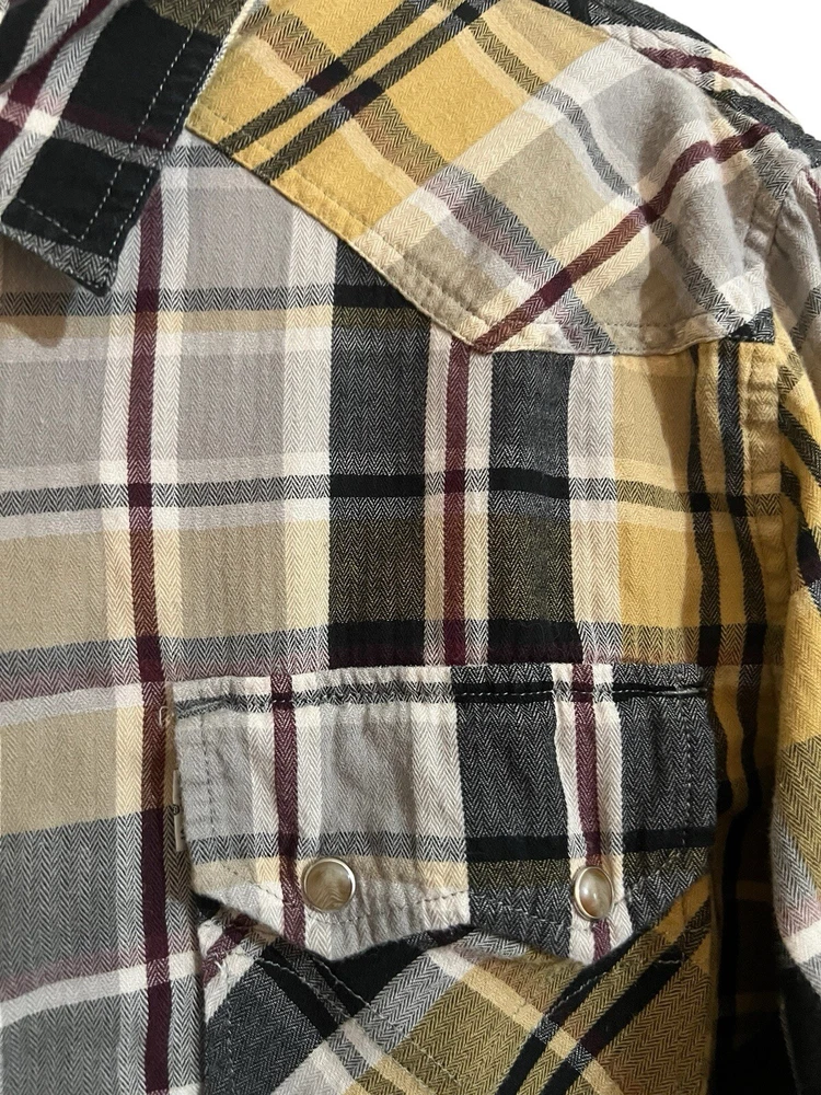 Levi's Modern Men's Shirt. Long Sleeve. Western Style Cut. Pearl Snap Front. Yellow, black gray plaid. Size Large Preowned and in good condition. No holes or stains. Clean. Snap buttons are functional. 2 chest pockets that also have snap closure. Great for casual wear to school and everyday wear. 100% cotton. Machine washable. Measurements: Chest- 21 1/2” armpit to armpit lying flat Back center length- 29” Shoulder- 16 1/2” Thank you for looking. If you need more details send me a message.