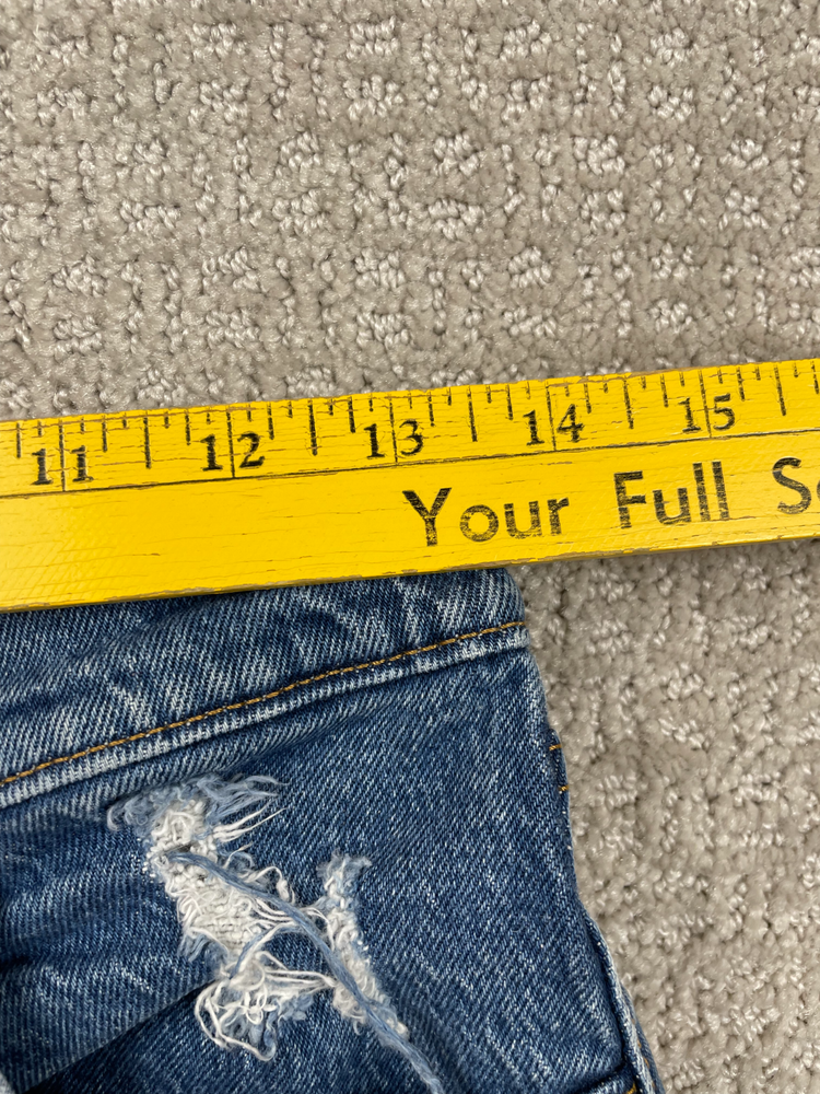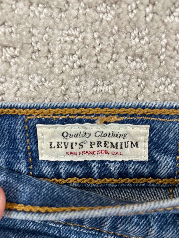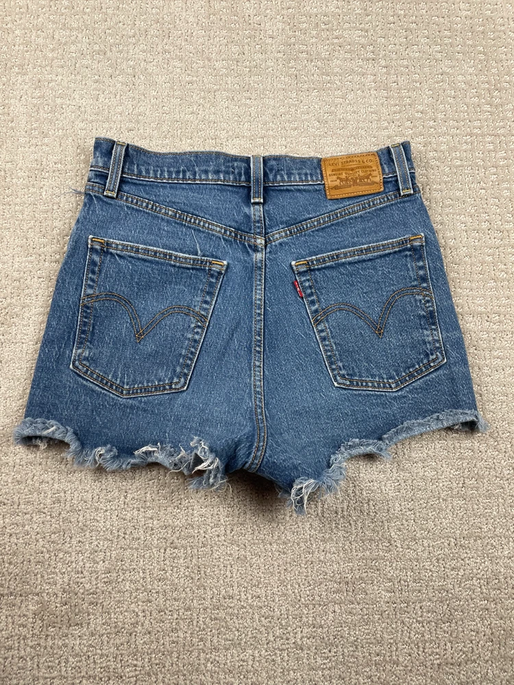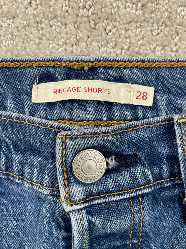 The product is a pair of Levi's Premium women's shorts in a size 28, featuring a ribcage fit with a daisy duke cut and a button fly closure. Made of denim with a distressed, raw hem, these shorts have a high rise waist and a flat front. The blue color and 5-pocket design make them ideal for a casual occasion in the summer or spring seasons. Perfect for walking, these shorts by Levi's are machine washable and a stylish addition to any woman's wardrobe.