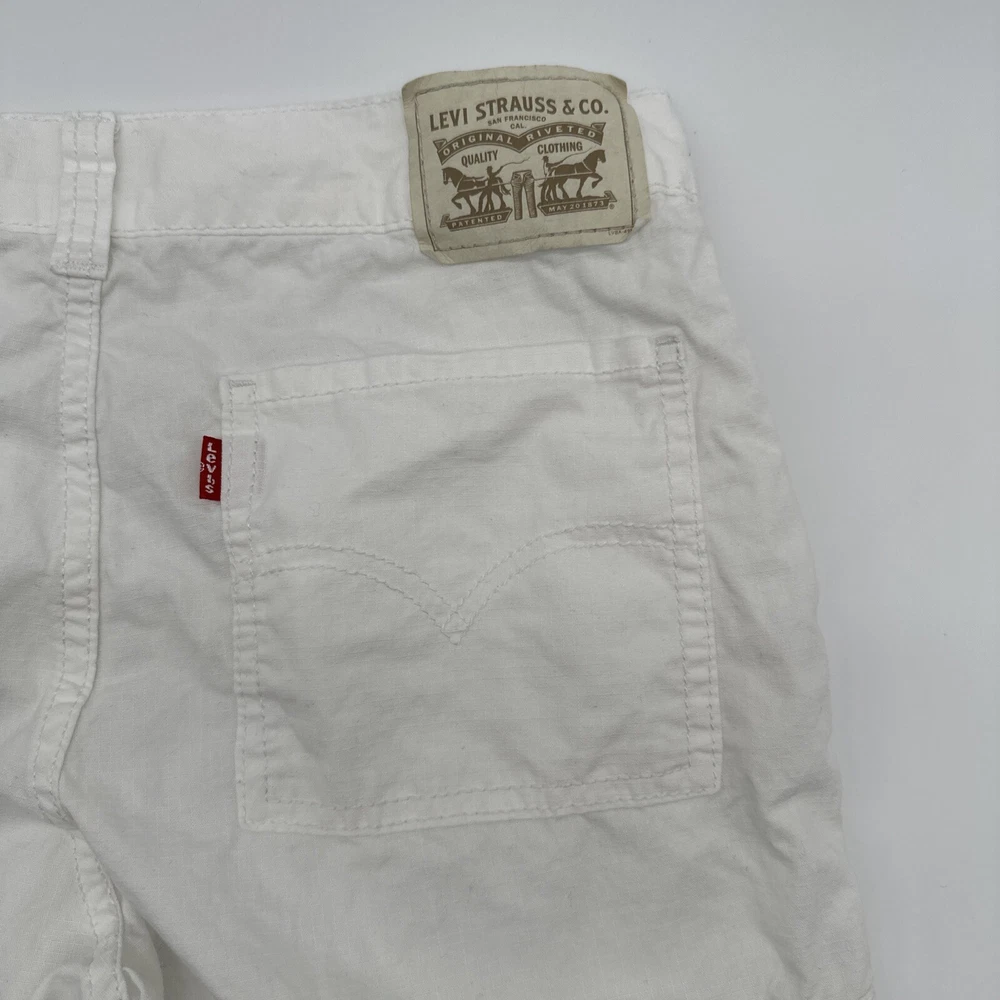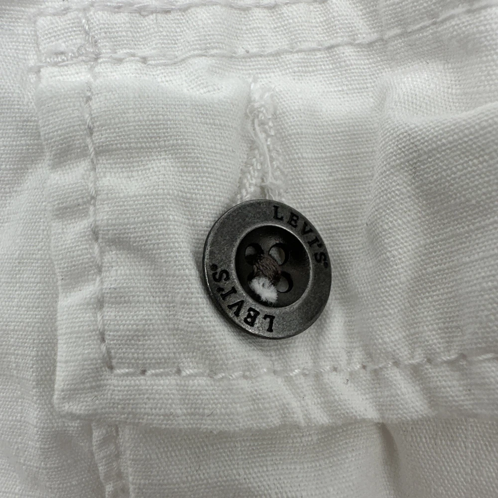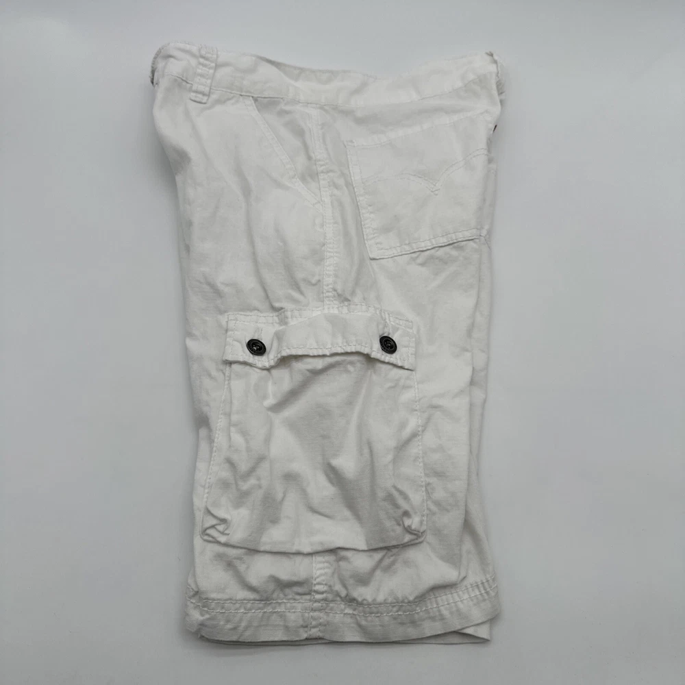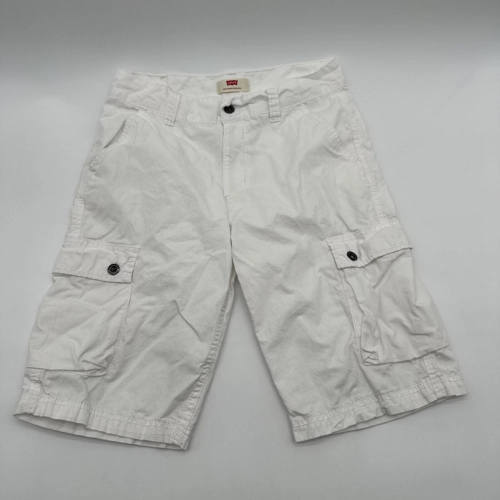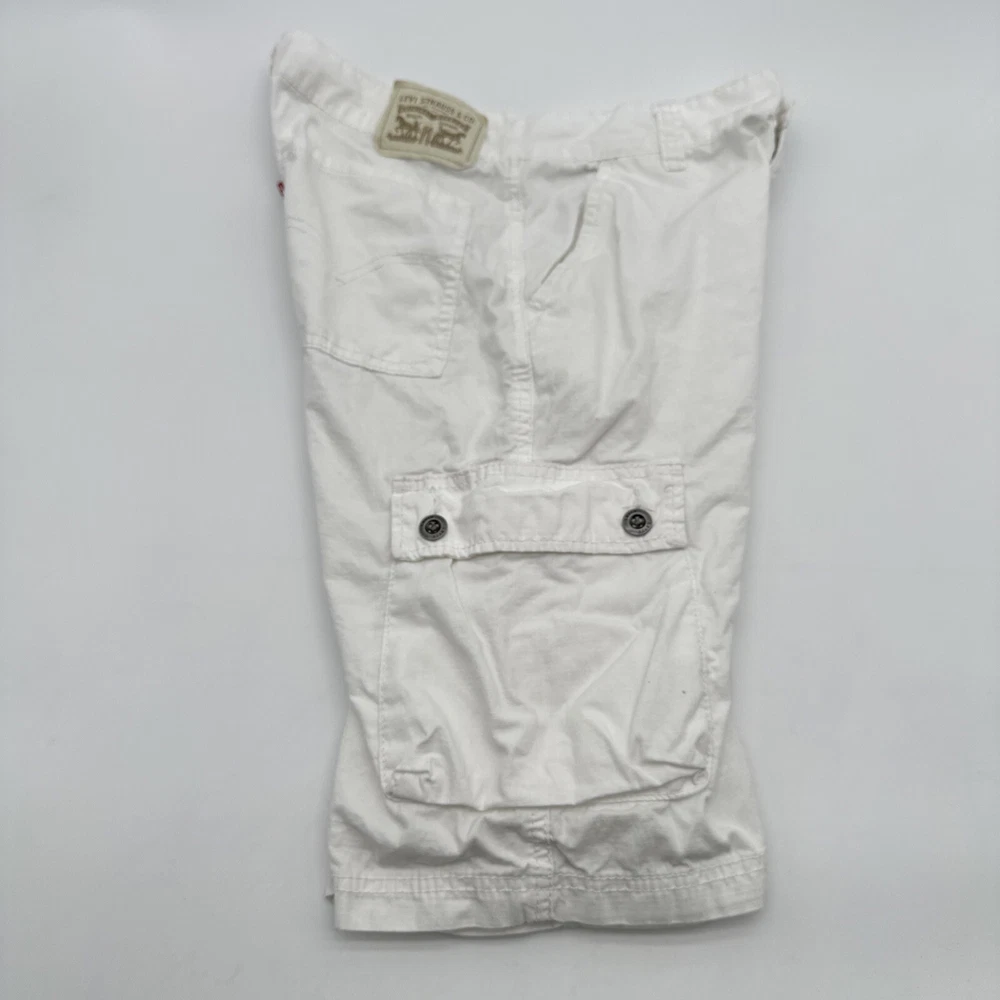 Levi's San Francisco Shorts in white, size W28 for men. These relaxed-fit cargo shorts feature a button closure and a light wash fabric. They have a cargo pocket with a logo accent and are made of cotton. The shorts have a zipper closure and are designed for casual wear, perfect for a spring outdoor theme. Made in Vietnam. Check pictures for flaws and measurements