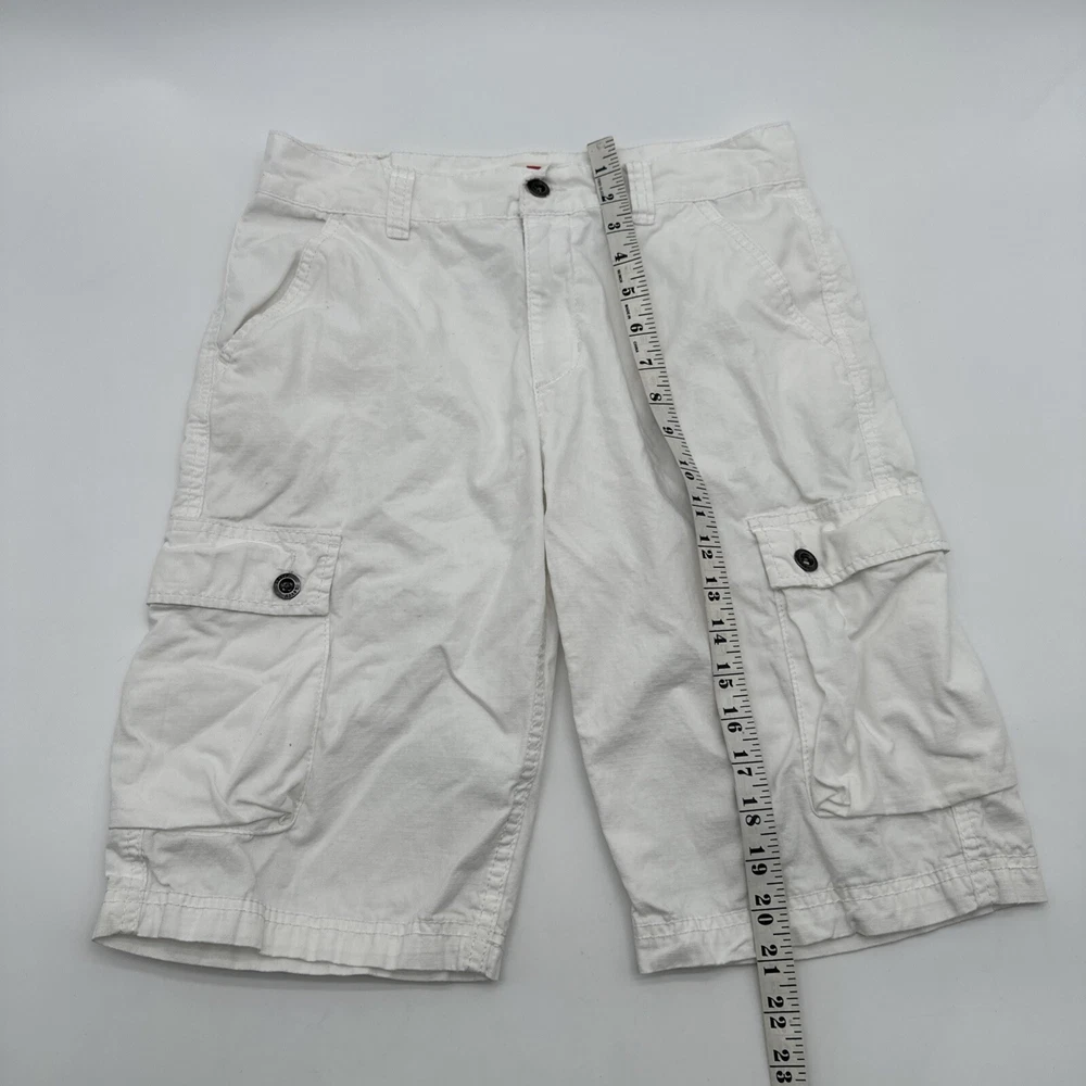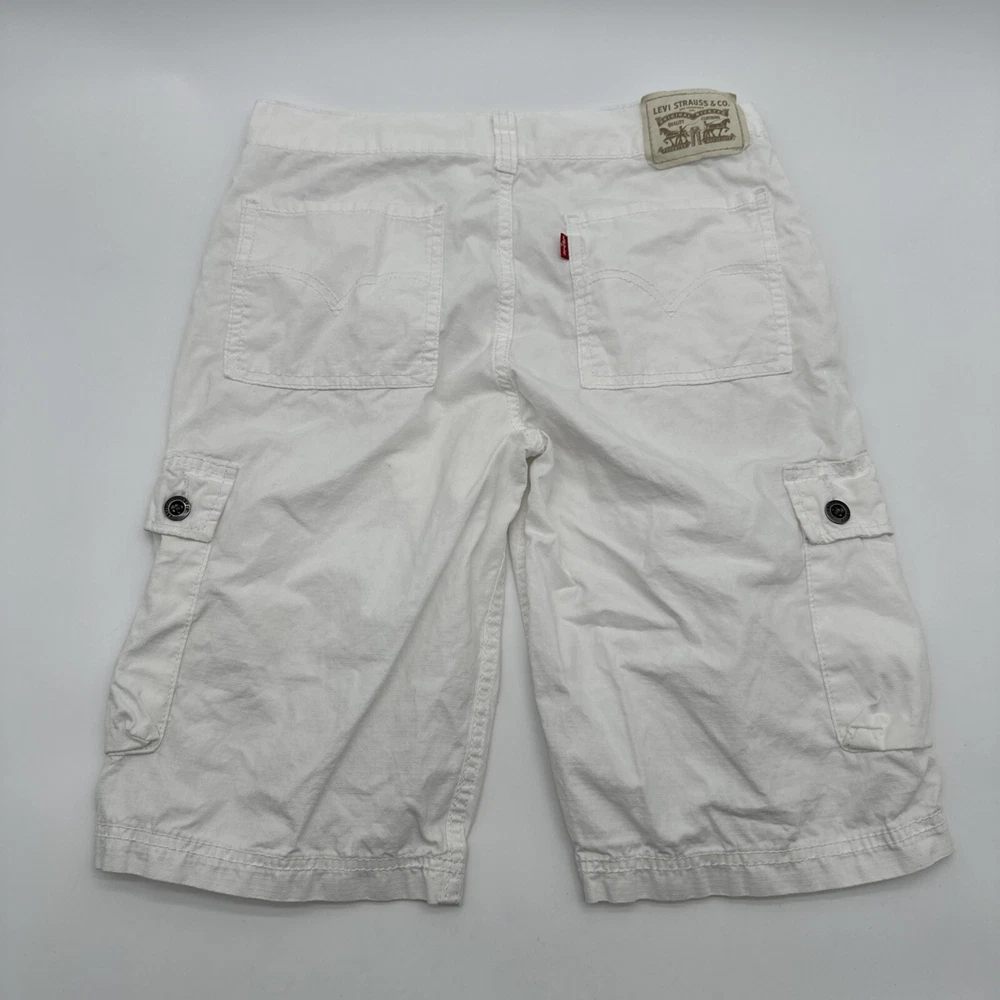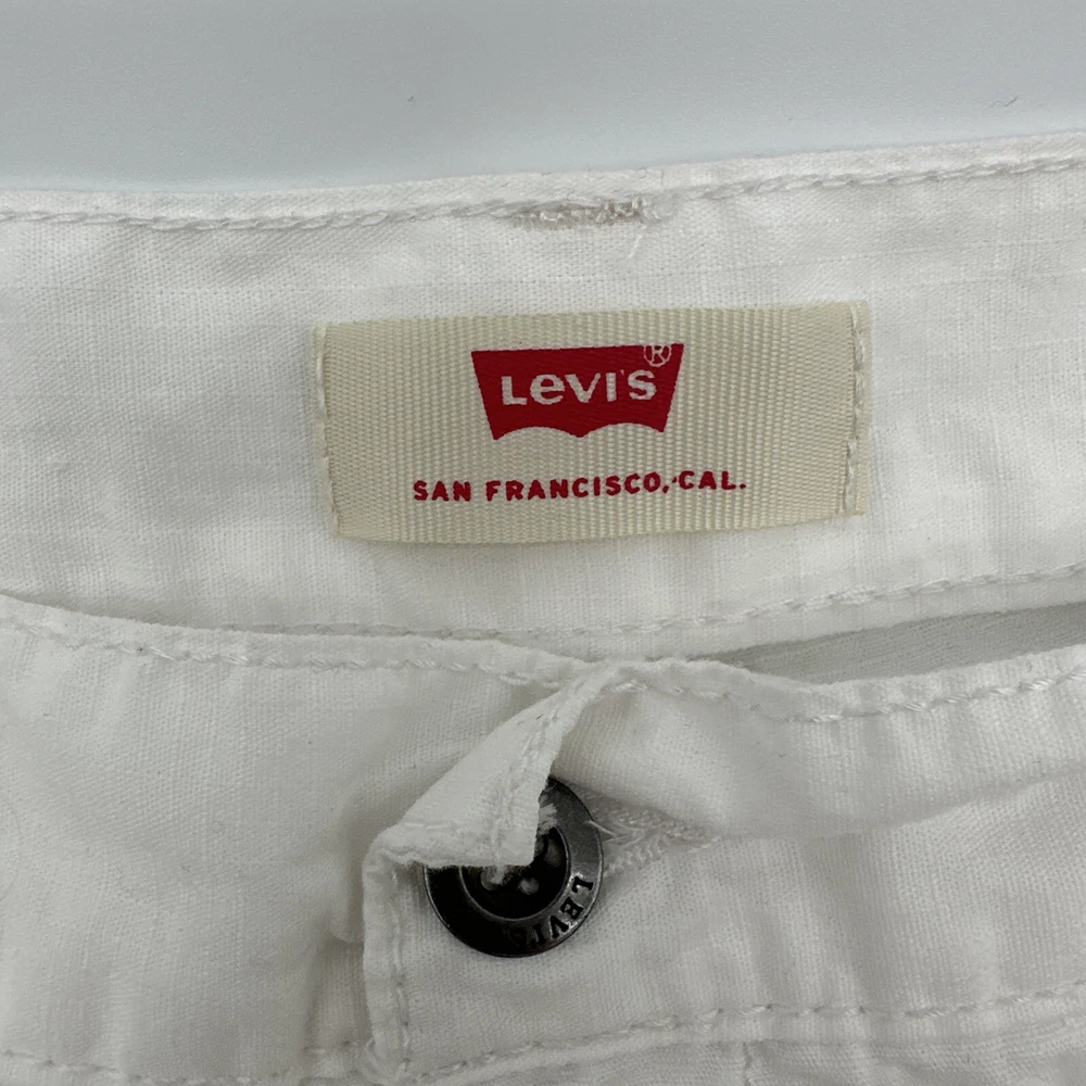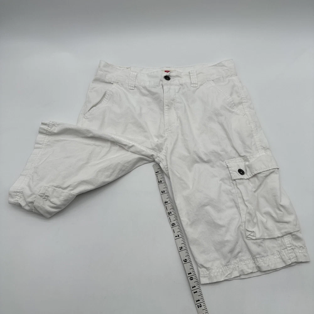Levi's San Francisco Shorts in white, size W28 for men. These relaxed-fit cargo shorts feature a button closure and a light wash fabric. They have a cargo pocket with a logo accent and are made of cotton. The shorts have a zipper closure and are designed for casual wear, perfect for a spring outdoor theme. Made in Vietnam. Check pictures for flaws and measurements