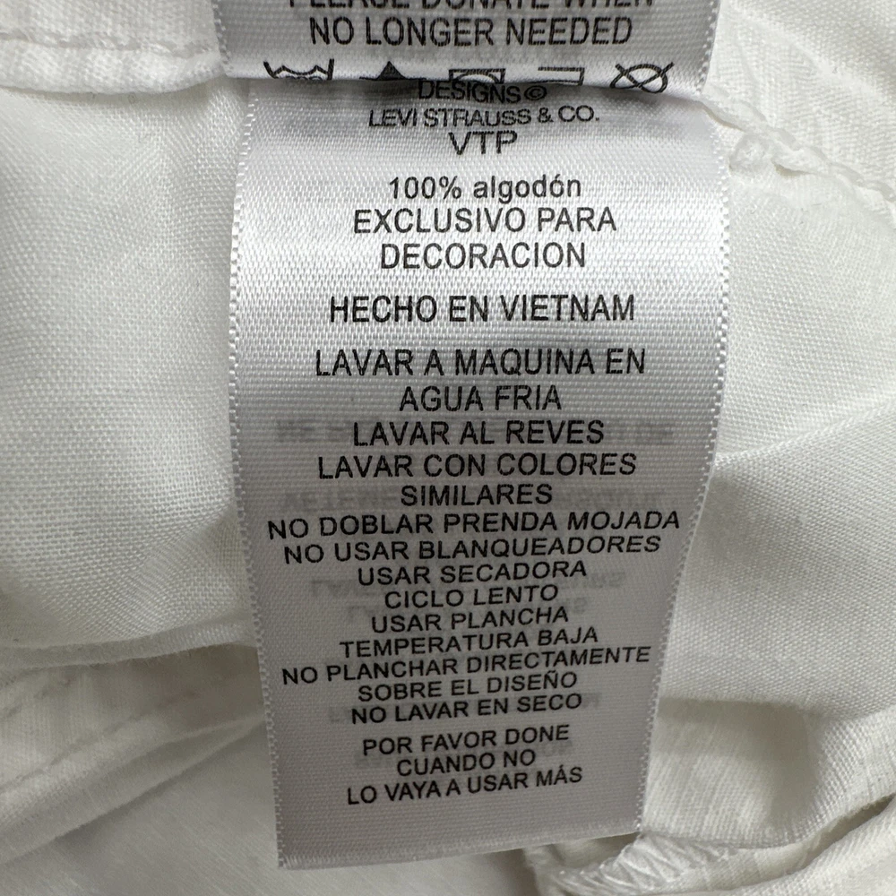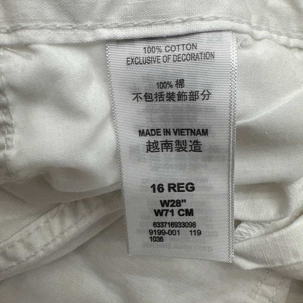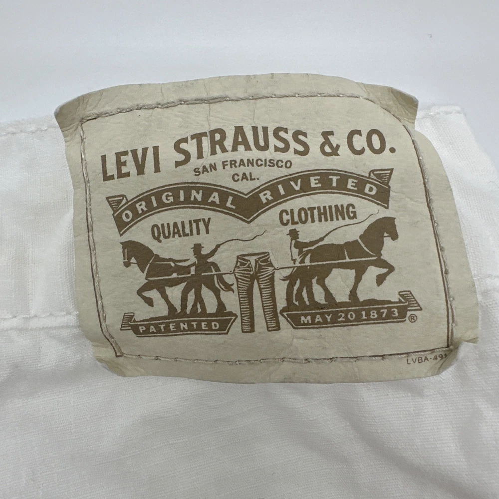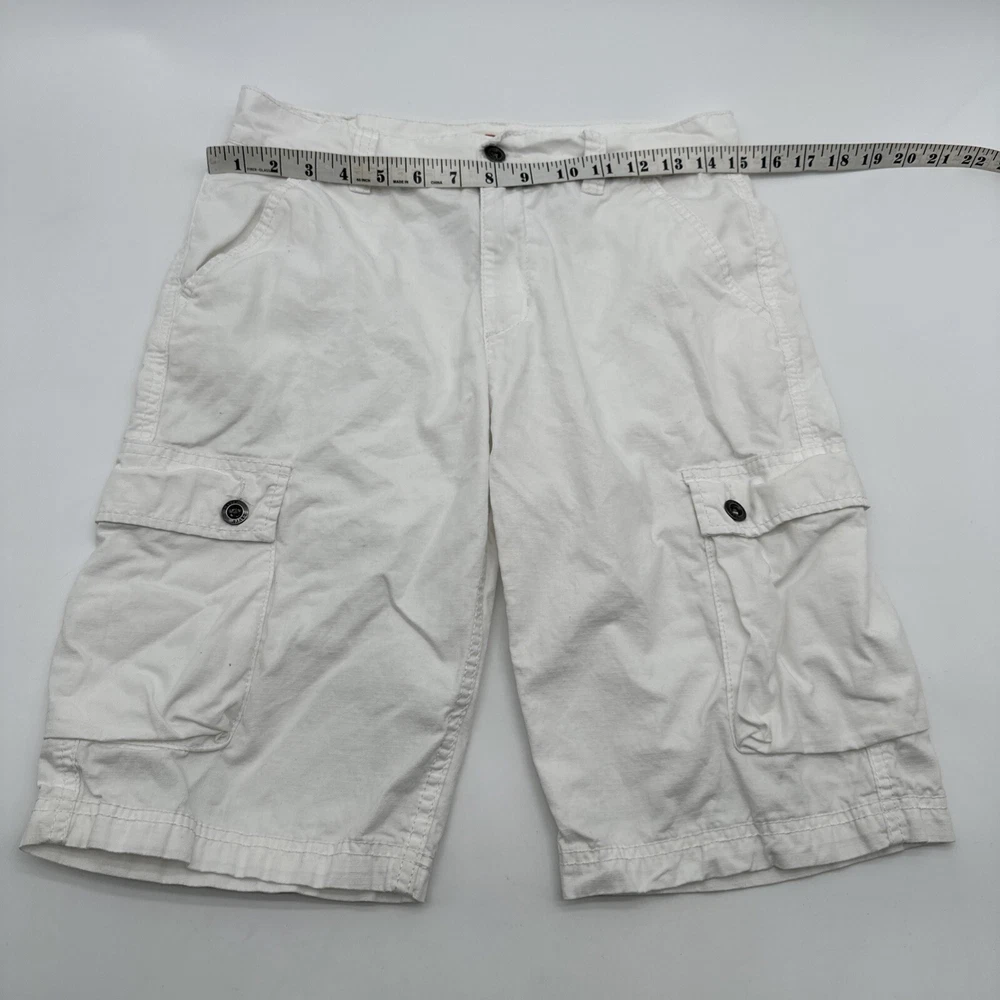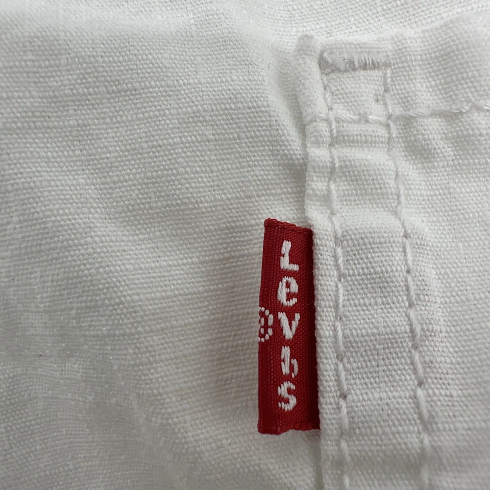 Levi's San Francisco Shorts in white, size W28 for men. These relaxed-fit cargo shorts feature a button closure and a light wash fabric. They have a cargo pocket with a logo accent and are made of cotton. The shorts have a zipper closure and are designed for casual wear, perfect for a spring outdoor theme. Made in Vietnam. Check pictures for flaws and measurements