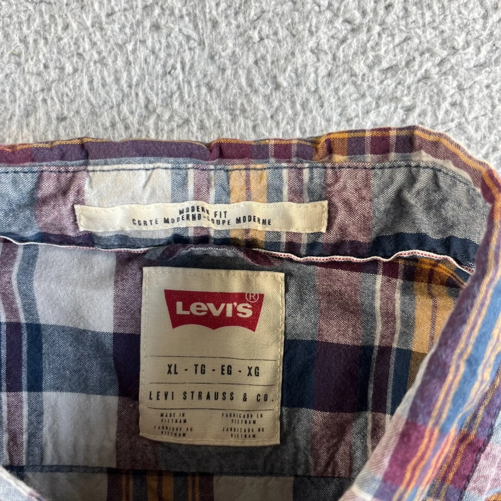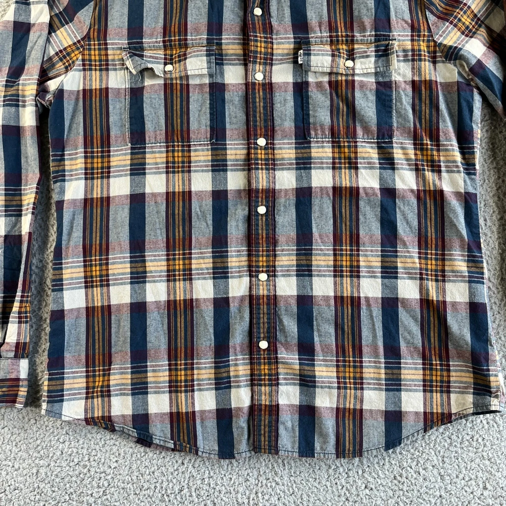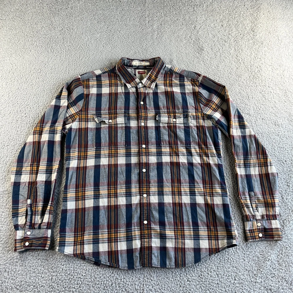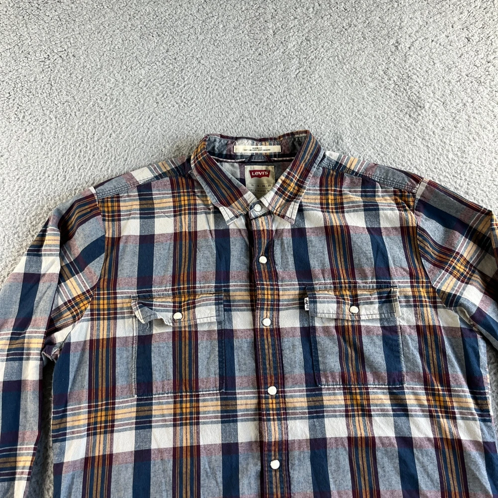 Levi's Shirt Mens Extra Large Blue White Plaid Button Up Modern Fit Pearl Snap Condition: Pre-owned. A small hole in one of the sleeves shown in photos. Otherwise good condition. Please see all photos for condition and measurements. Please let us know if you have any questions. Thanks for shopping with us.