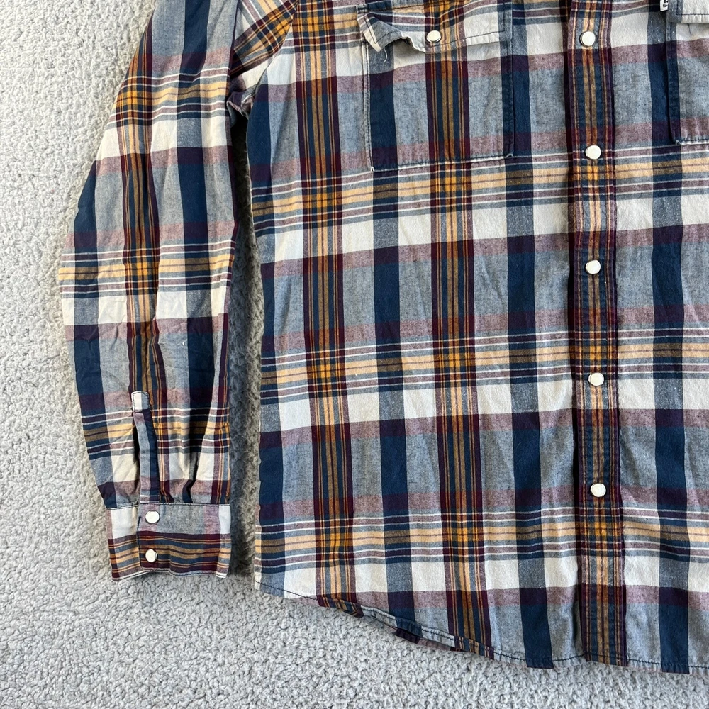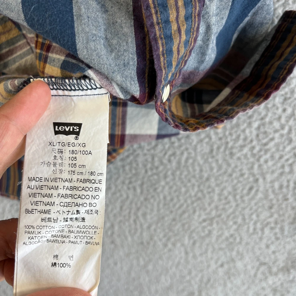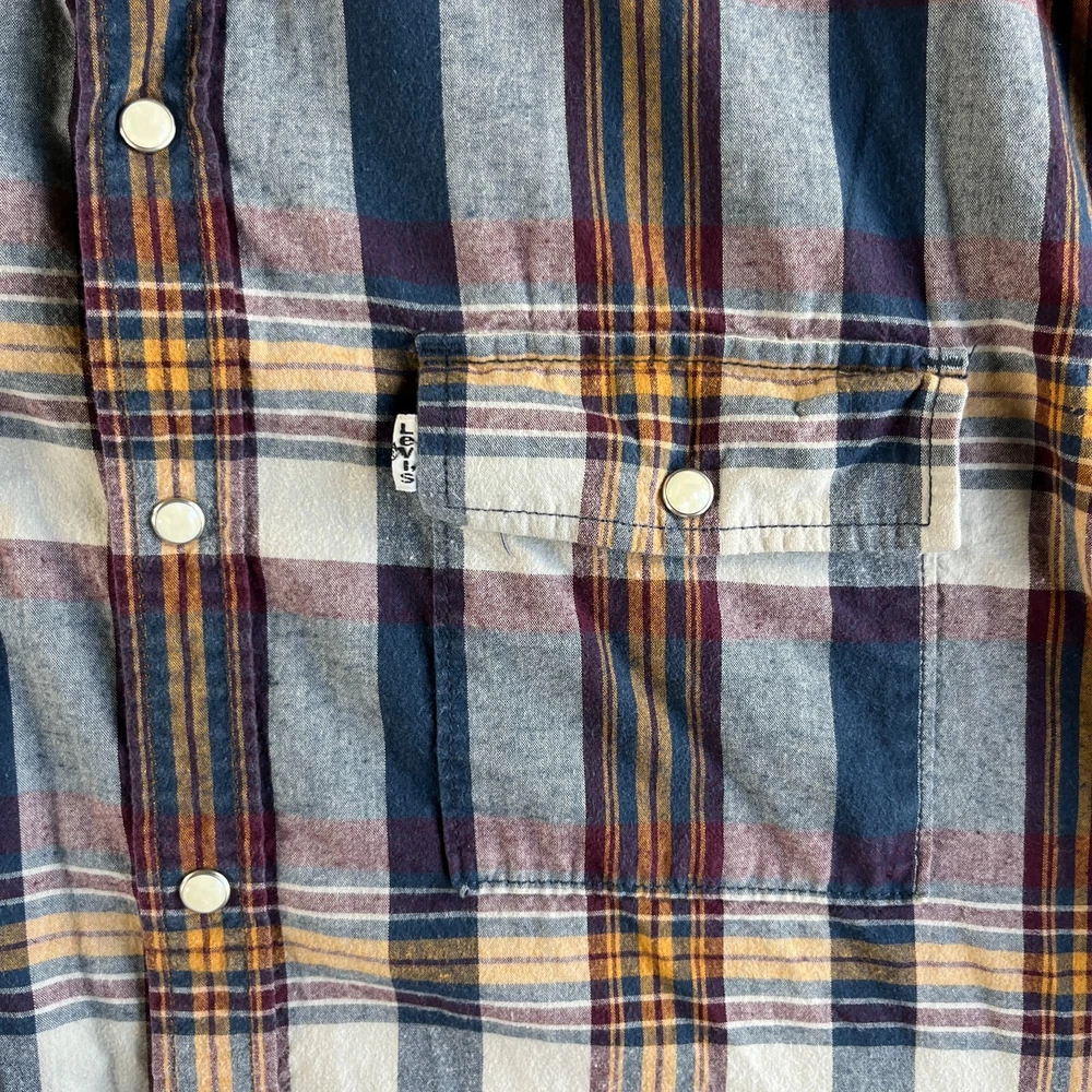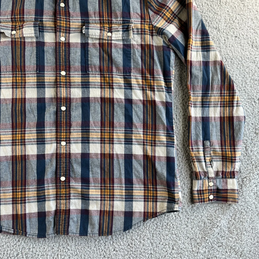 Levi's Shirt Mens Extra Large Blue White Plaid Button Up Modern Fit Pearl Snap Condition: Pre-owned. A small hole in one of the sleeves shown in photos. Otherwise good condition. Please see all photos for condition and measurements. Please let us know if you have any questions. Thanks for shopping with us.