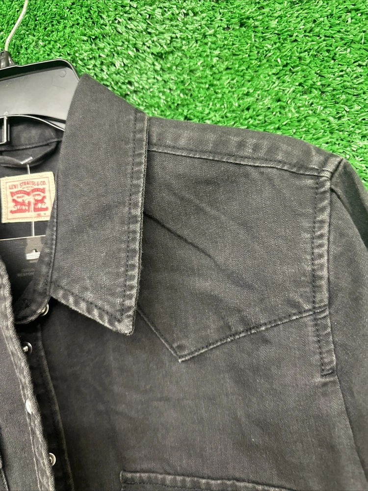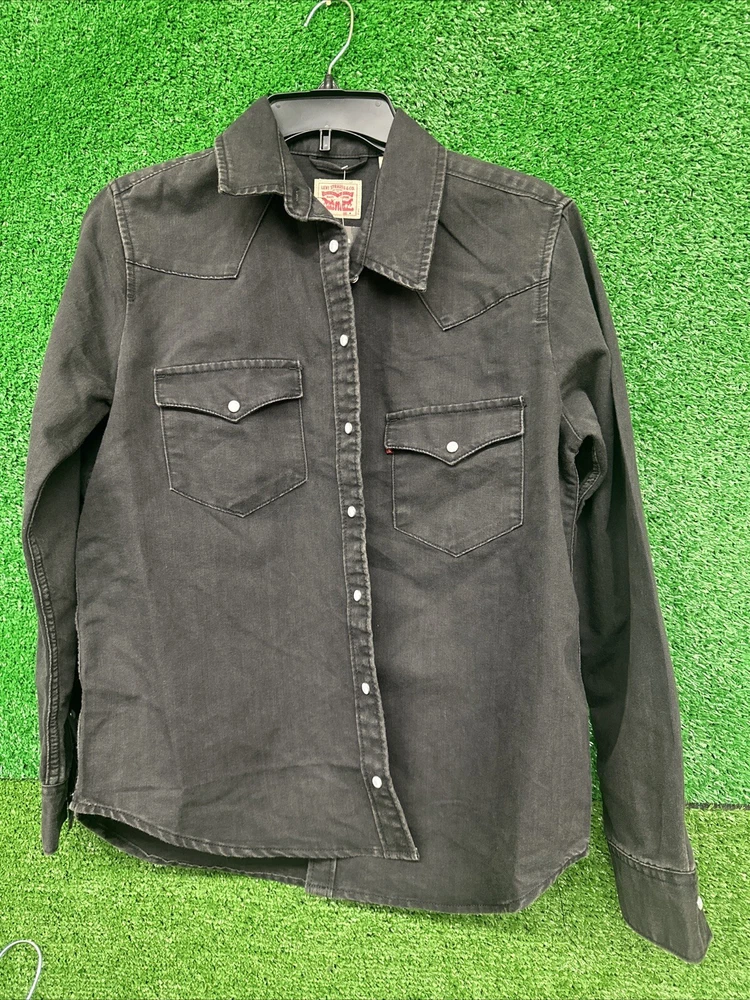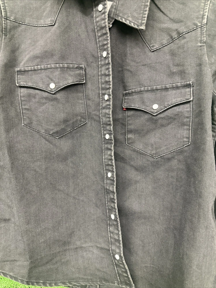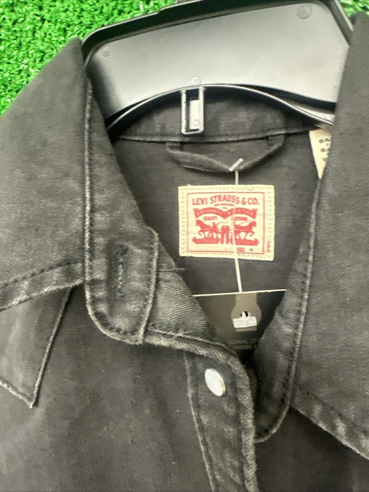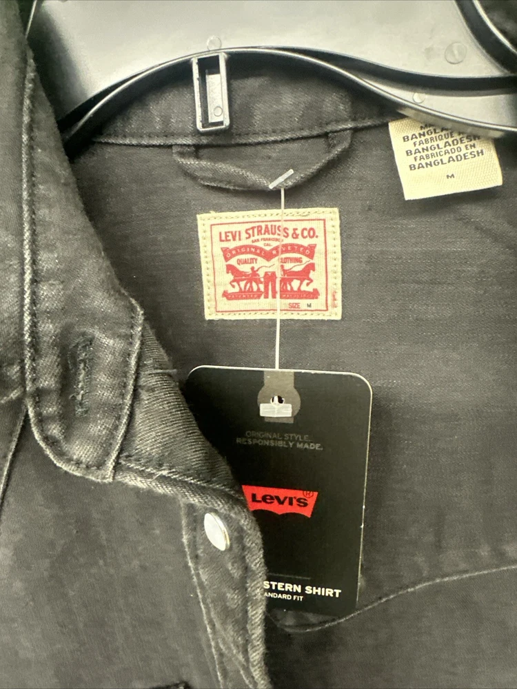 This Levi's shirt is a men's medium in black, featuring a solid plaid design with pearl snap closures and a button-down collar. Made of cotton, it has a regular fit and a Western theme, with a graphic print detail. It is suitable for workwear and is machine washable. Perfect for both casual and semi-formal occasions. SKU: c77 Date:1:21/25 Listed:ah Conditions:new with tag Size/shade:black medium