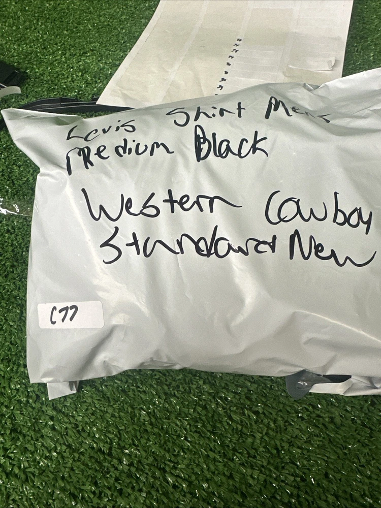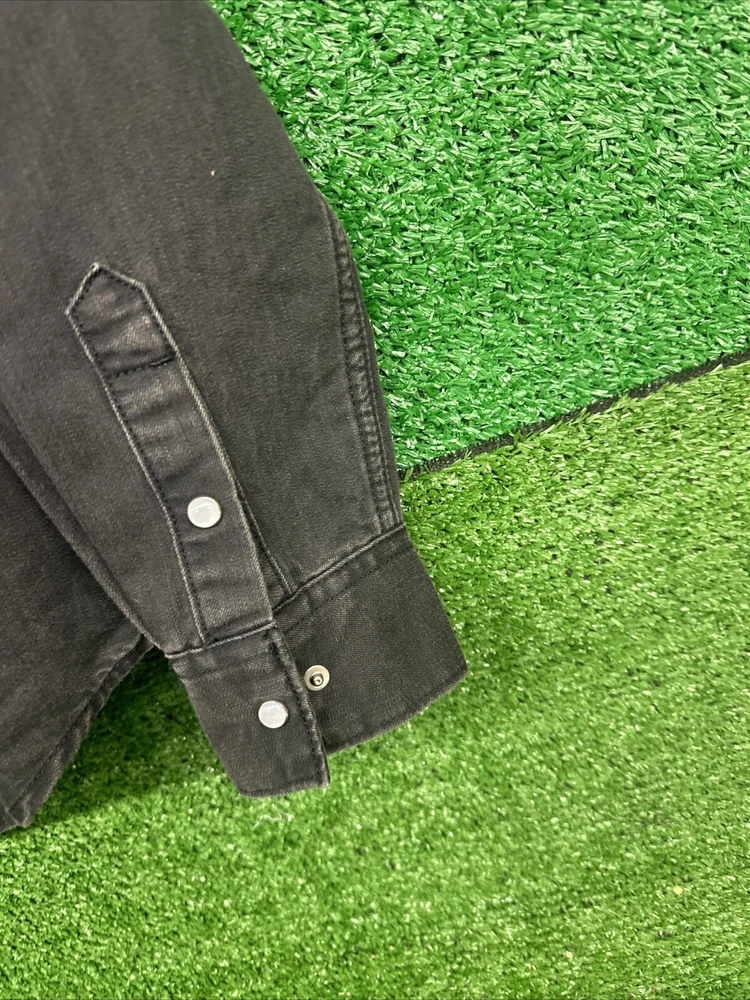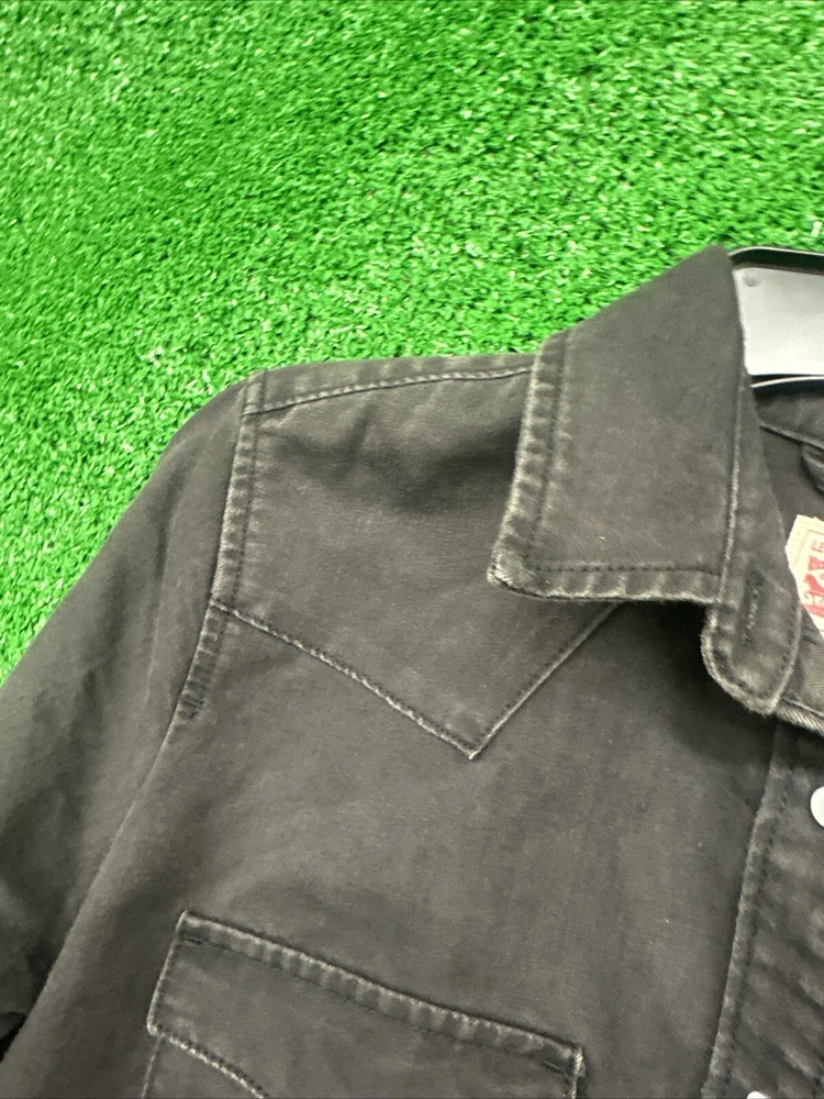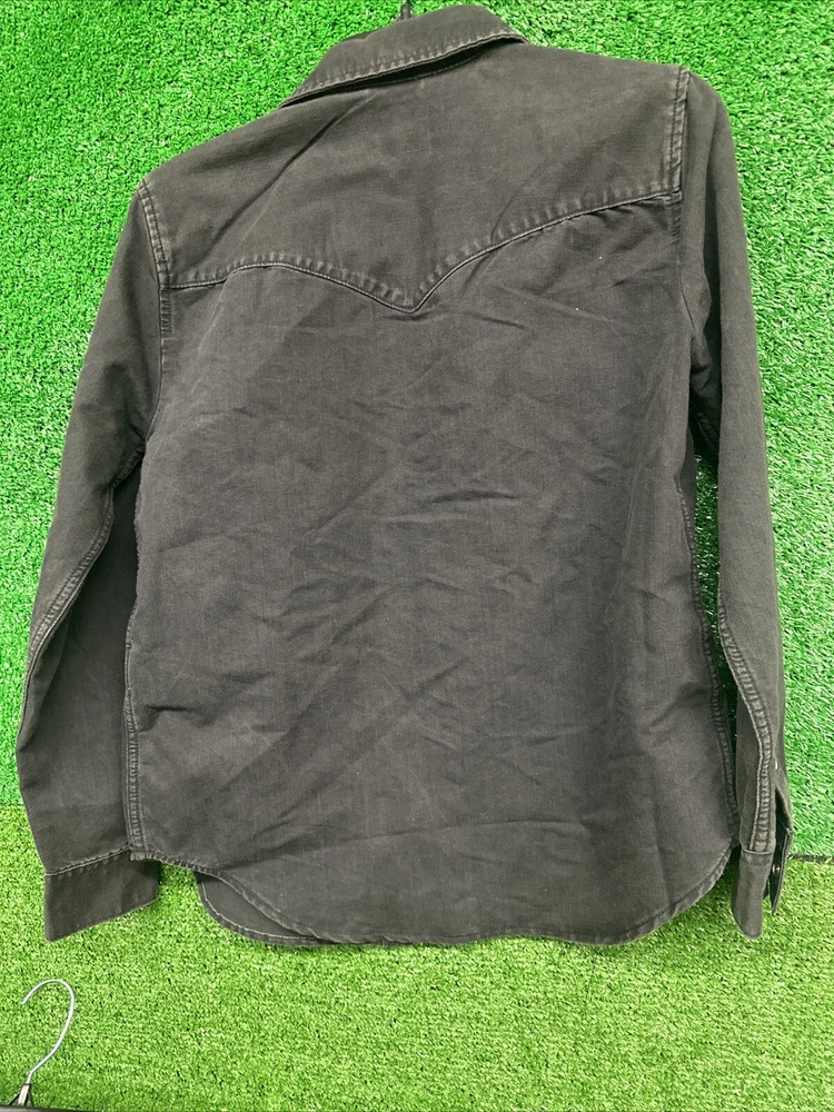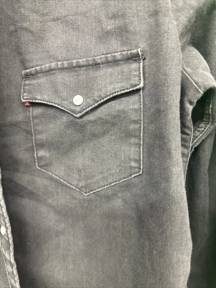 This Levi's shirt is a men's medium in black, featuring a solid plaid design with pearl snap closures and a button-down collar. Made of cotton, it has a regular fit and a Western theme, with a graphic print detail. It is suitable for workwear and is machine washable. Perfect for both casual and semi-formal occasions. SKU: c77 Date:1:21/25 Listed:ah Conditions:new with tag Size/shade:black medium