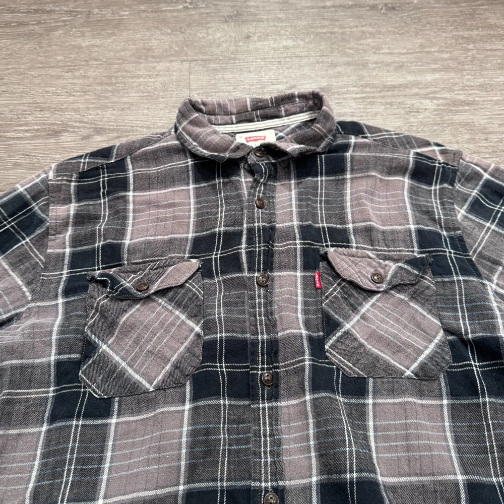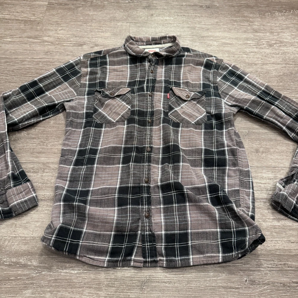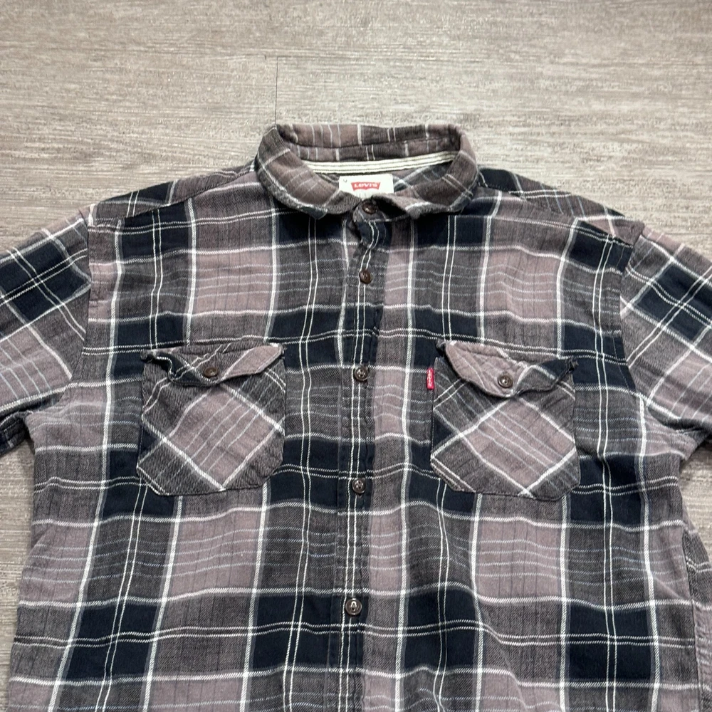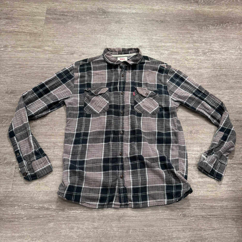 Theme: Classic, Western Type: Button-Up Department: Men Closure: Button Season: Spring, Winter Fit: Regular Neckline: Collared Size: M Material: Cotton Color: Gray Brand: Levi's Pattern: Plaid Size Type: Regular Occasion: Casual, Travel Accents: Logo Sleeve Length: Long Sleeve Character: Blue Collar Style: Button-Down Country/Region of Manufacture: Philippines Fabric Type: Flannel Features: All Seasons Garment Care: Machine Washable