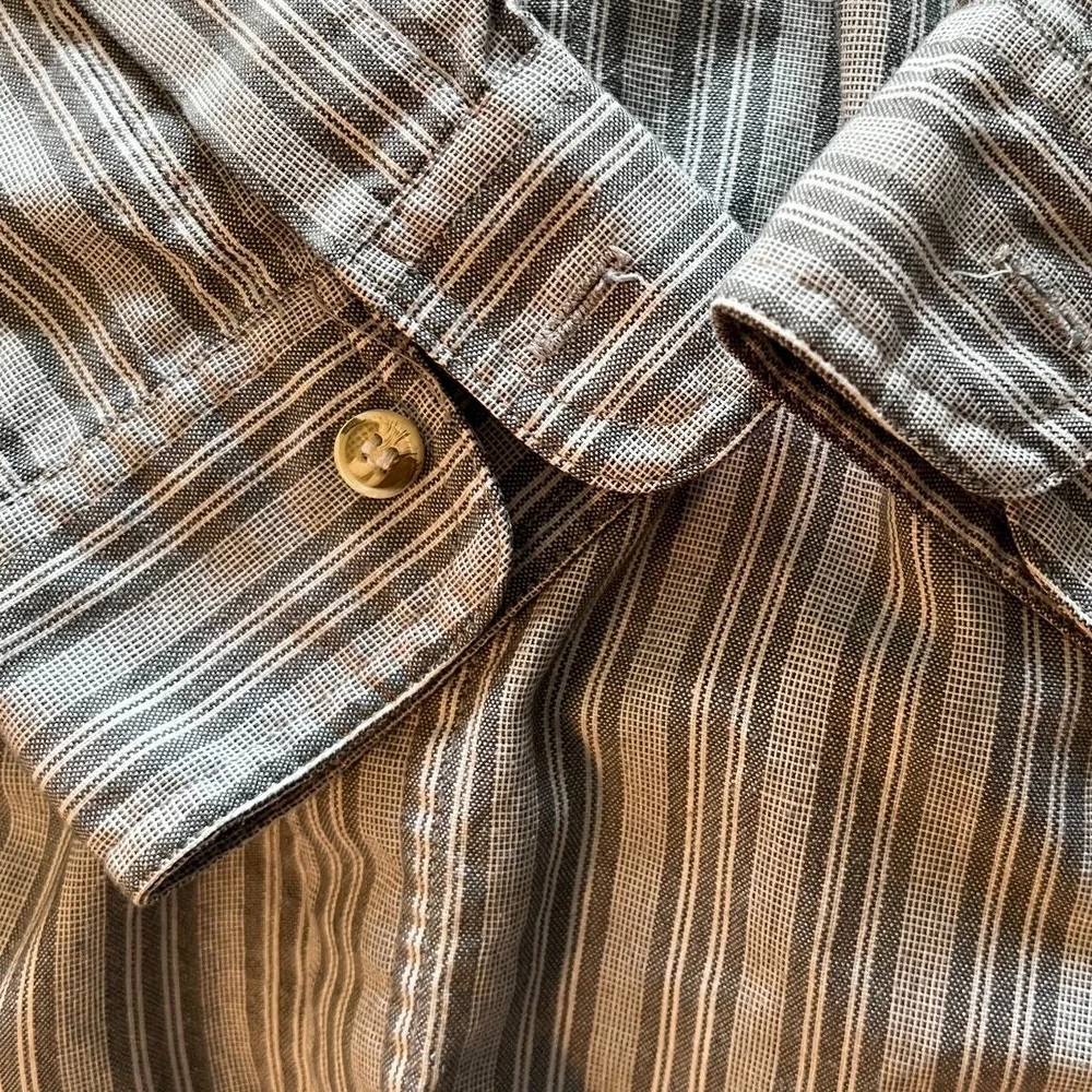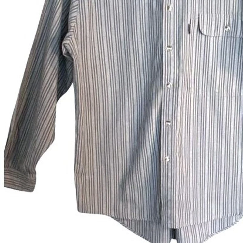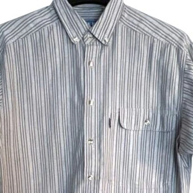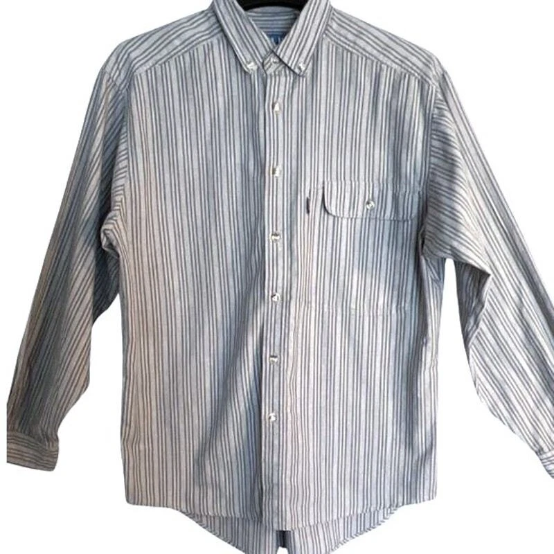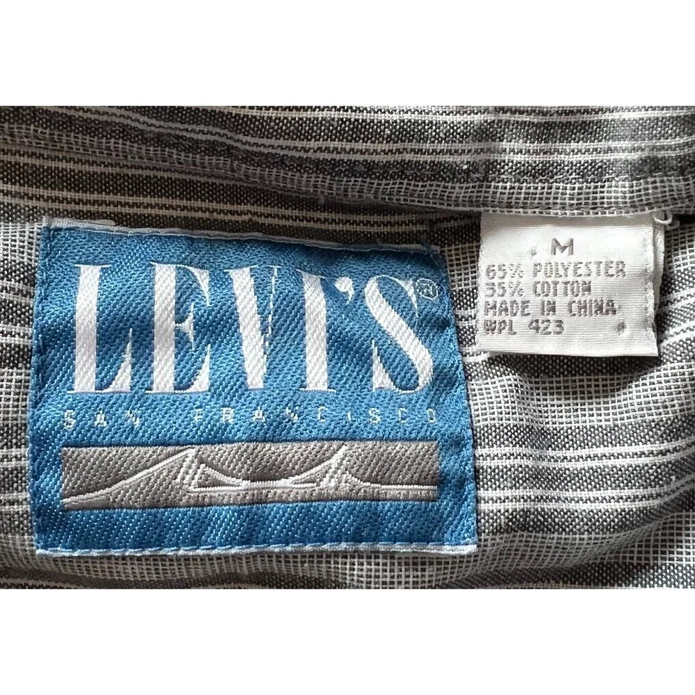 22" armpit to armpit 19" shoulder to shoulder 16" armpit to hem 21" armpit to cuff excellent condition, no flaws Levi's San Francisco ** button-up shirt ** blue and gray pinstripe pattern ** collared neckline ** polyester and cotton blend ** breathable and suitable for all seasons ** long sleeves, a regular fit, and button-down collar ** pocket ** all items stored in a smoke-free & pet free home