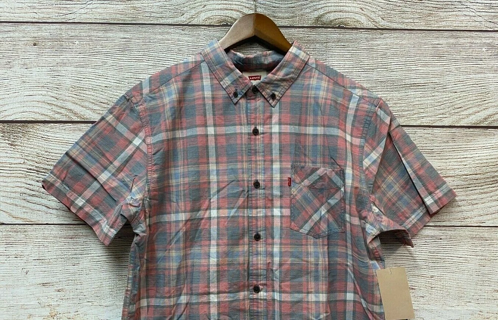 Collar Style:Button-DownUPC:884411430171Color:Pink Blue Green WhiteVintage:NoDepartment:MenTheme:TropicalSize Type:RegularOccasion:CasualNeckline:CollaredBrand:Levi'sSize:XLClosure:ButtonFit:SlimPattern:PlaidMaterial:100% CottonFabric Type:PoplinType:Button-UpSleeve Length:Short Sleevegtin13:884411430171