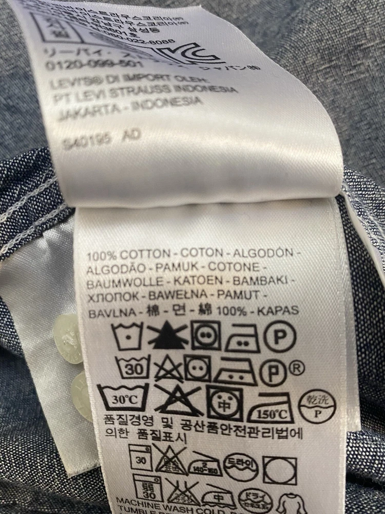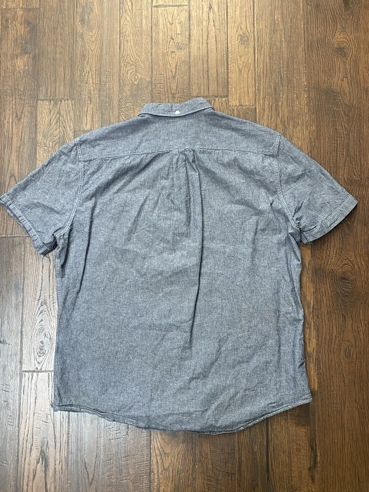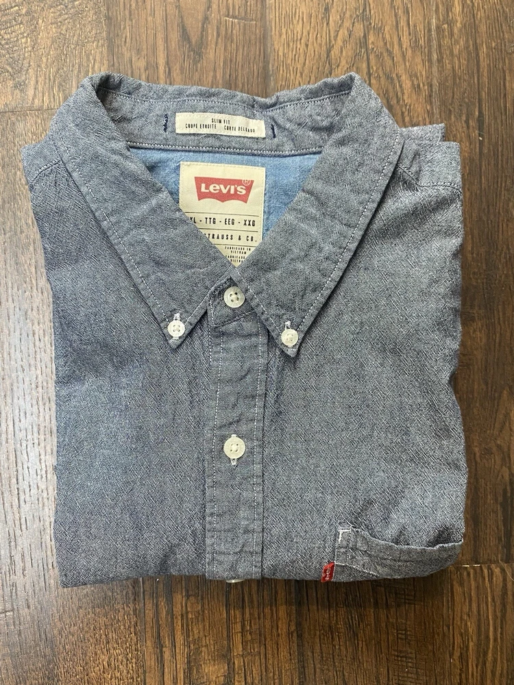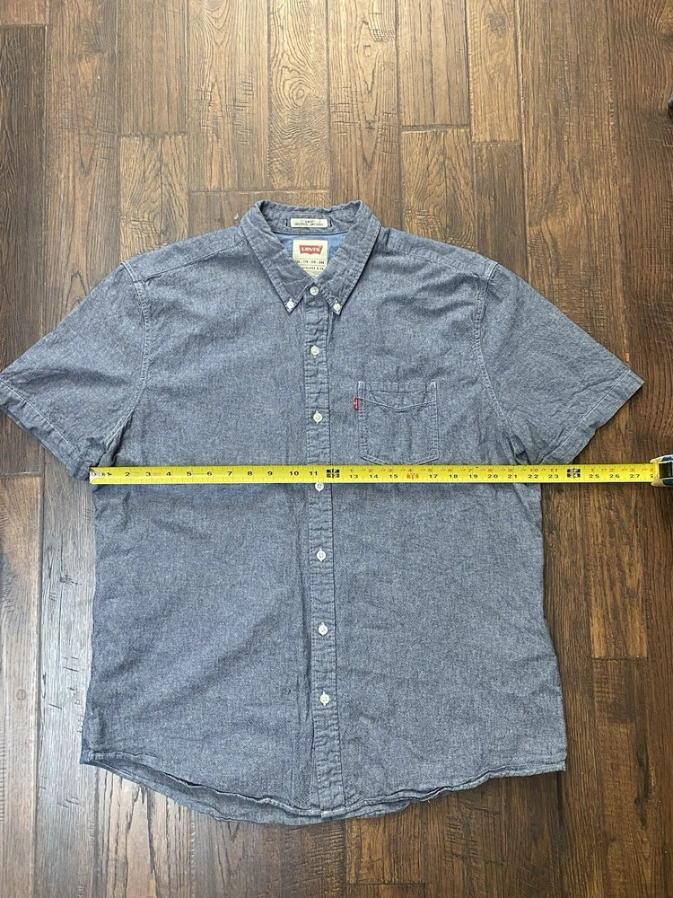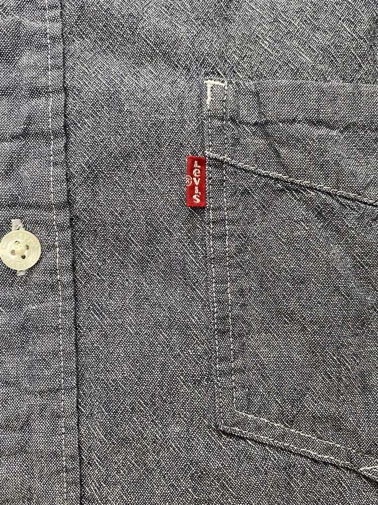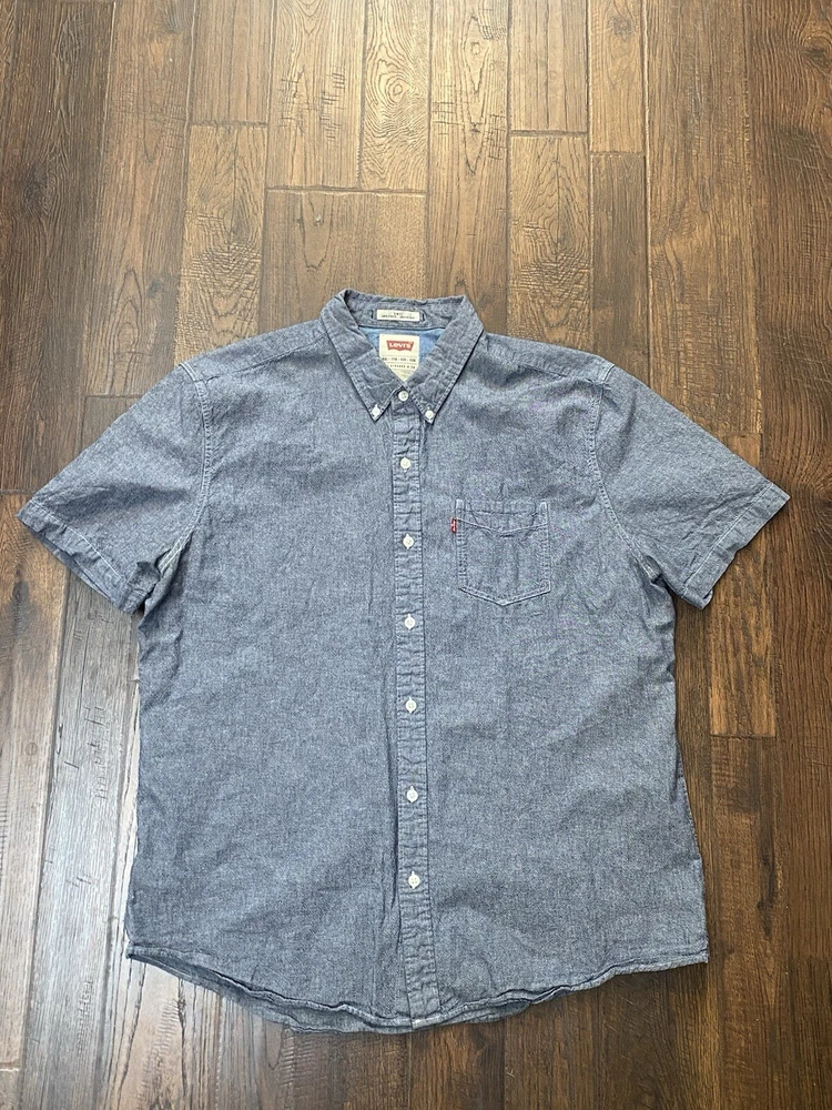 This Levi's shirt is a men's size 2XL in a blue-gray chambray fabric. It features a collared neckline with a button-down style, short sleeves, and a front pocket. The shirt has a classic Western theme with button accents and the Levi's logo. It is suitable for casual occasions and can be worn in all seasons. Easy to care for with machine washable cotton material.