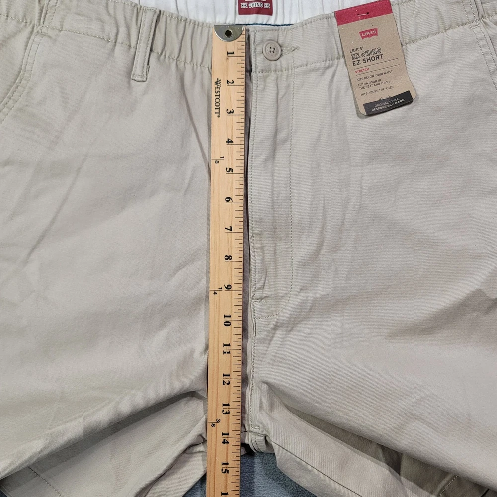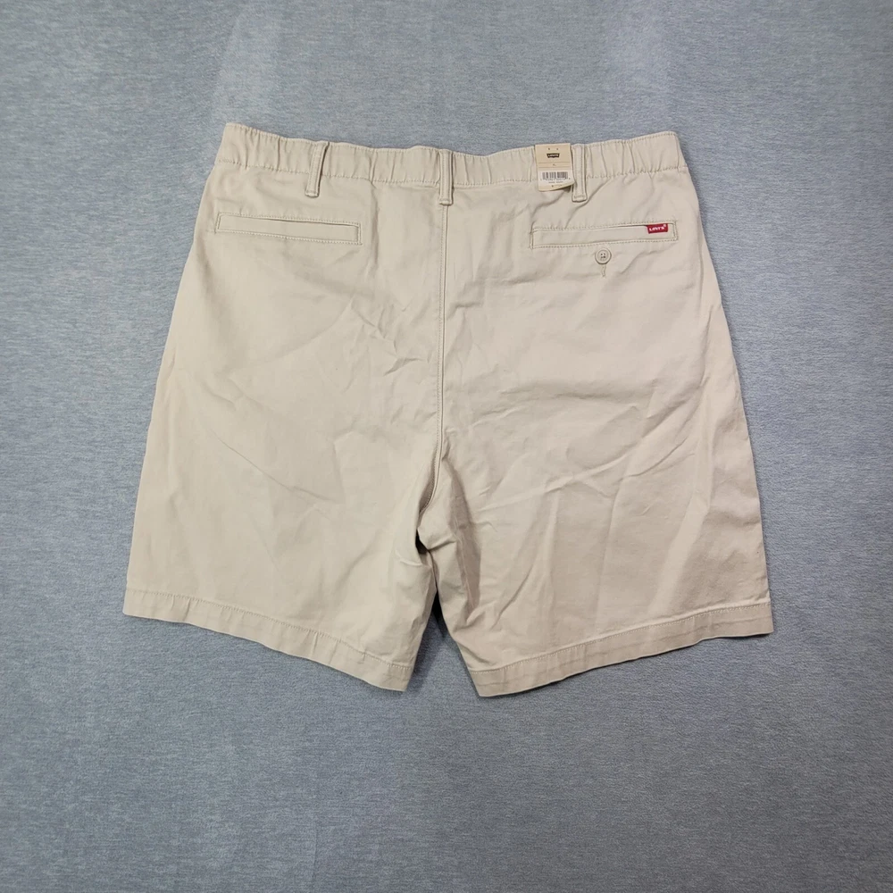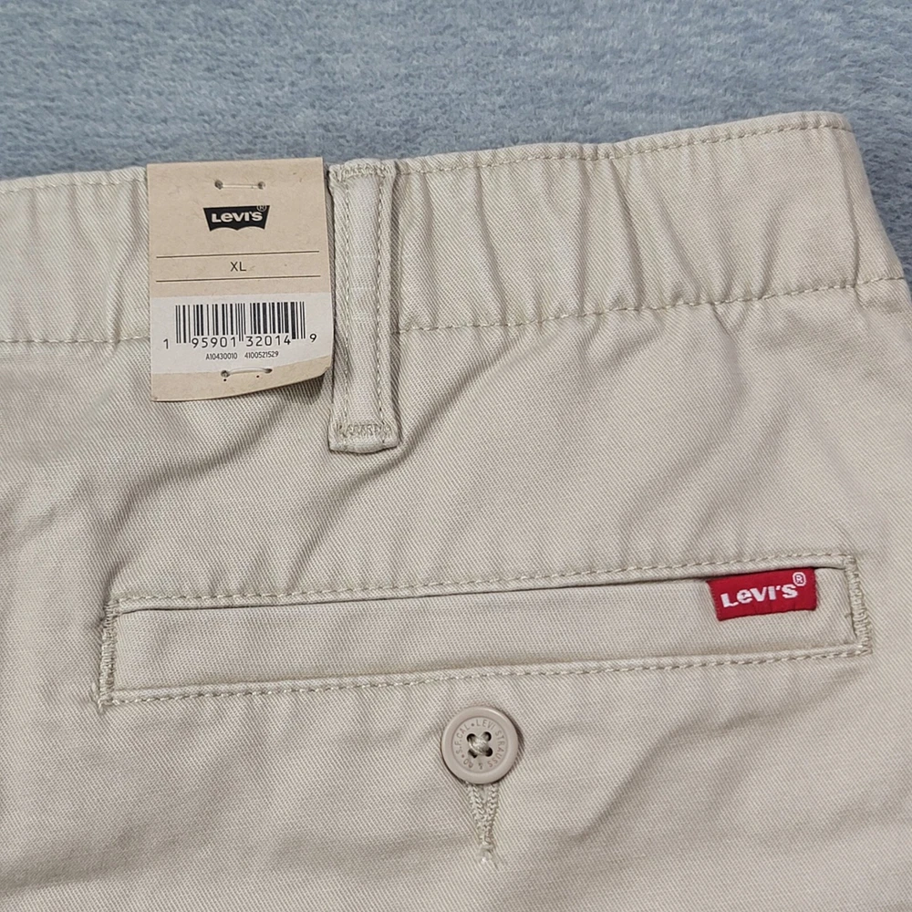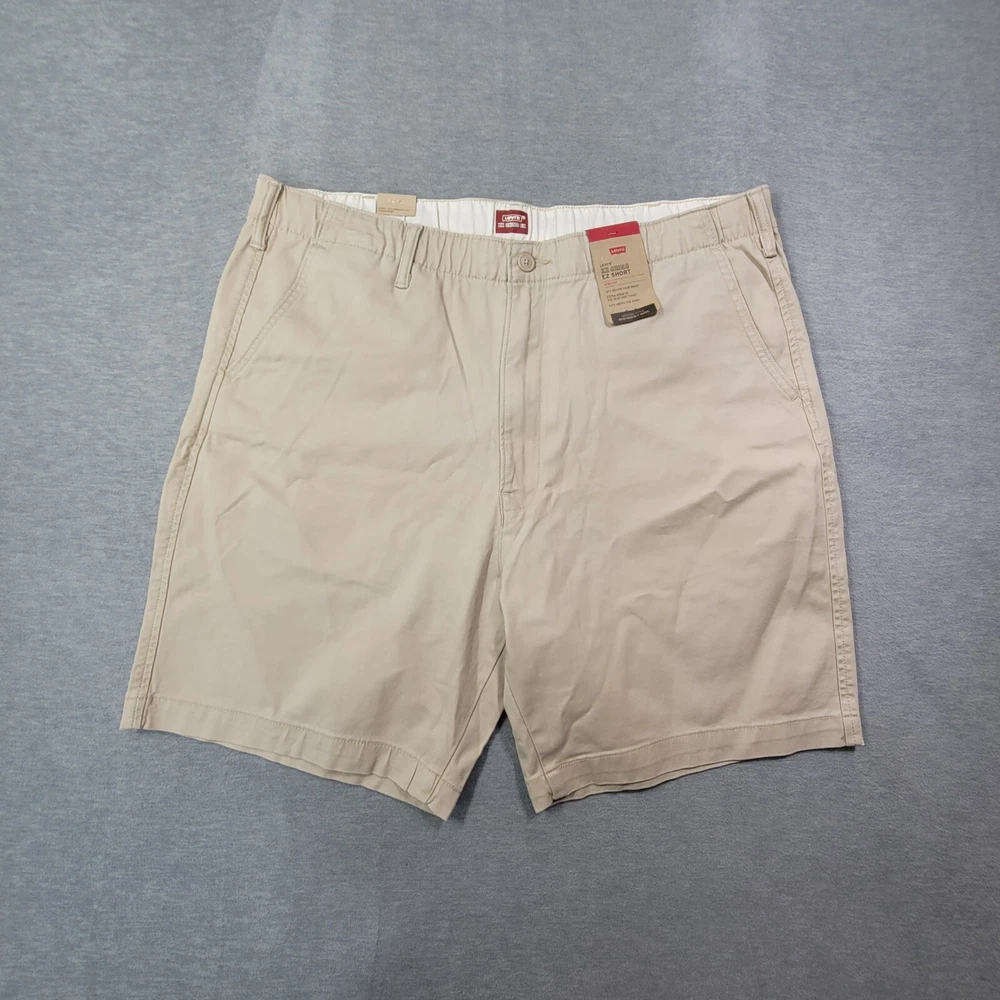 These Levi's men's shorts in size XL feature a solid beige color with a chino style and a flat front design. They are made of a comfortable blend of spandex and cotton with stretch properties for ease of movement. The shorts have a high rise waist of 39 inches and a regular fit, providing a casual and comfortable option for everyday wear. The zip closure and new with tags (NWT) condition add to the appeal of these versatile and stylish shorts.