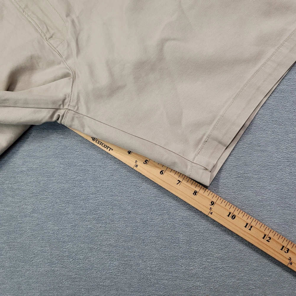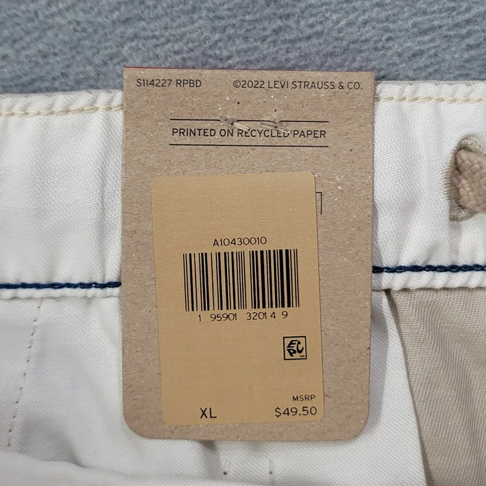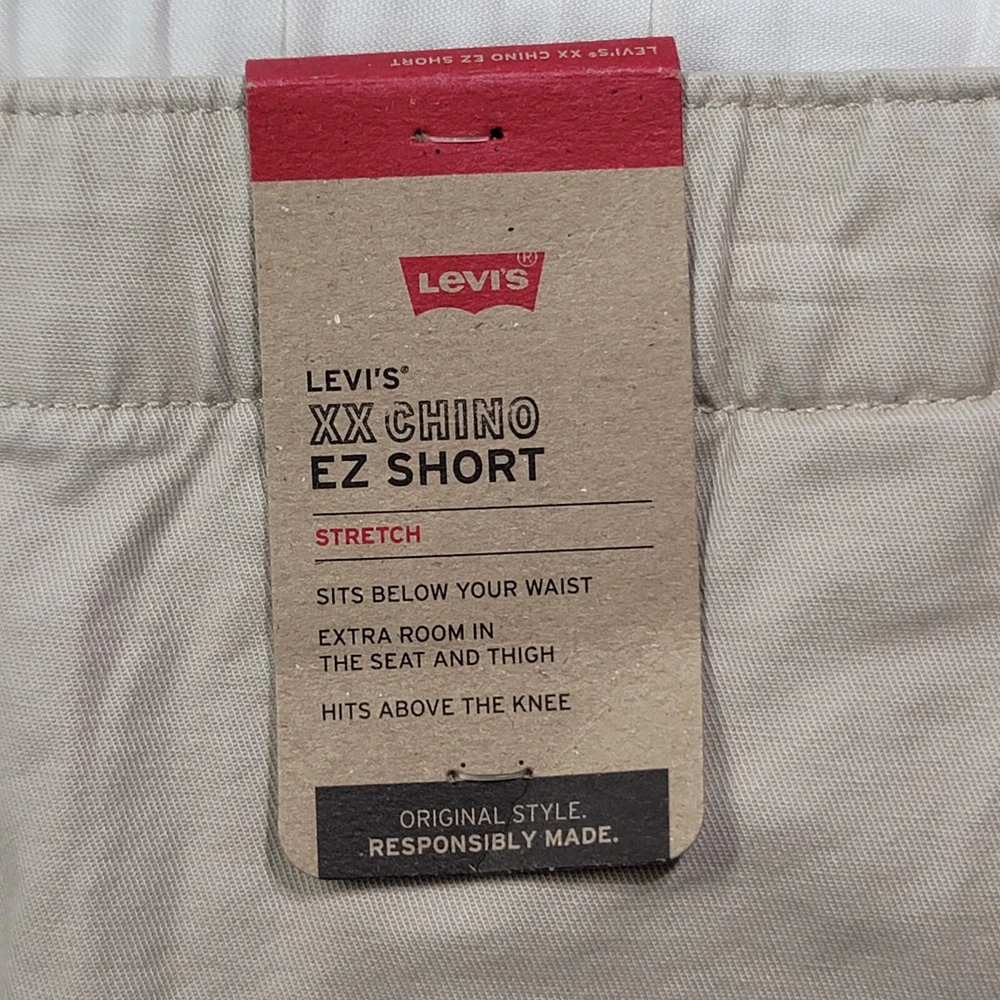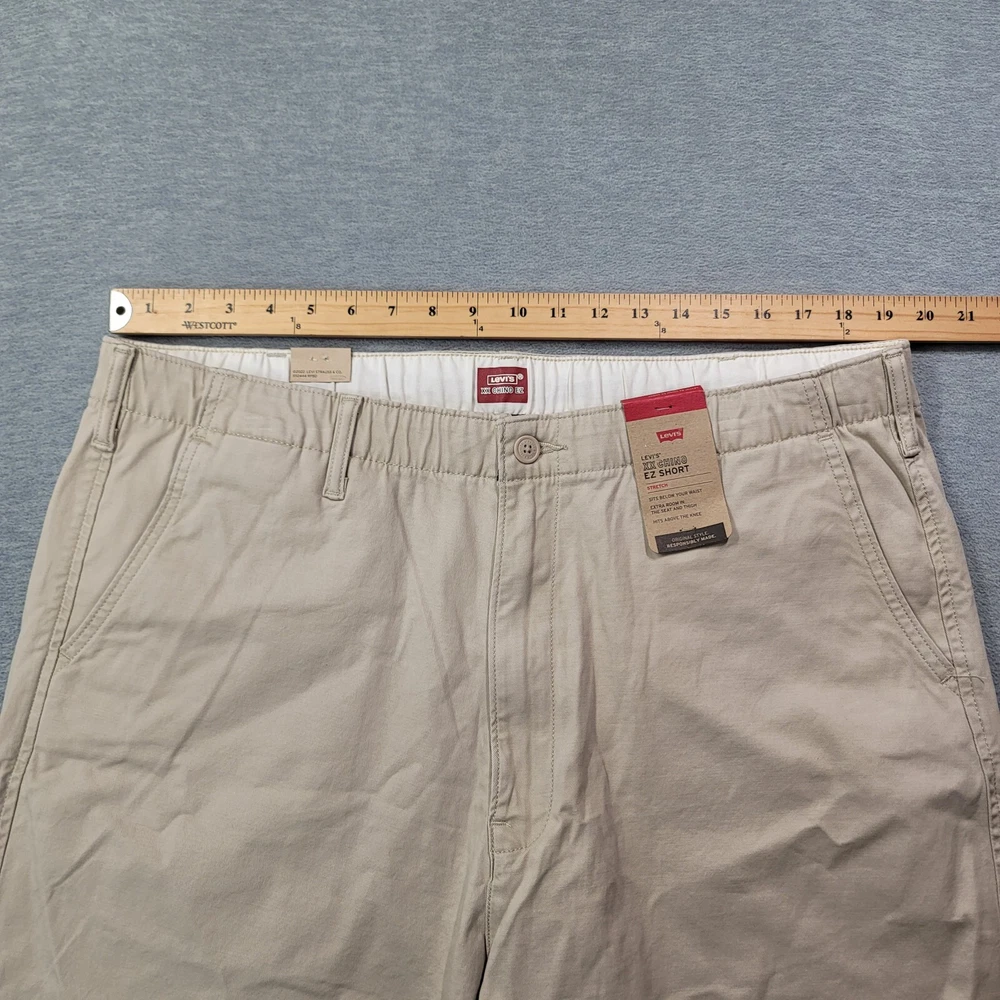 These Levi's men's shorts in size XL feature a solid beige color with a chino style and a flat front design. They are made of a comfortable blend of spandex and cotton with stretch properties for ease of movement. The shorts have a high rise waist of 39 inches and a regular fit, providing a casual and comfortable option for everyday wear. The zip closure and new with tags (NWT) condition add to the appeal of these versatile and stylish shorts.