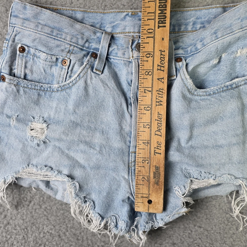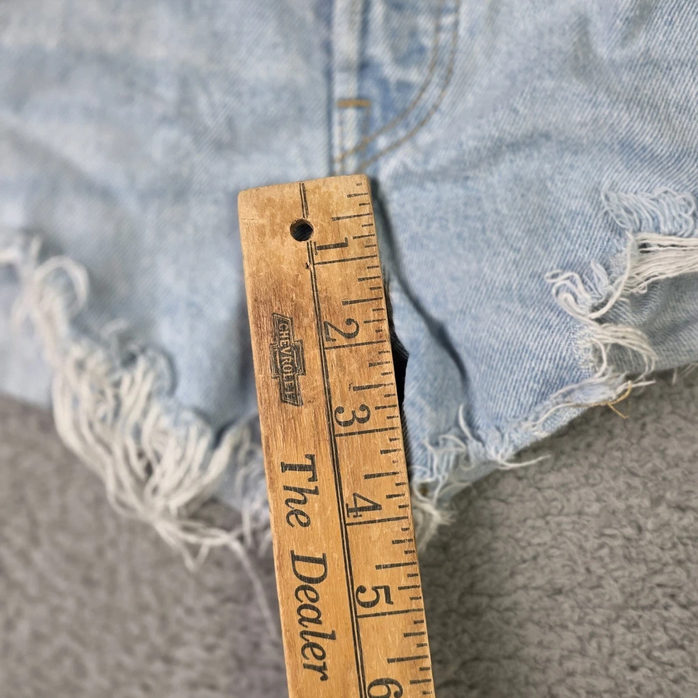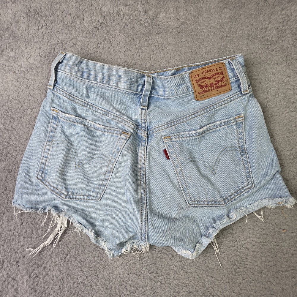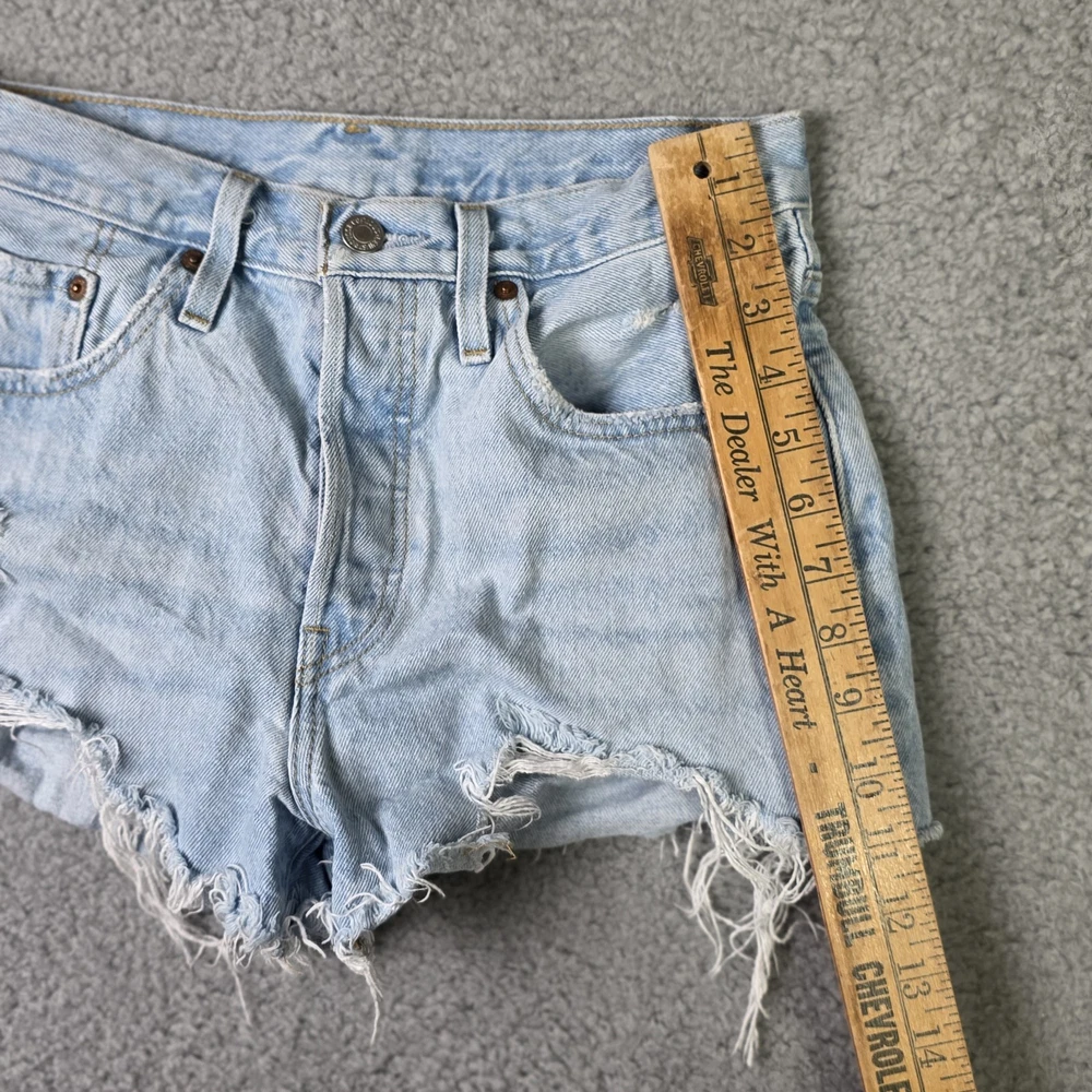 Levis 501 Cut Off Shorts Womens 28" Waist, 4" Inseam, 11" Overall Length Blue Denim Button Fly Distressed Good Overall Condition