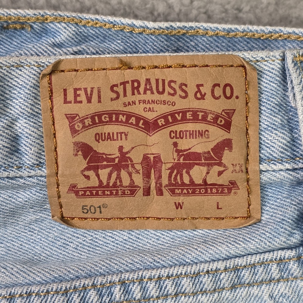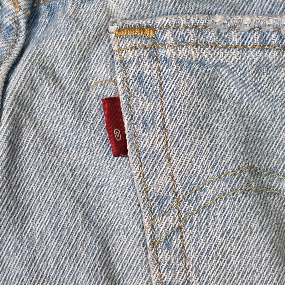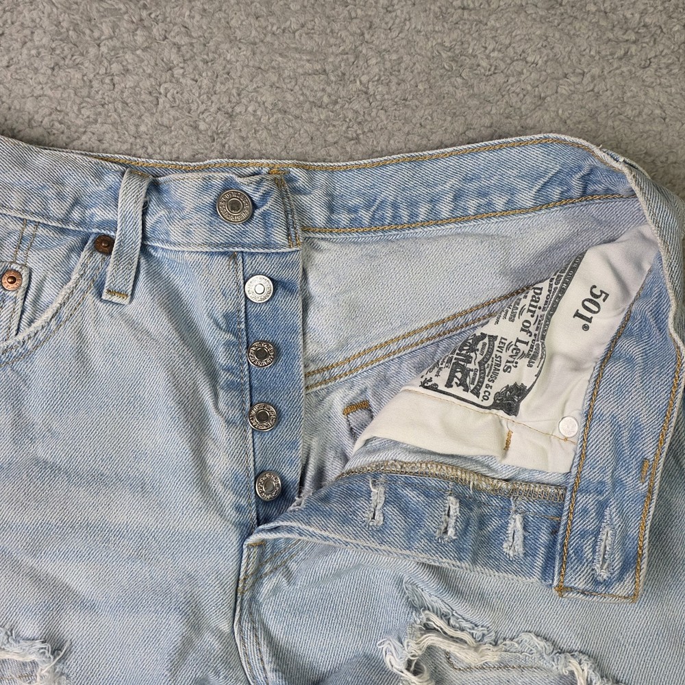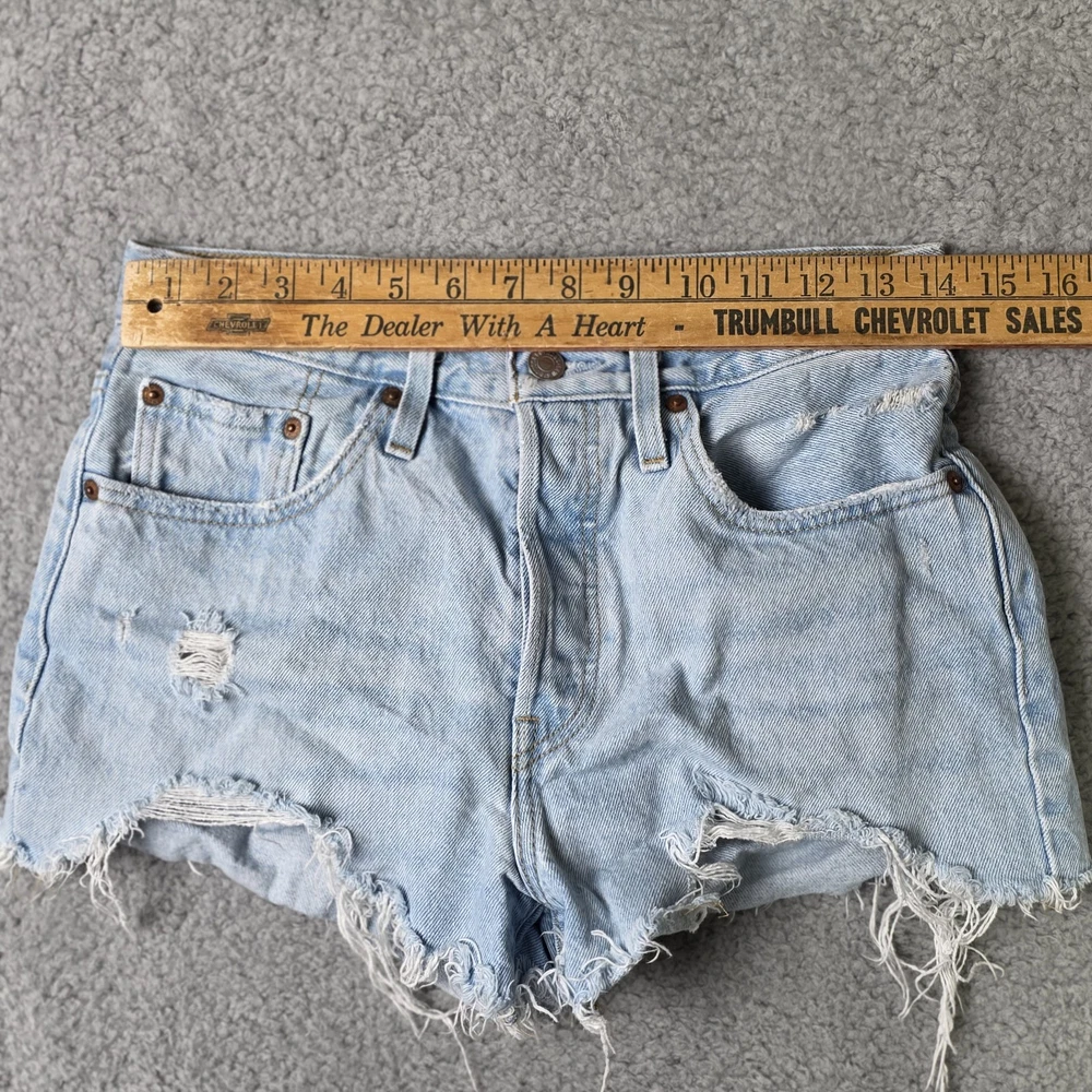 Levis 501 Cut Off Shorts Womens 28" Waist, 4" Inseam, 11" Overall Length Blue Denim Button Fly Distressed Good Overall Condition