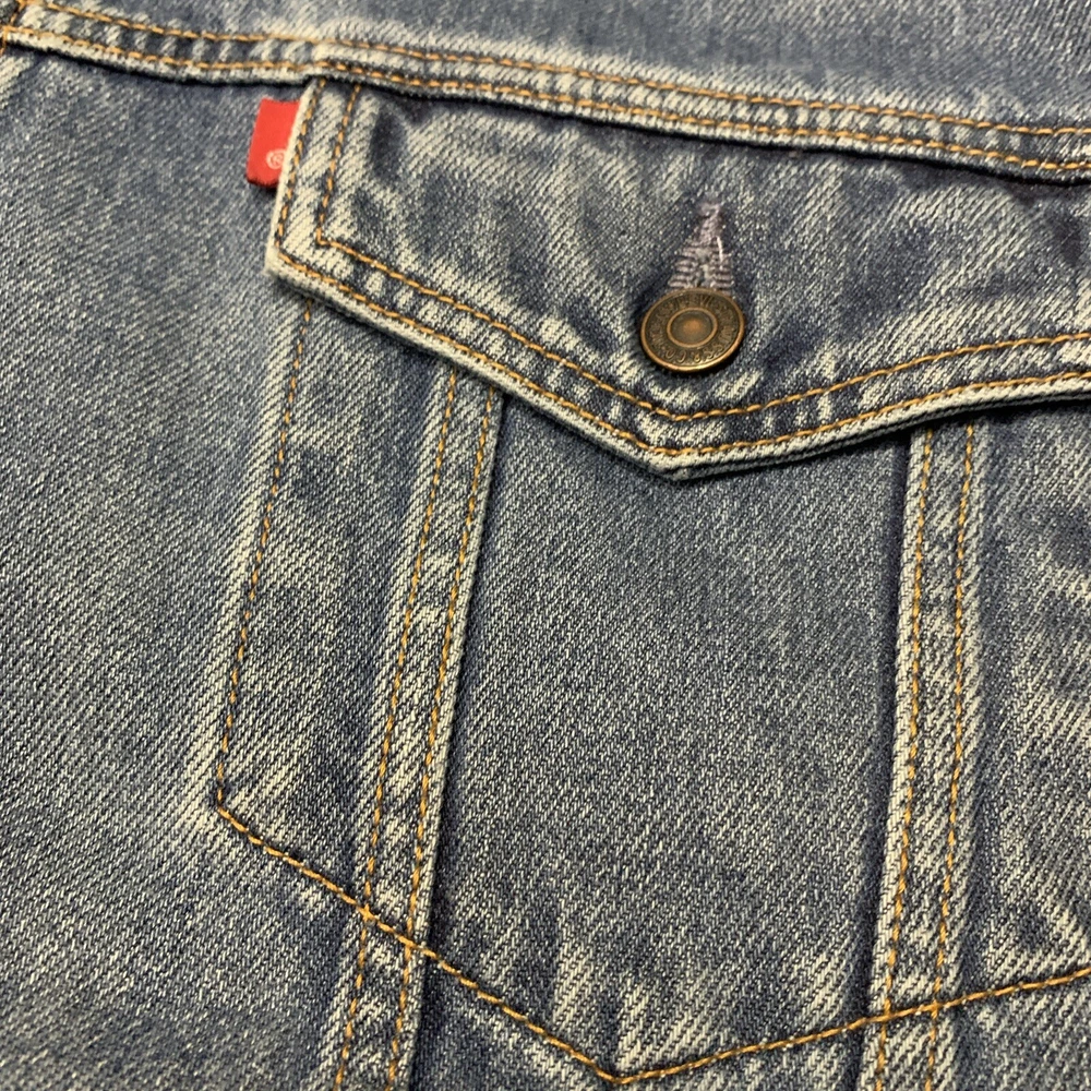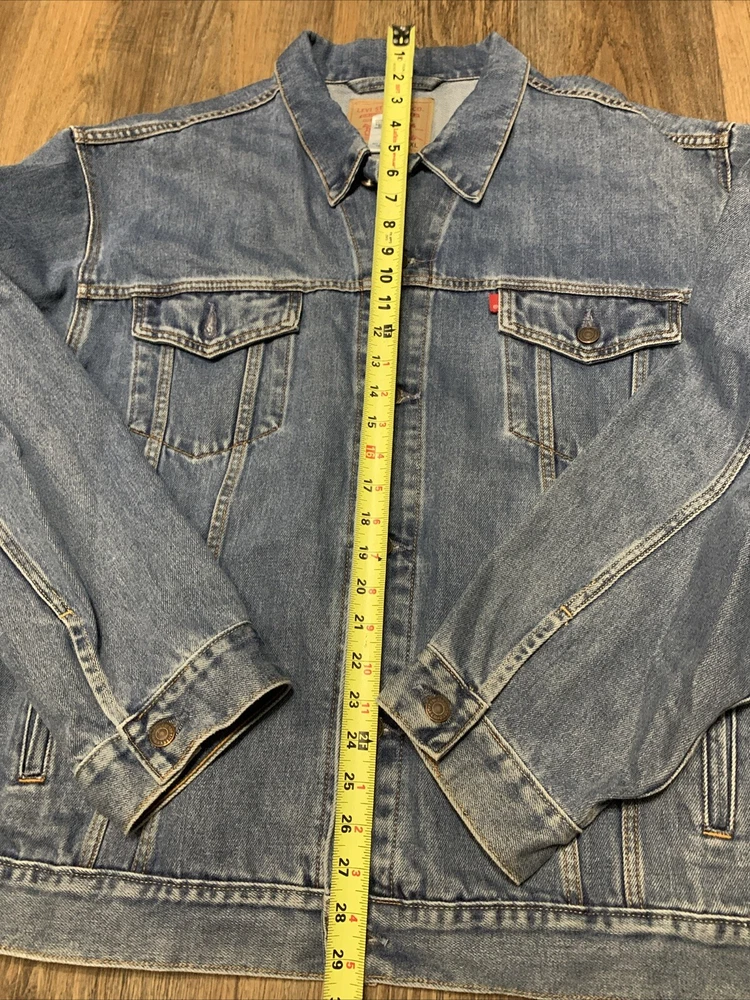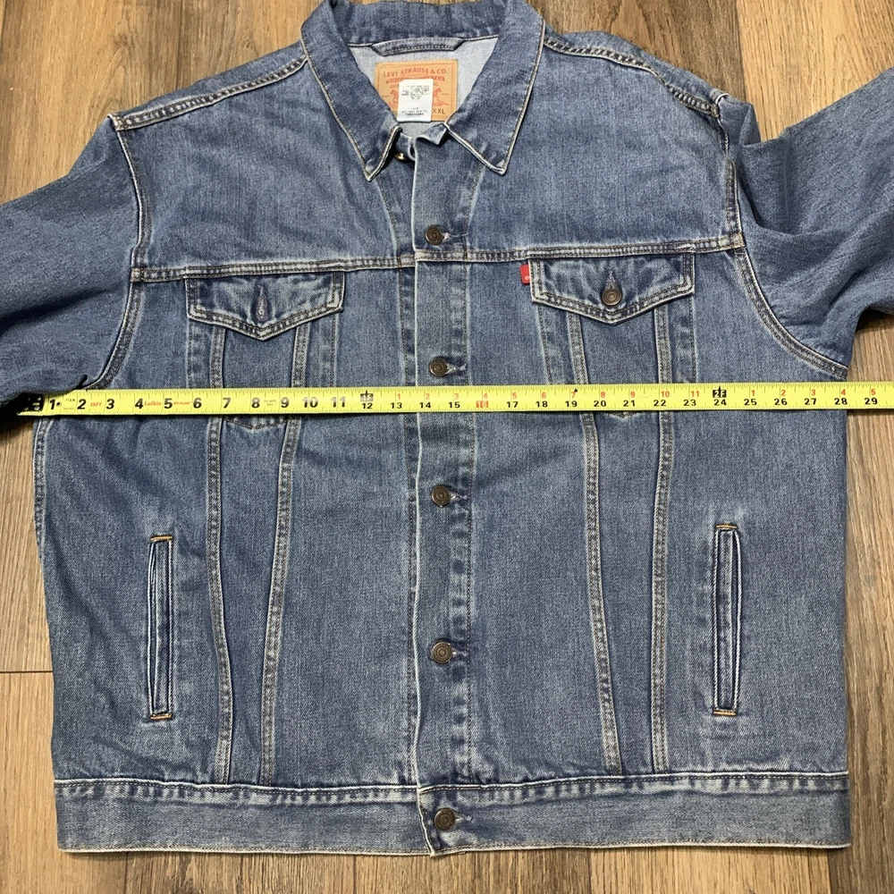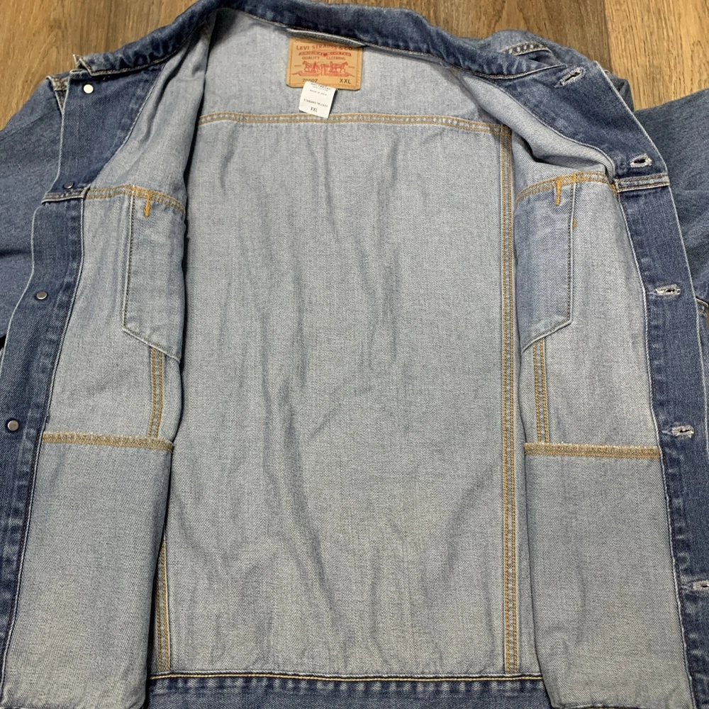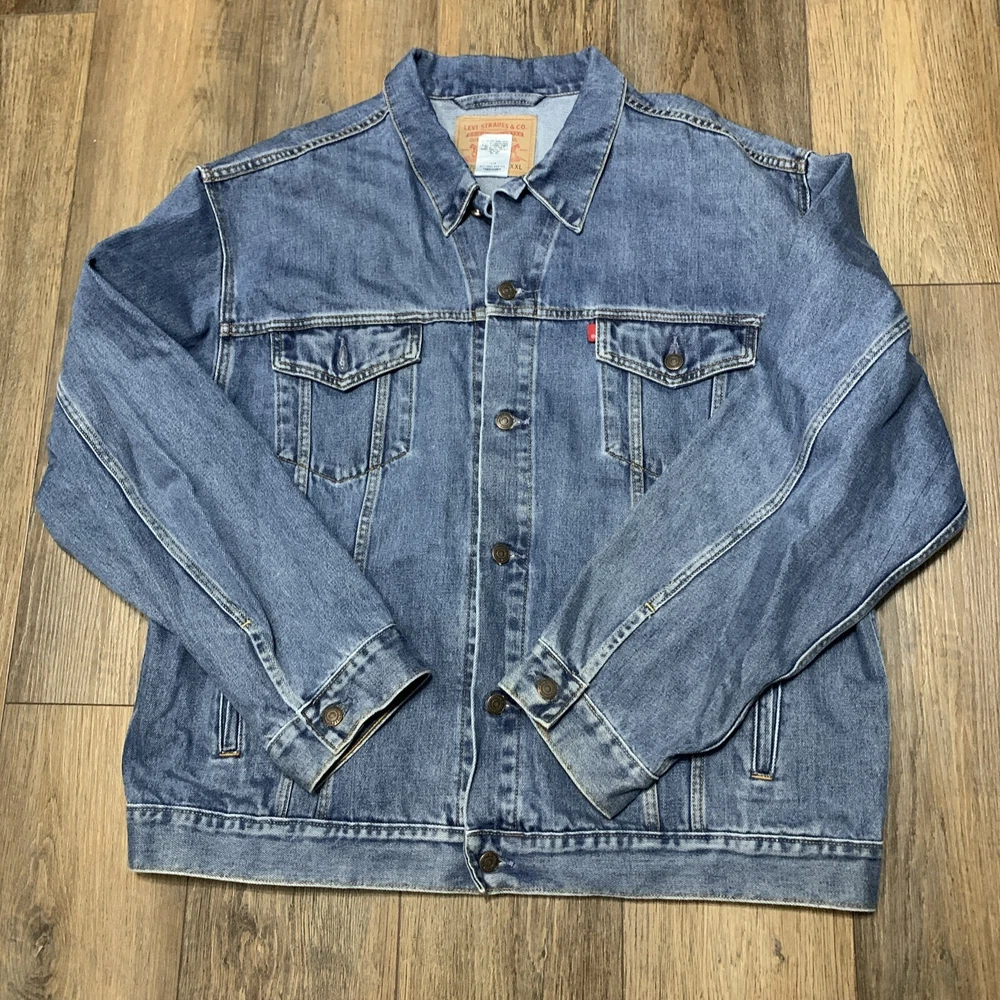Get ready to hit the road in style with this Levi's Standard Trucker Blue Jean Jacket. Made with high-quality denim fabric and lined with soft cotton, this mid-length jacket is perfect for any occasion, whether it's a casual day out or a business meeting. The jacket features a spread collar, button closure, and Levi's logo accents. This classic fit jacket is available in size 2XL and is machine washable for easy care. The vintage-inspired design of this jacket is perfect for anyone looking to add a touch of Western, Biker, or Cowboy style to their wardrobe. Whether you're a fan of outdoor activities or just looking for a stylish and comfortable jacket, this Levi's Trucker is the perfect choice.
