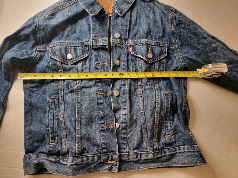This Levi's Strauss Jean Button Jacket for women is a must-have addition to your wardrobe. The jacket is made of a cotton blend denim fabric that is both comfortable and durable. It features a solid blue pattern and a biker style that is perfect for casual and workwear occasions. The jacket has long sleeves, a button closure, and Levi's logo accents. It also has pockets to keep your essentials close by. The jacket is machine washable and comes in size medium. It is suitable for fall and spring seasons. Please refer to the photos for the jacket/coat length. This Levi's Trucker jacket is not only fashionable but also practical. So, add this USA-themed jacket to your collection today!