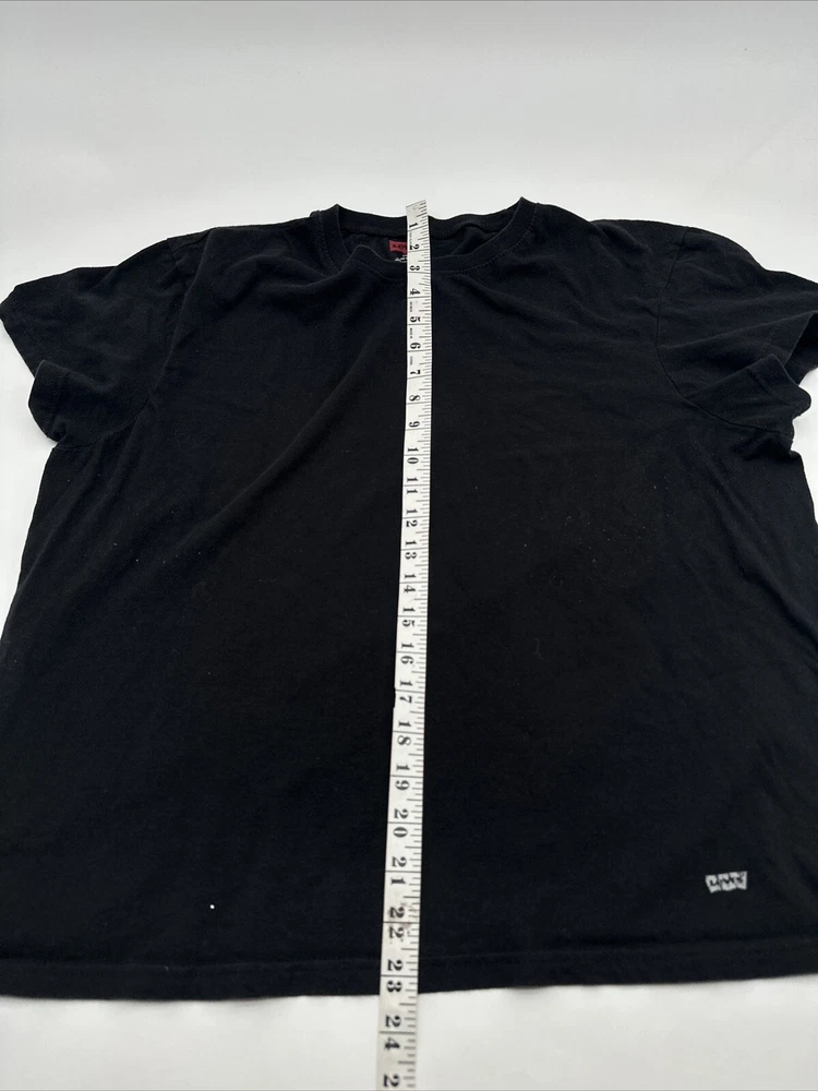 This Levi's T-Shirt is a classic designer piece for men in size Large. Made with 100% cotton material, it features a solid black color with a logo accent on the chest. The shirt has a regular fit and short sleeves, with a round neckline. It is perfect for everyday wear and can be paired with any outfit. The shirt is made in India and is of high quality. Check pictures for flaws and measurements