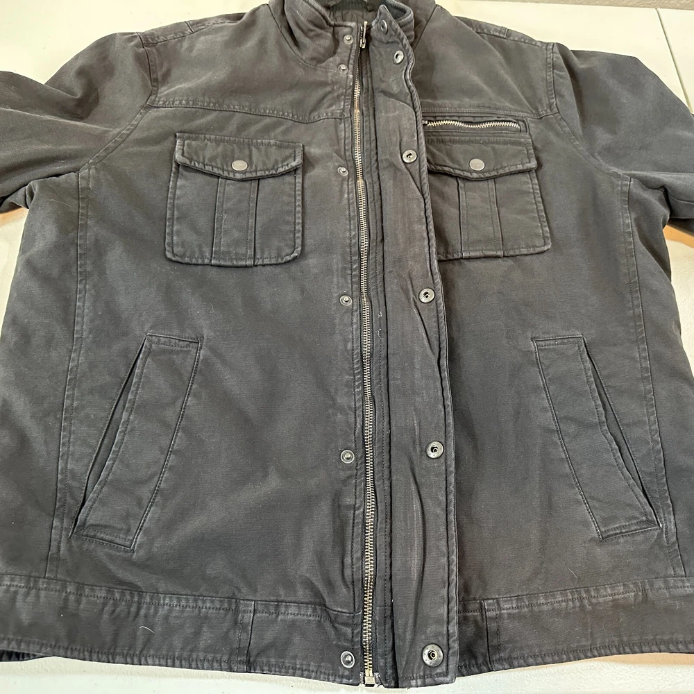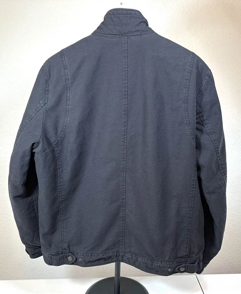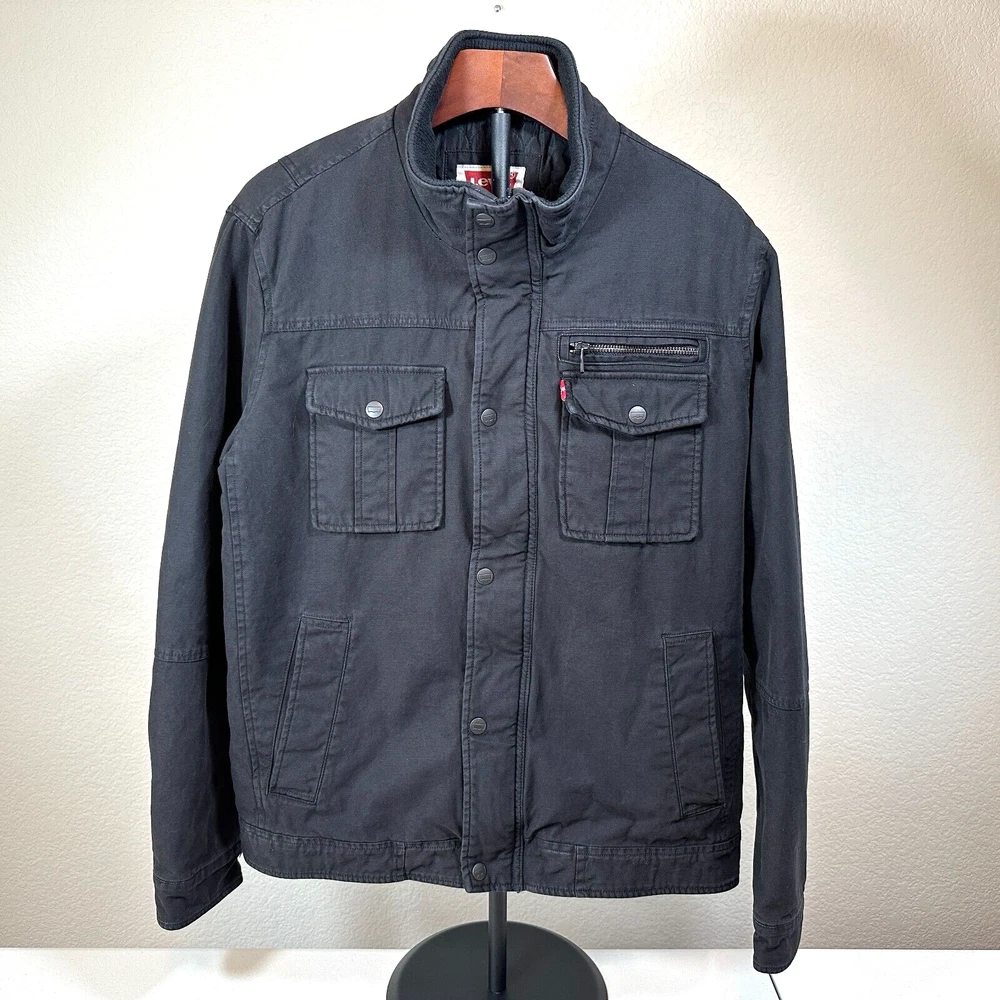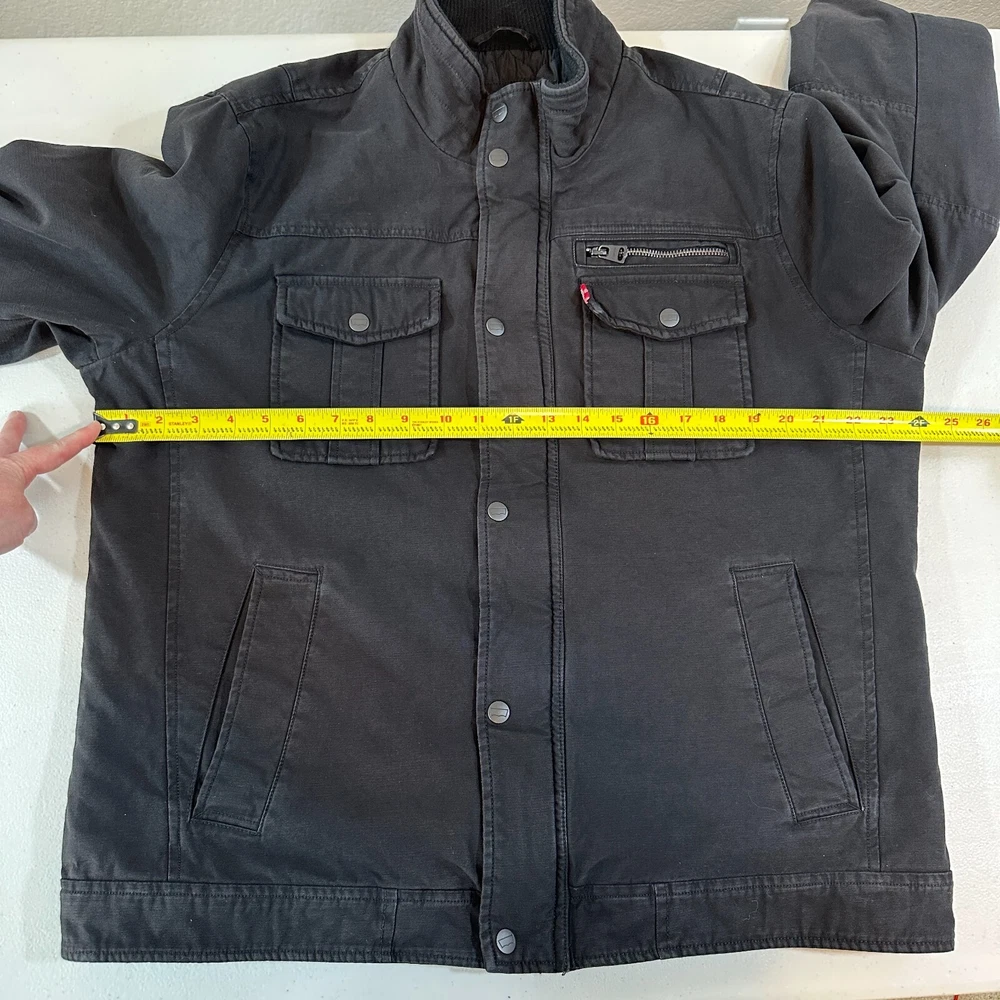 Levi's Trucker Jacket 5 Pocket Black Chore Barn Coat Fall Christmas Men's Size Large Approximate Measurements (inches): Length: 27" Pit to Pit: 24" Sleeve: 26" Shoulder: 18.5" Cuff: 4.75" - 5.5" 100% Cotton shell 100% Polyester lining & filler Machine Washable This jacket is medium to heavy weight, weighing ~2 lbs 8oz itself. Features: - 5 outer pockets; 1 zippered chest pocket, 2 snap closure chest pockets & 2 slip side pockets. - 1 interior chest pocket, left side. - Full zip closure w/ additional snap closure. - Quilted liner Pre-loved & in great condition! Some minimal wear on surface of zipper pull. See photos for close ups & measurements. Freshly laundered & ready to ship!