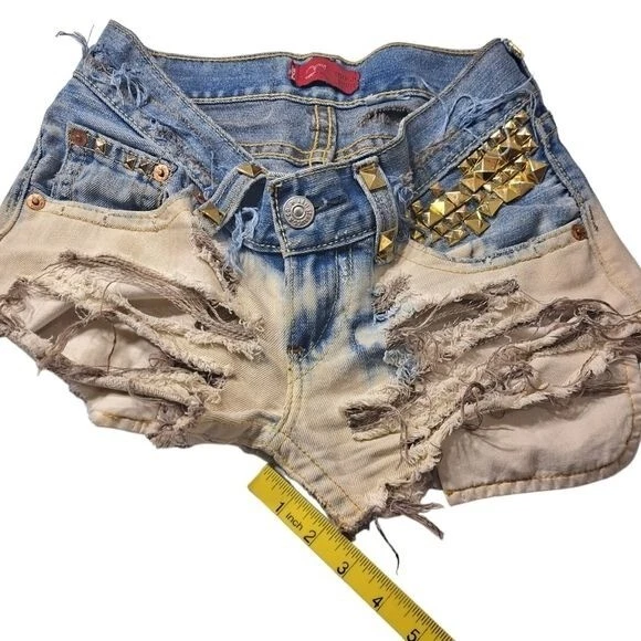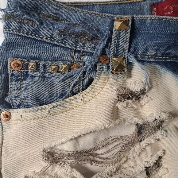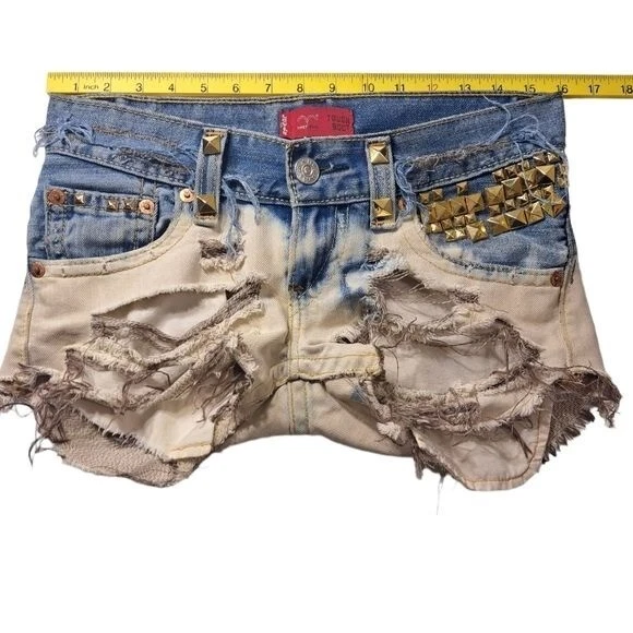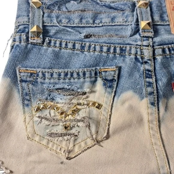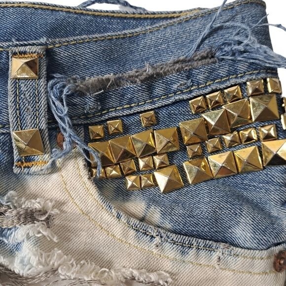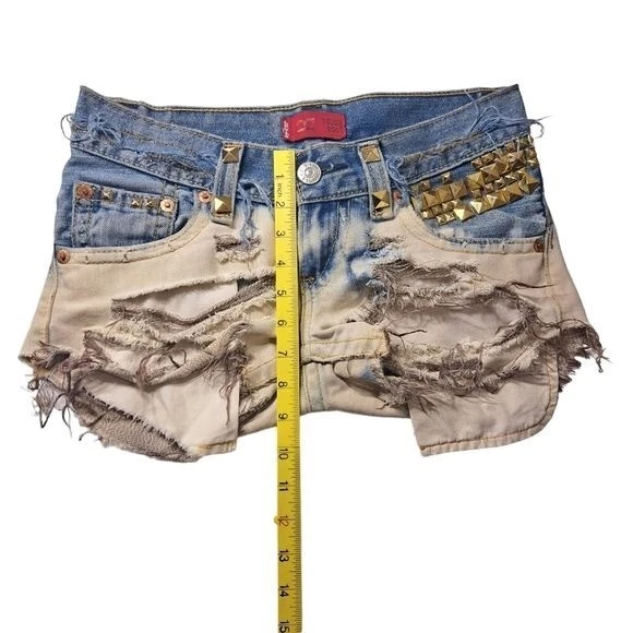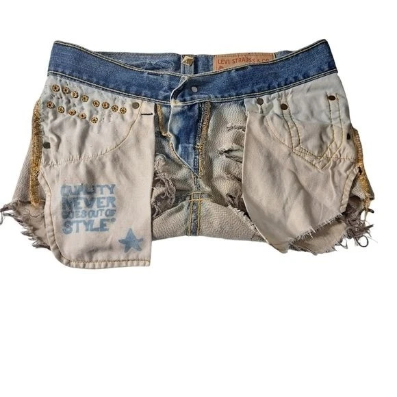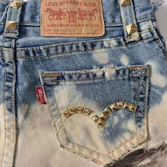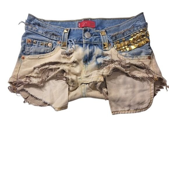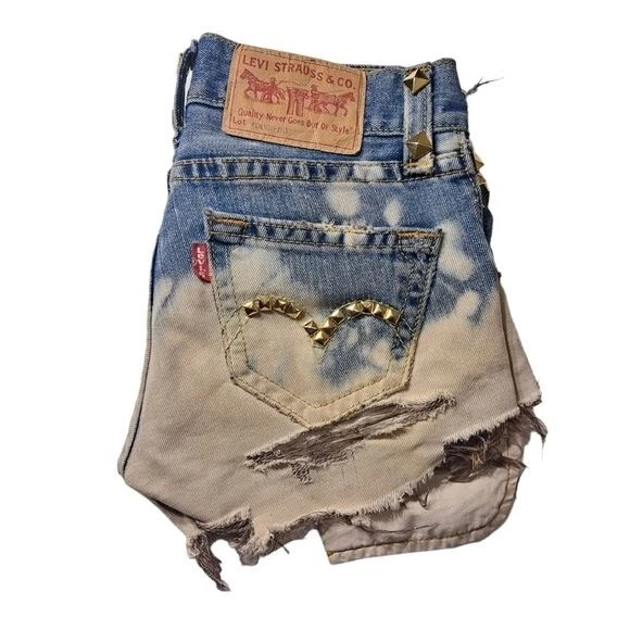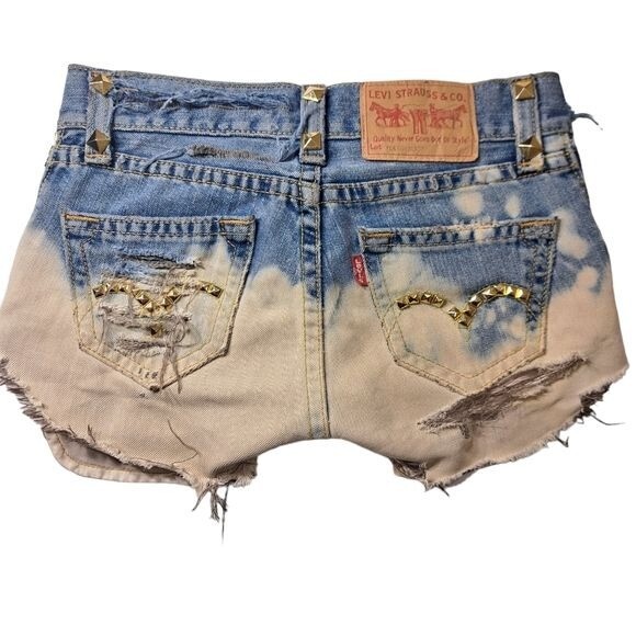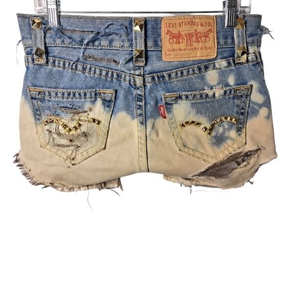 *Levis Women's Distressed Bleach Dyed Studded Denim Jeans Cut Off Shorts Size 9 *Brand - Levis *Women's Distressed Bleach Dyed Studded Denim Jeans Cut Off Shorts *Size - 9 *Color - Blue & Beige *Condition - Excellent (pre-owned) *Please see all the photos in Zoom to appreciate the details. (Check for all the sizes on some of the pictures from above because these shorts don't have the tag with the size on it) (There's some studs that could be possibly missing) (Please check the 16th photo to see that left bag is complete & the right bag is a bit ripped.) *Smoke Free Home *I described this product the best way possible. *If you have any questions, please let me know. Thank you.