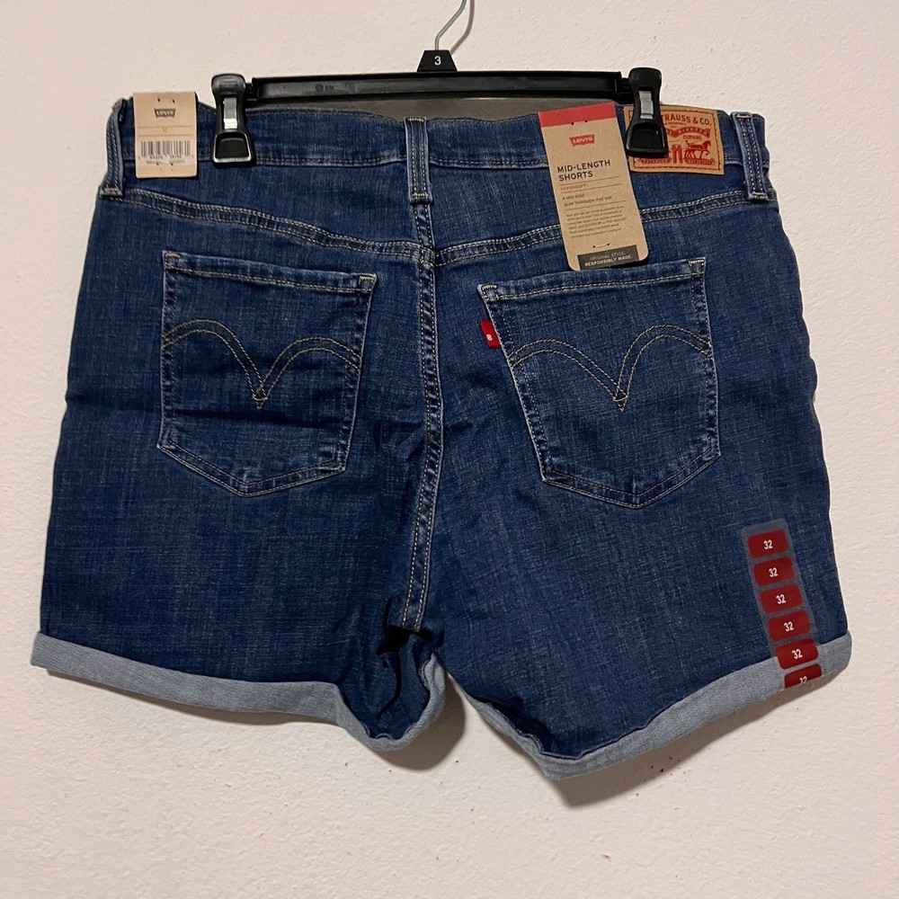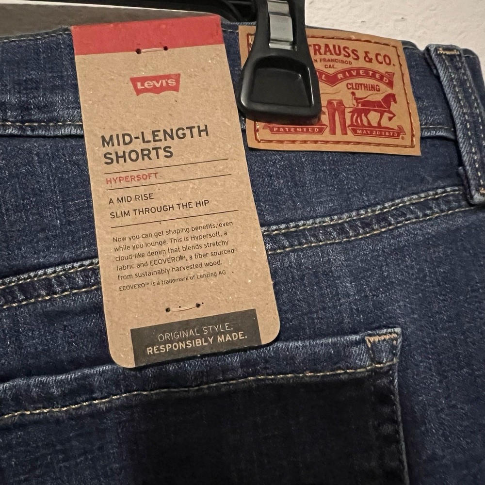 Brand new Levi’s Mid-Length denim shorts in size 32. Feature a mid-rise fit, slim through the hip, and cuffed hem. Made with Hypersoft fabric for extra comfort, blending stretchy material with ECOVERO™, a sustainable fiber. Classic Levi’s back patch and red tab detail. Tags still attached.
