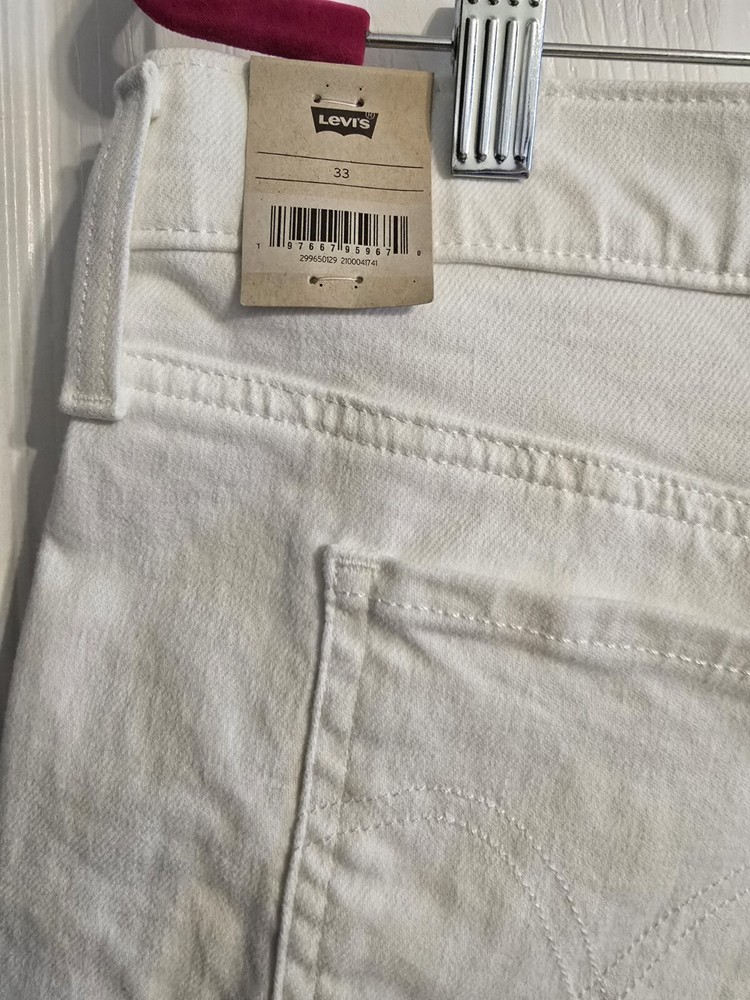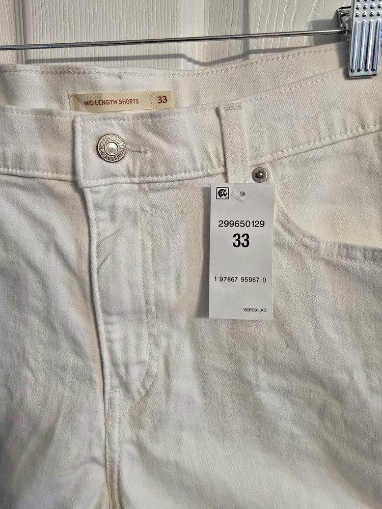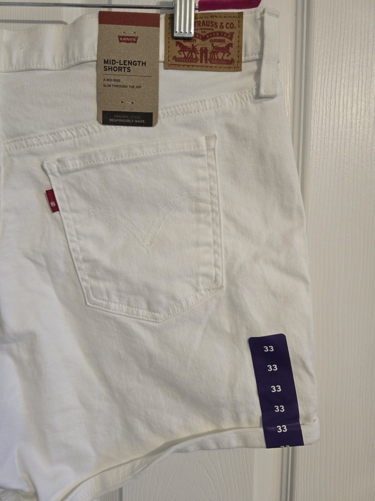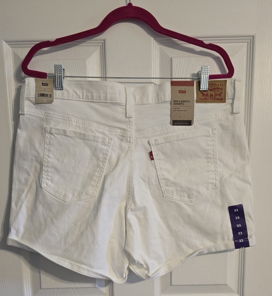 Elevate your casual style with these classic and modern Levi's mid-length shorts in a chalk white hue. These jean shorts are perfect for walking, hiking, or any casual occasion. Made with 97% cotton and 3% elastane, these shorts are machine washable and easy to care for. Featuring a solid pattern, zip closure, and a 5-pocket design, these shorts are a versatile addition to your wardrobe. The mid-rise and regular fit provide comfort and style, while the light fabric wash adds a touch of vintage charm. Whether you're traveling or just lounging around, these Levi's women's shorts are a must-have for the summer, fall, or spring seasons.