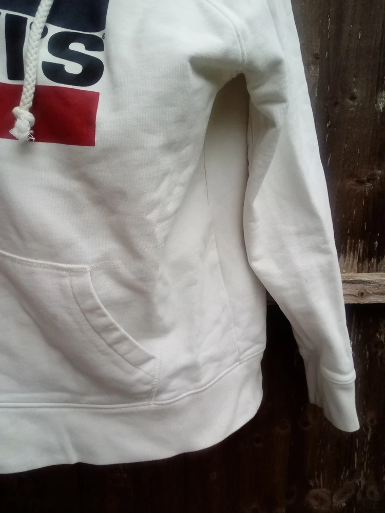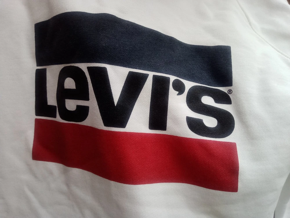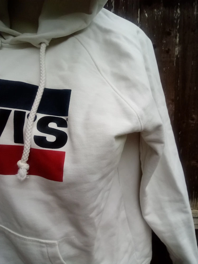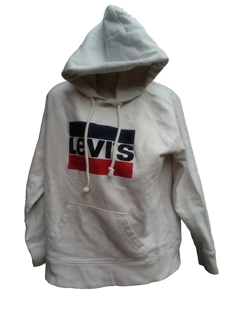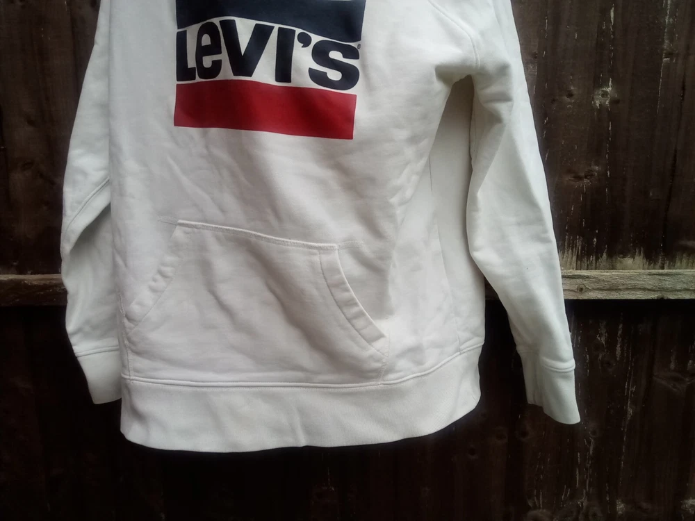 Levi's women's graphic print hoodie UK M White with logo to chest and sleeve Drawstring neckline Elastic cuffs Kangaroo pocket 21'' pit to pit 23'' from neck to bottom hem In very good used condition, light wear Has a few storage marks (will wash out)