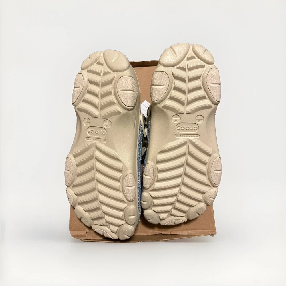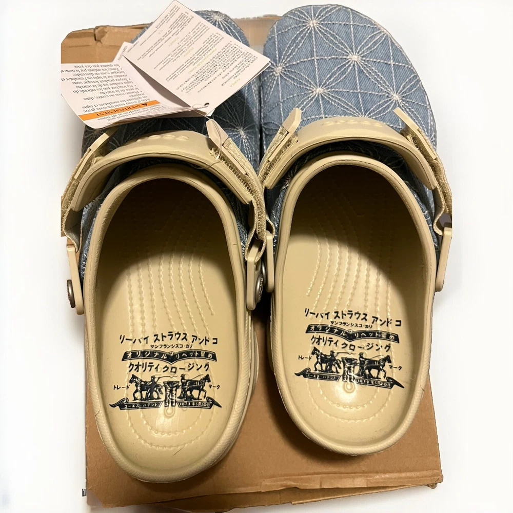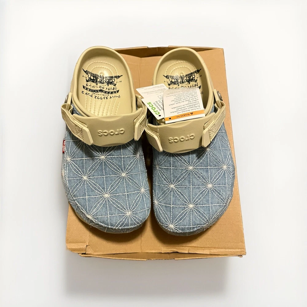 Step into comfort and style with the Levi's x Crocs Classic All-Terrain Clog in Sashiko Light Wash. This limited edition collaboration blends the iconic Crocs design with a fresh, colorful theme, featuring a classic check pattern and the timeless Levi's logo. Perfect for those who value both comfort and style, the clog's lightweight construction and cushioned insole make them ideal for any activity, from walking to gym training. Crafted with a durable rubber upper and designed for year-round wear, these clogs boast a low-top shaft for a casual fit and are equipped with an ankle strap to secure your feet. The versatile blue hue complements a range of outfits, making them a smart addition to any casual ensemble. Whether you're headed to school or enjoying the outdoors, these size 9 Crocs offer a fusion of functionality and fashion. Damaged Box but contains all 3 Jibbitz and wrapping paper inside.