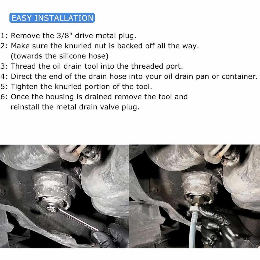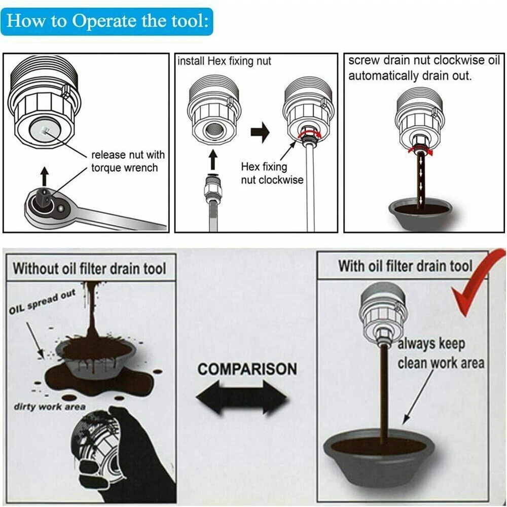 Features: 1. FUNCTION: This tool fits Toyota 2.0L to 5.7L engines that use the cartridge style oil filter system. It makes the oil change process much cleaner by draining the filter housing prior to removal preventing oil spills. 2. FITMENT: Works on many late model Sienna, Tundra, Highlander, Camry, RAV4, Tacoma, Sequoia, Avalon, Corolla, FJ Cruiser and Venza Toyota vehicles. 3. SIMPLE TO USE: Simply screw the tool into the drain valve on the oil filter housing, and then tighten the knurled nut to drain the housing. Once the housing is drained it can be removed to replace the filter without the usual mess. 4. FEATURE: The 3 piece all metal body connects to a 30" long drain hose that allows you to direct the oil into your oil disposal container. Application: For Lexus, Toyota, Scion 2.0L-5.7L engines that use the cartridge style oil filter system. Benefits: This is the cleanest way to drain the oil filter This tool makes oil changes so much easier Replace the filter without the usual mess Specification: Body Material: Heavy duty nylon Vehicle Connection: Threaded Hose Material: PVC hose Seal: O-ring How It Works: Step 1: Remove the 3/8" drive metal plug from the bottom of the oil filter housing to expose the drain valve. Step 2: Make sure the knurled nut is backed off all the way (towards the silicone hose) Step 3: Thread the oil drain tool into the threaded port that was exposed by removing the plug. Step 4: Direct the end of the drain hose into your oil drain pan or container. Step 5: Tighten the knurled portion of the tool which activates the spring loaded valve inside the oil filter housing. Step 6: Once the housing is drained remove the tool and reinstall the metal drain valve plug. Package Including: 1 x Oil Filter Drain Hose Tool