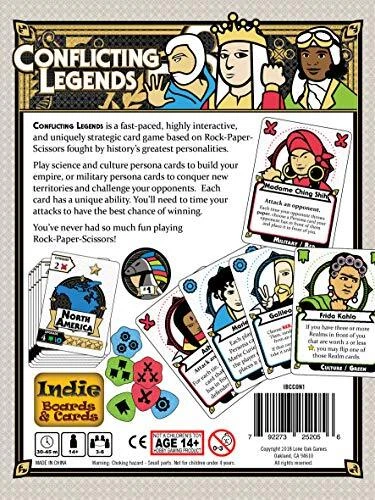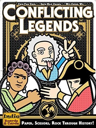 Conflicting Legends is a fast-paced, highly interactive, and uniquely strategic card game based on rock-paper-scissors fought by history's greatest personalities. Play science and culture persona cards to build your empire, or military persona cards to conquer New territories and challenge your opponents. Each card has a unique ability. You'll need to time your attacks to have the best chance of winning. You've never had so much fun playing rock-paper-scissors! 3 to 6 players Humorous take on historical figures Hand management
