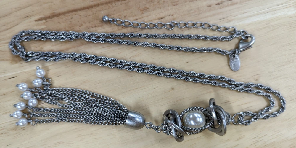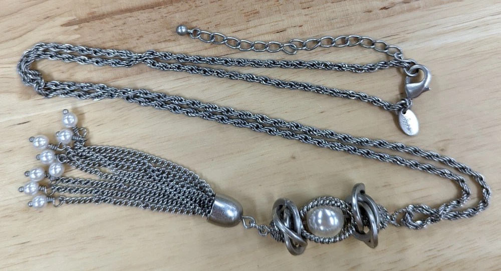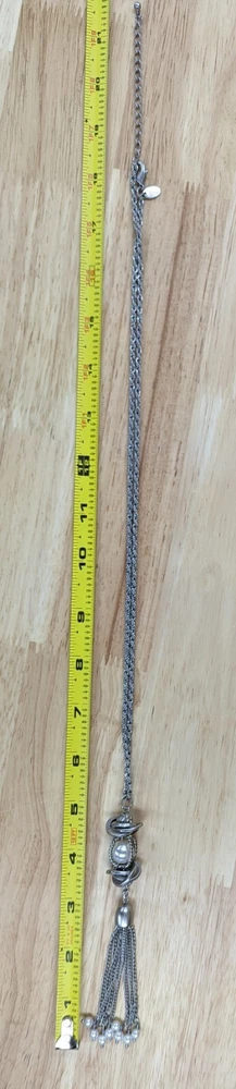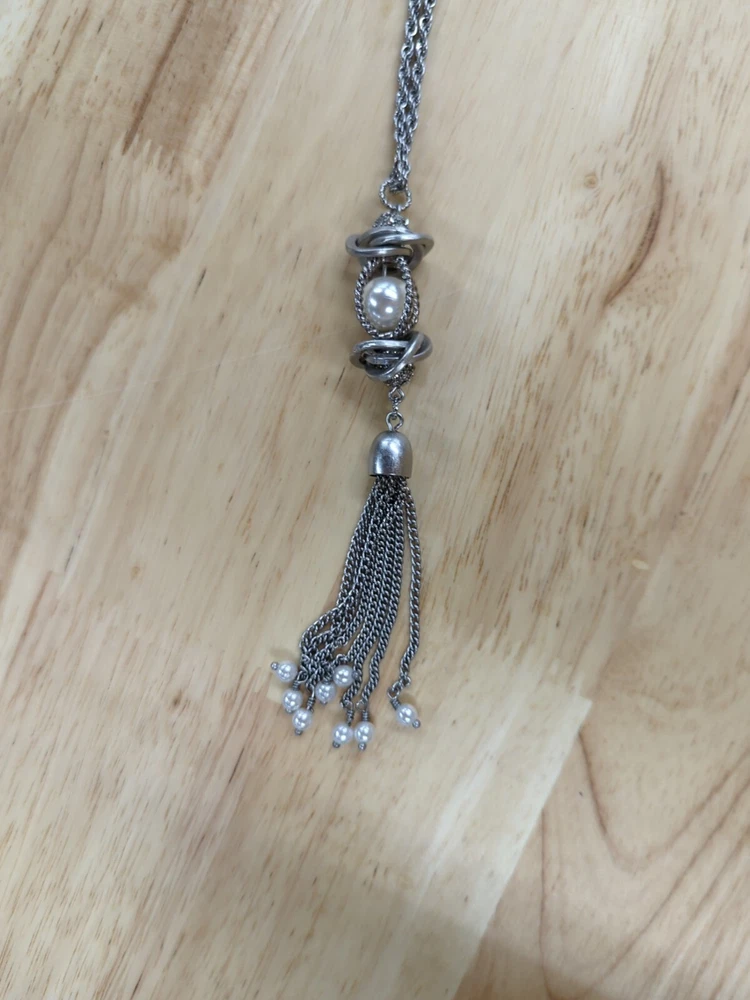 This is a Lia Sophia Charleston necklace with a tassel pendant made of faux pearls, crystals, and resin beads. The necklace is 18 inches long with a 3 inch extender and has a chain style. The main stone color is white and the necklace is silver in color. It is a beautiful piece of fashion jewelry that would make a great addition to any jewelry collection. From a smoke-free and pet-free house.